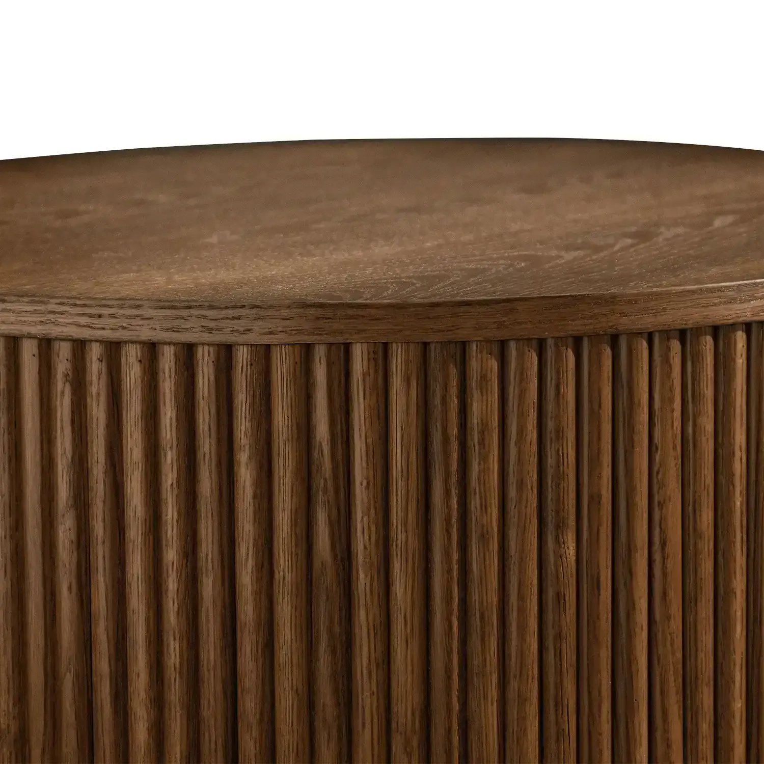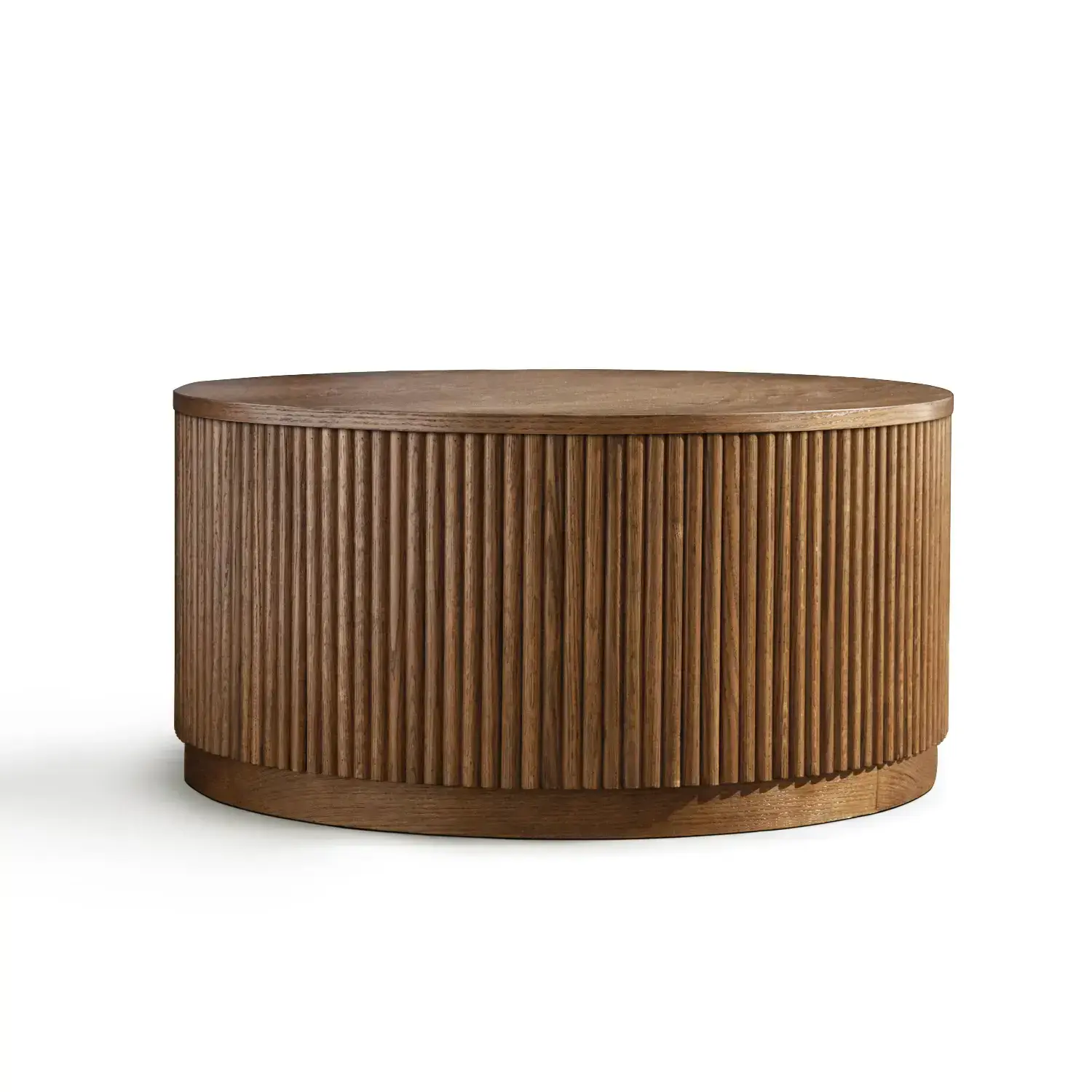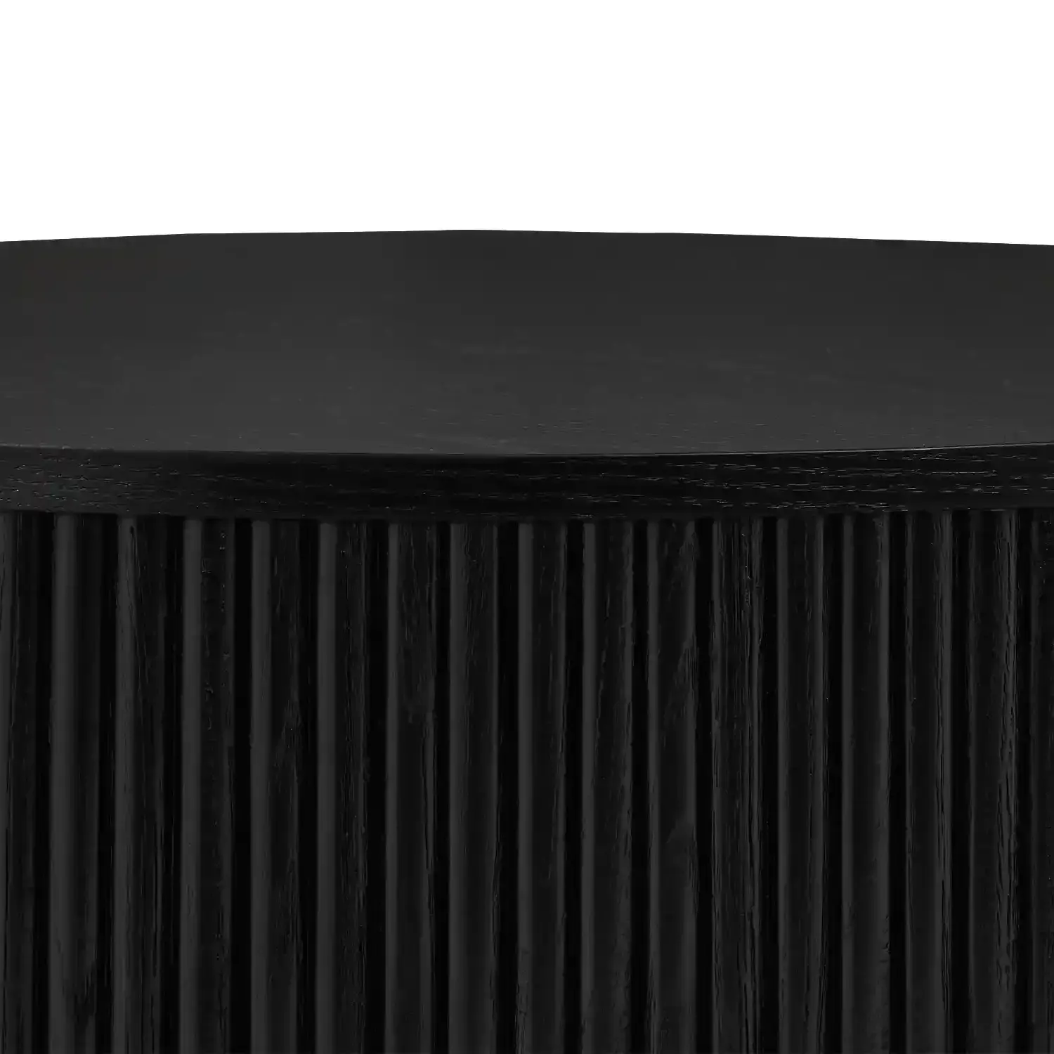 The Allegro Round Coffee Table brings bold elegance to your home Made with MDF red oak veneer and solid red oak wood it combines durability with a sleek modern look The deep black finish and vertical fluted detailing give it a refined sculptural presenceperfect as a statement piece in any living room.