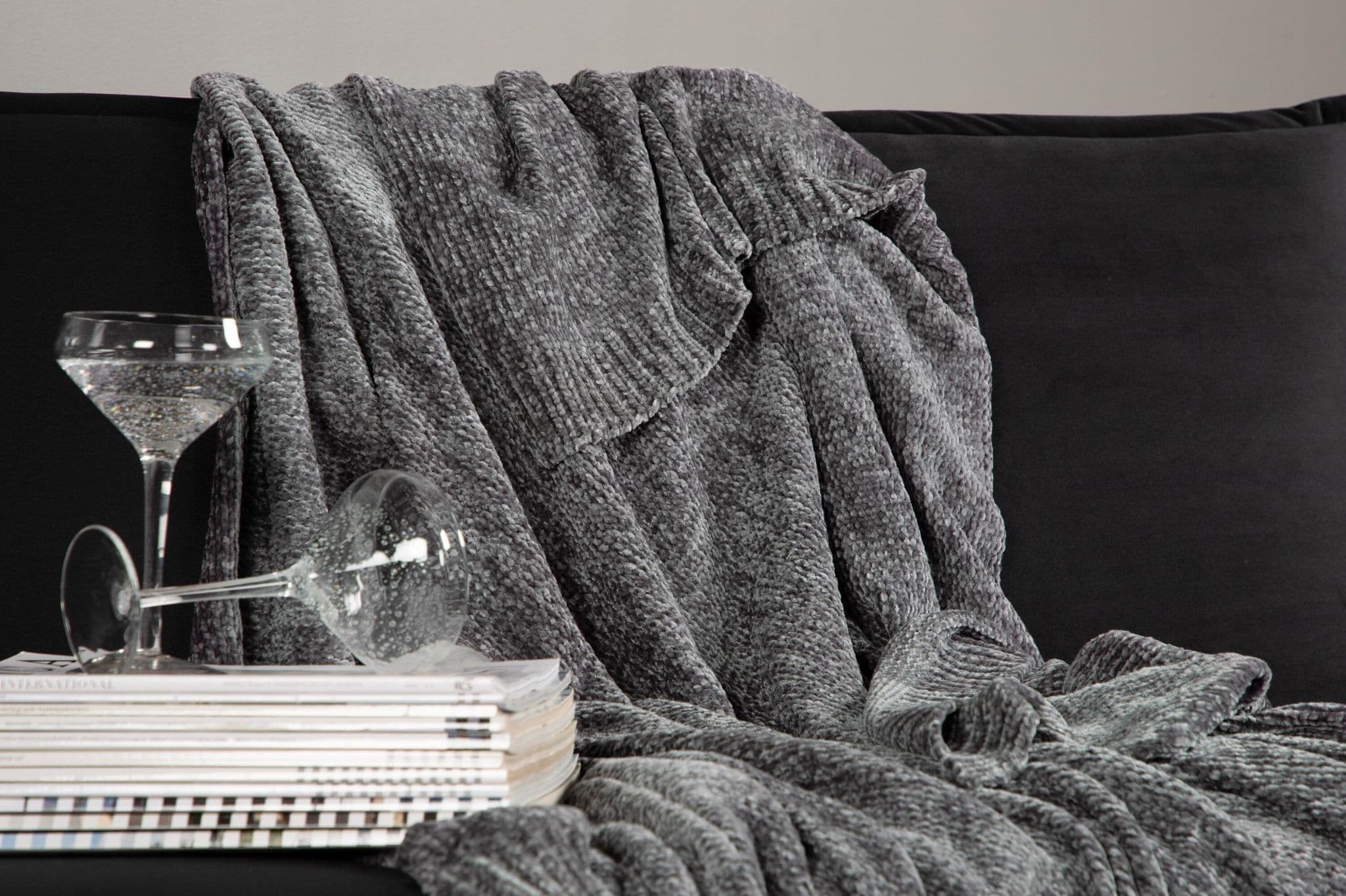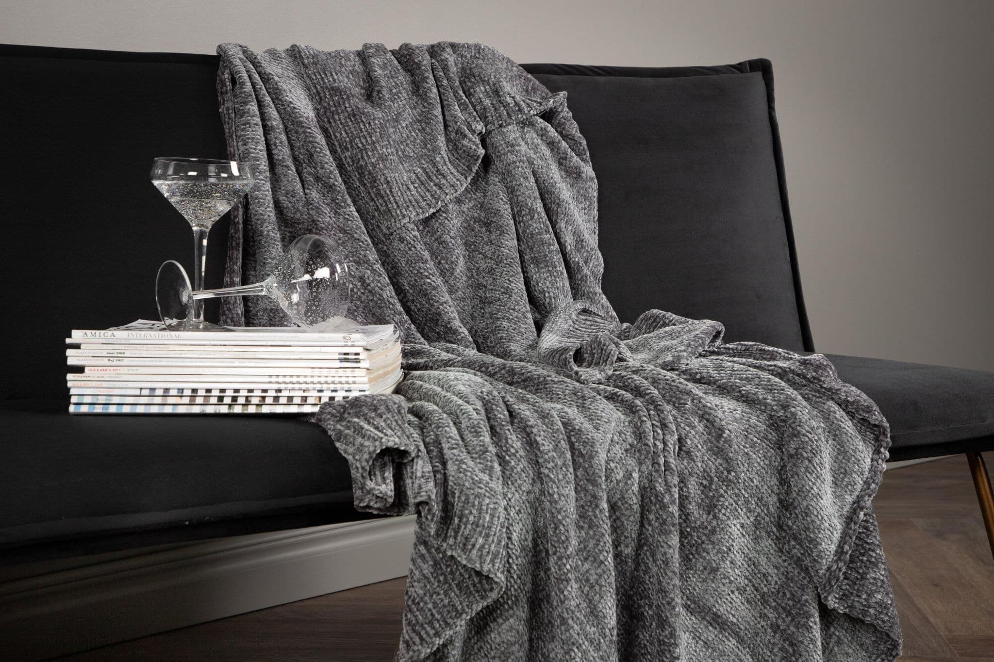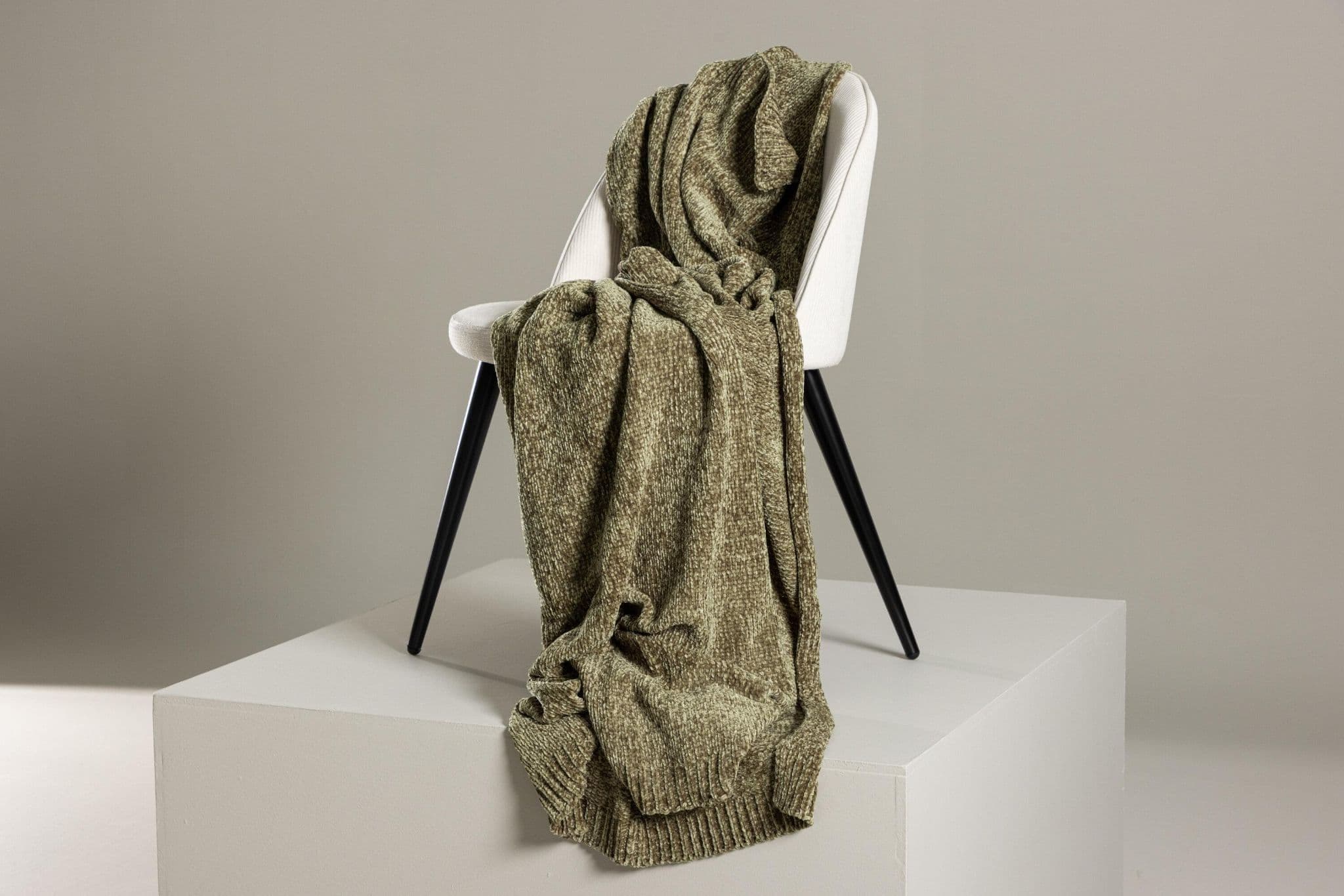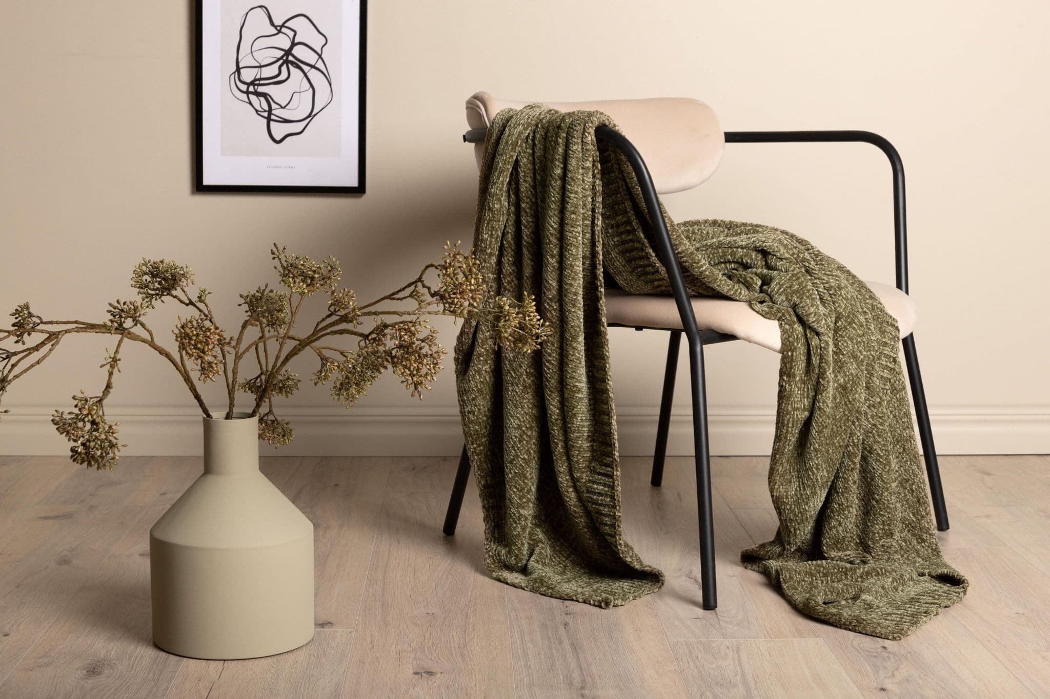 Green plaid in glossy chenille and polyester. Cozy plaid in size 130×170 cm. Care advice: Machine wash 30 C, hang dry.