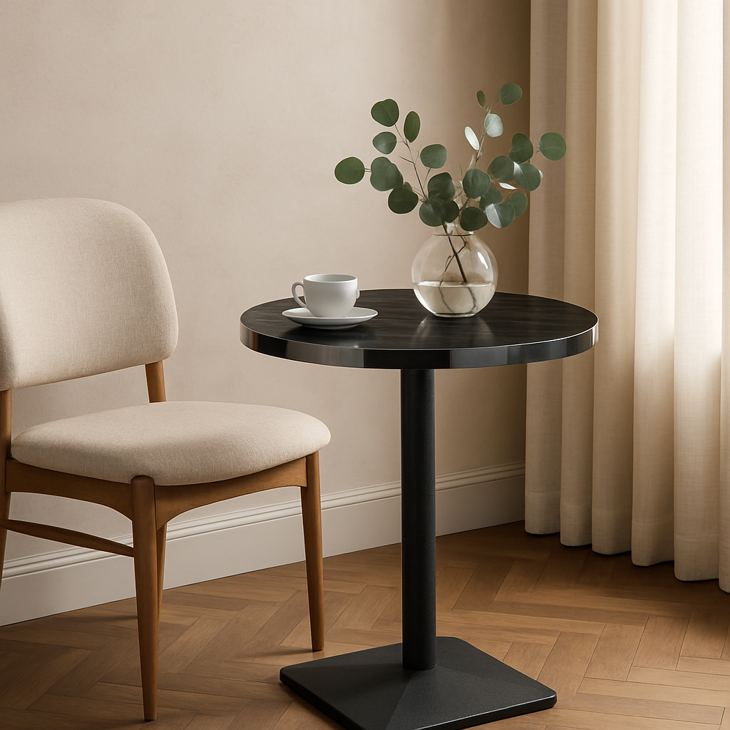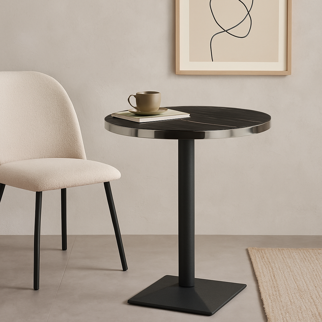The Aurora 70cm round table combines modern design with durable materials, making it ideal for cafés, restaurants, offices, and contemporary dining spaces. The MDF tabletop features a high-quality melamine surface finish that provides excellent resistance to scratches, stains, and daily wear. Supported by a strong metal pedestal base with a powder-coated finish, this table offers superior stability and long-lasting performance while maintaining a sleek and professional appearance.