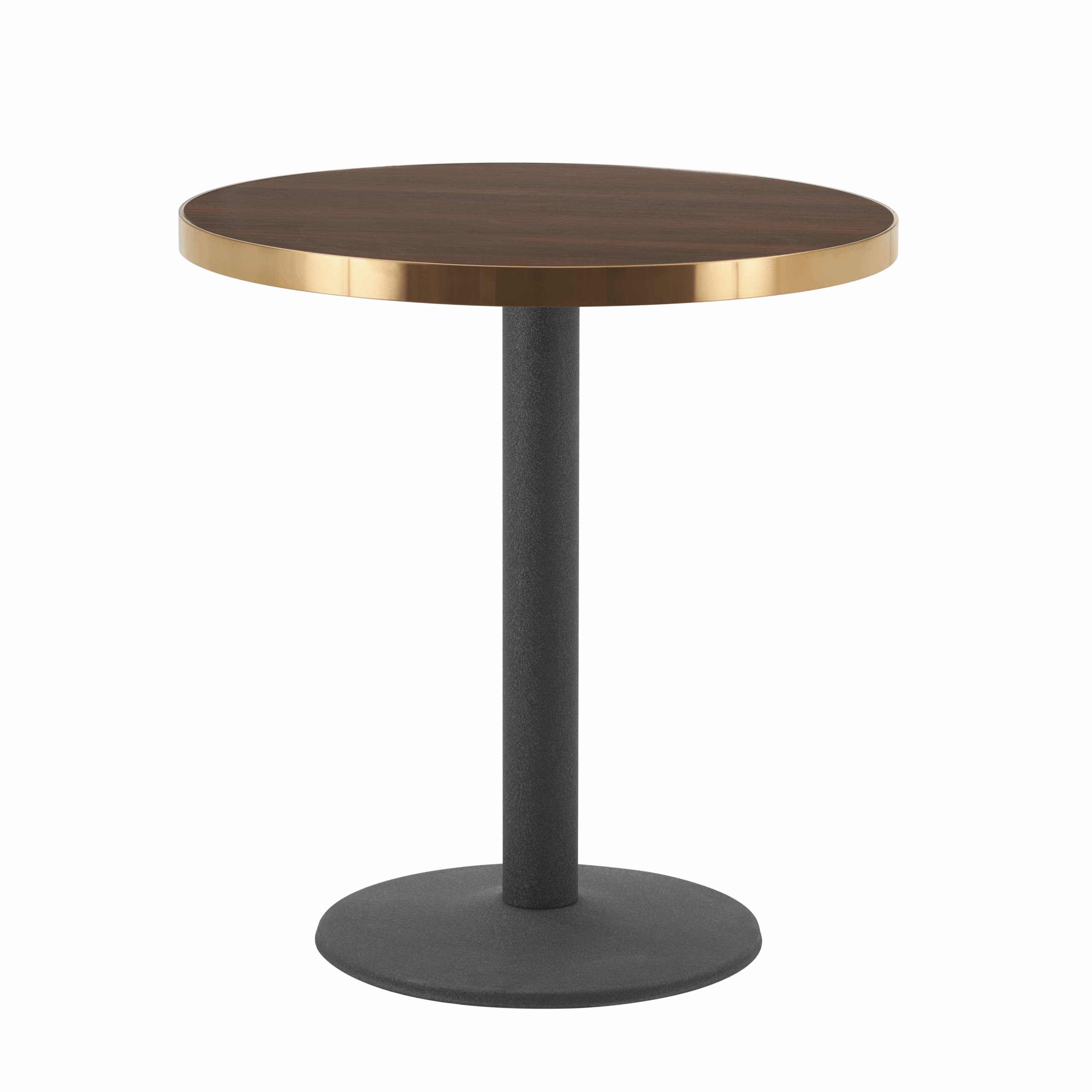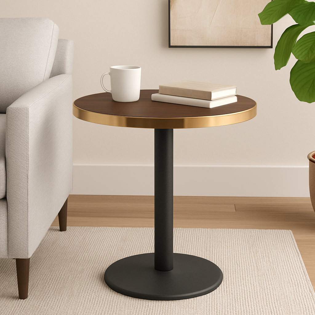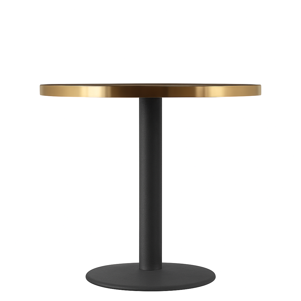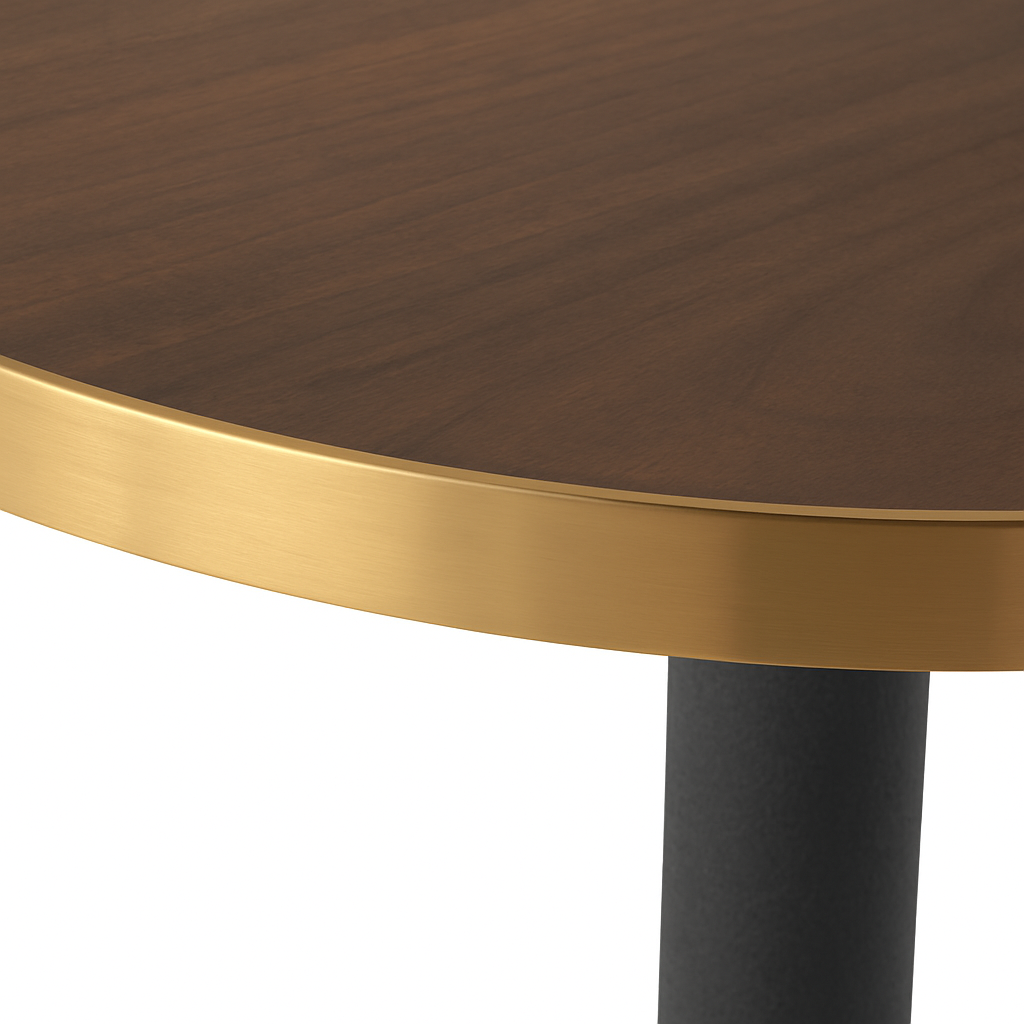 This elegant round table features a rich walnut finish complemented by a brushed gold metal edge for a sophisticated, modern look. Supported by a sturdy black pedestal base with a square foundation, this table offers excellent stability while maintaining a sleek and minimalist design. Ideal for cafés, restaurants, lounges, or contemporary office spaces, it combines durability with refined style.