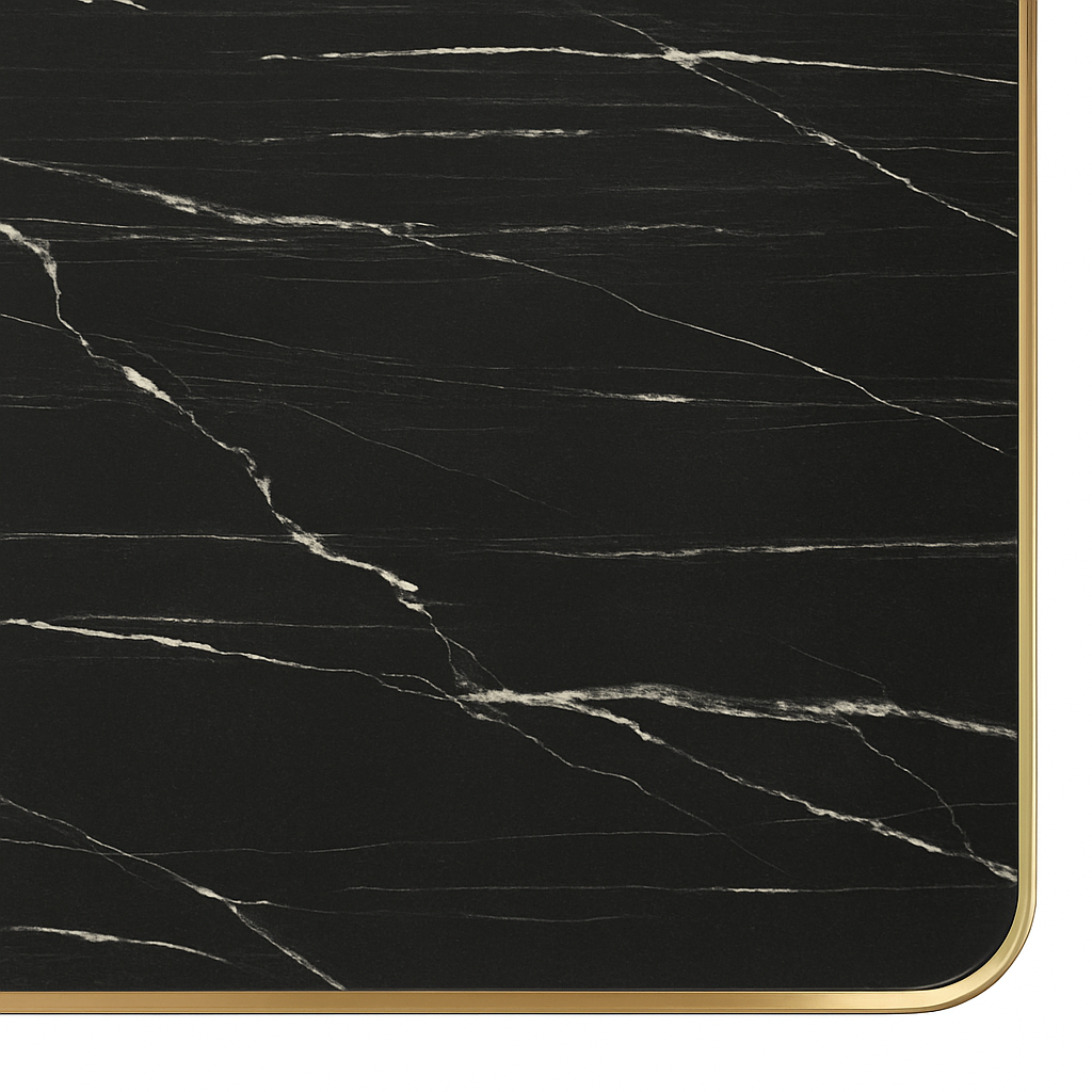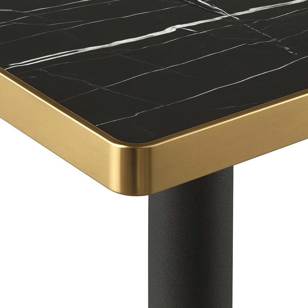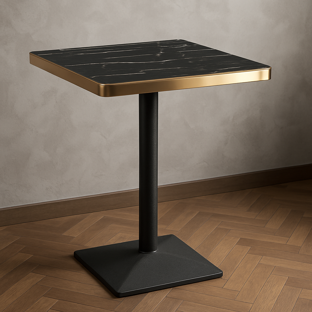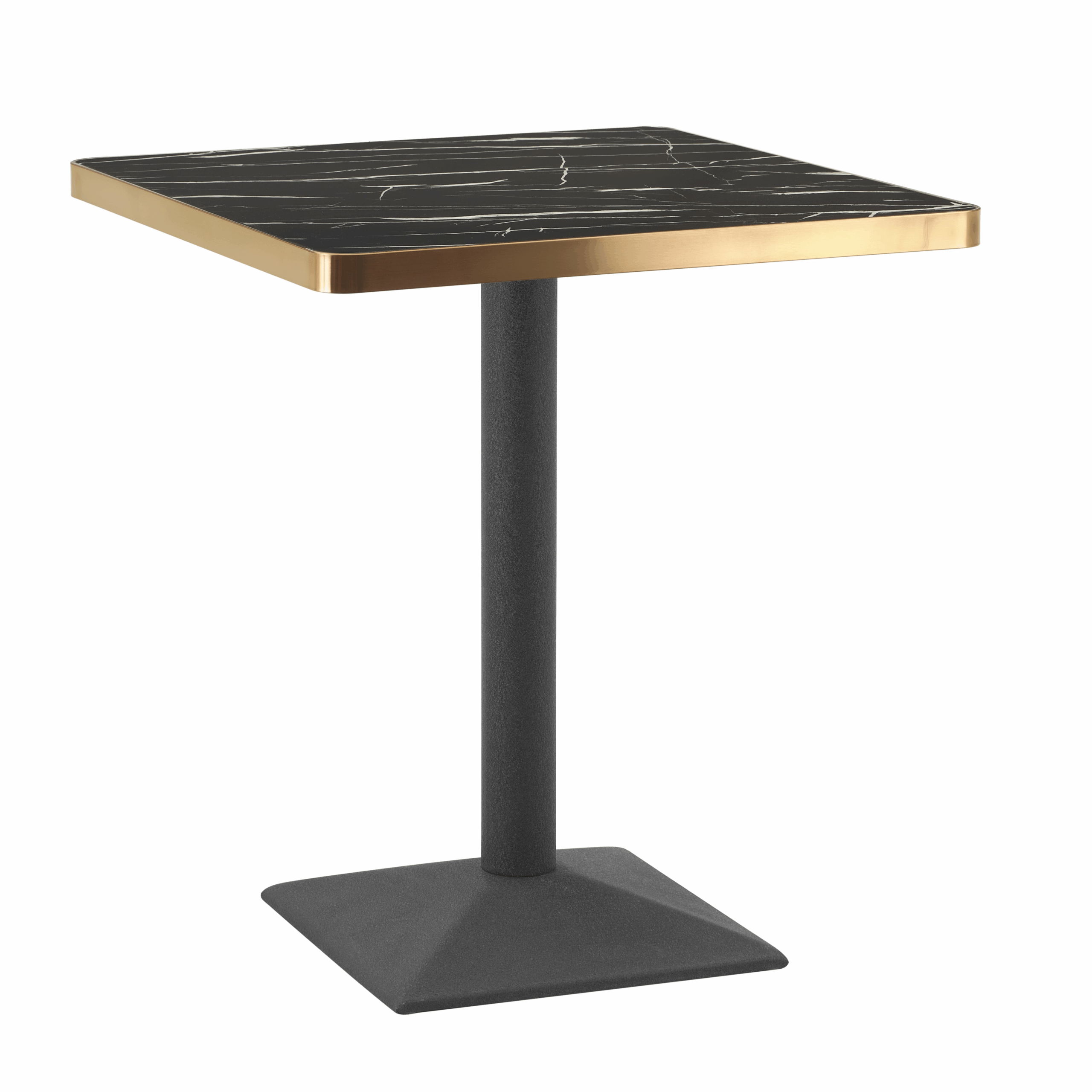 Aurora 70cm Squared Black Marble Effect Bistro Table – Brushed Gold Edge with Square Pedestal Base