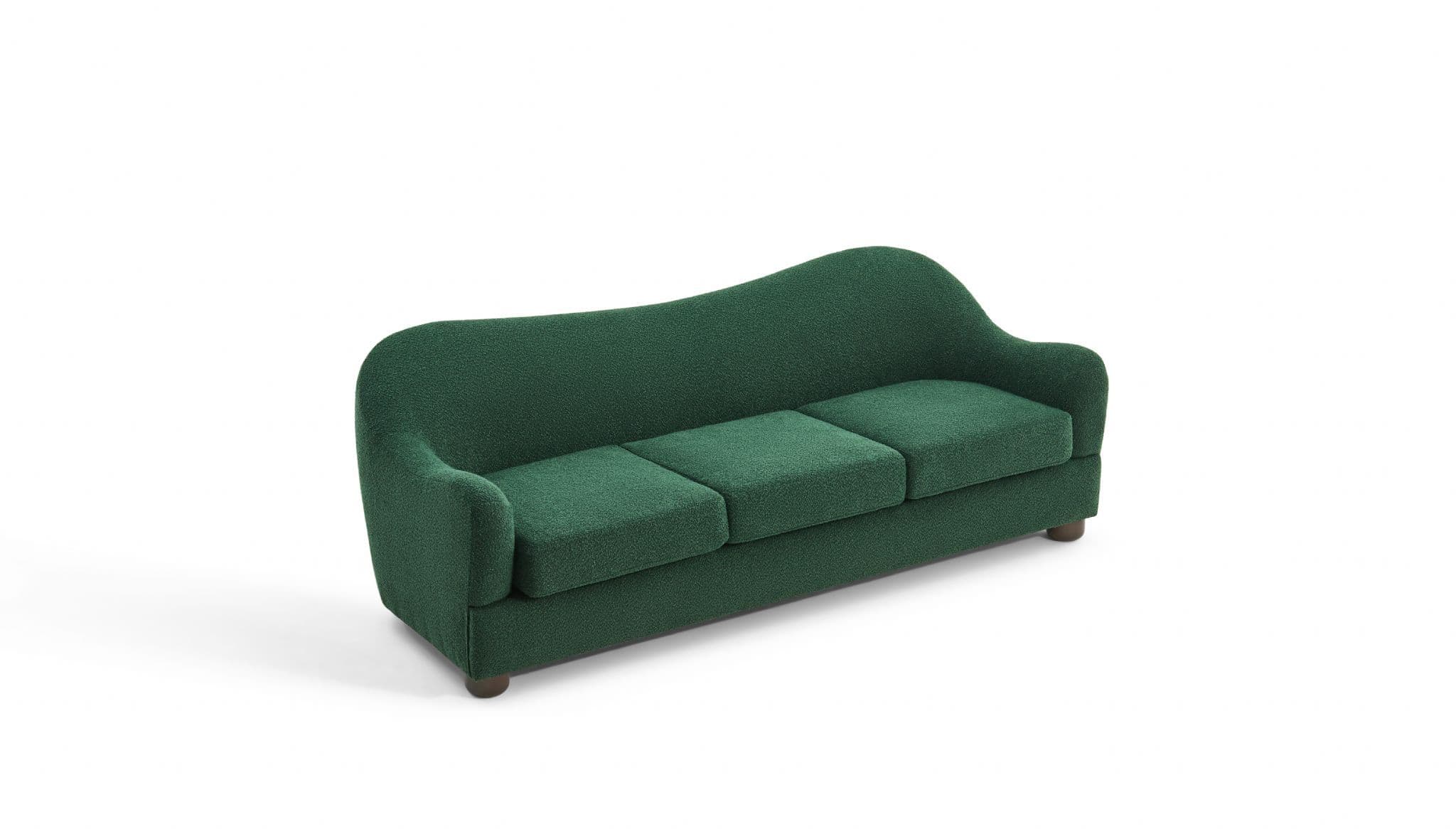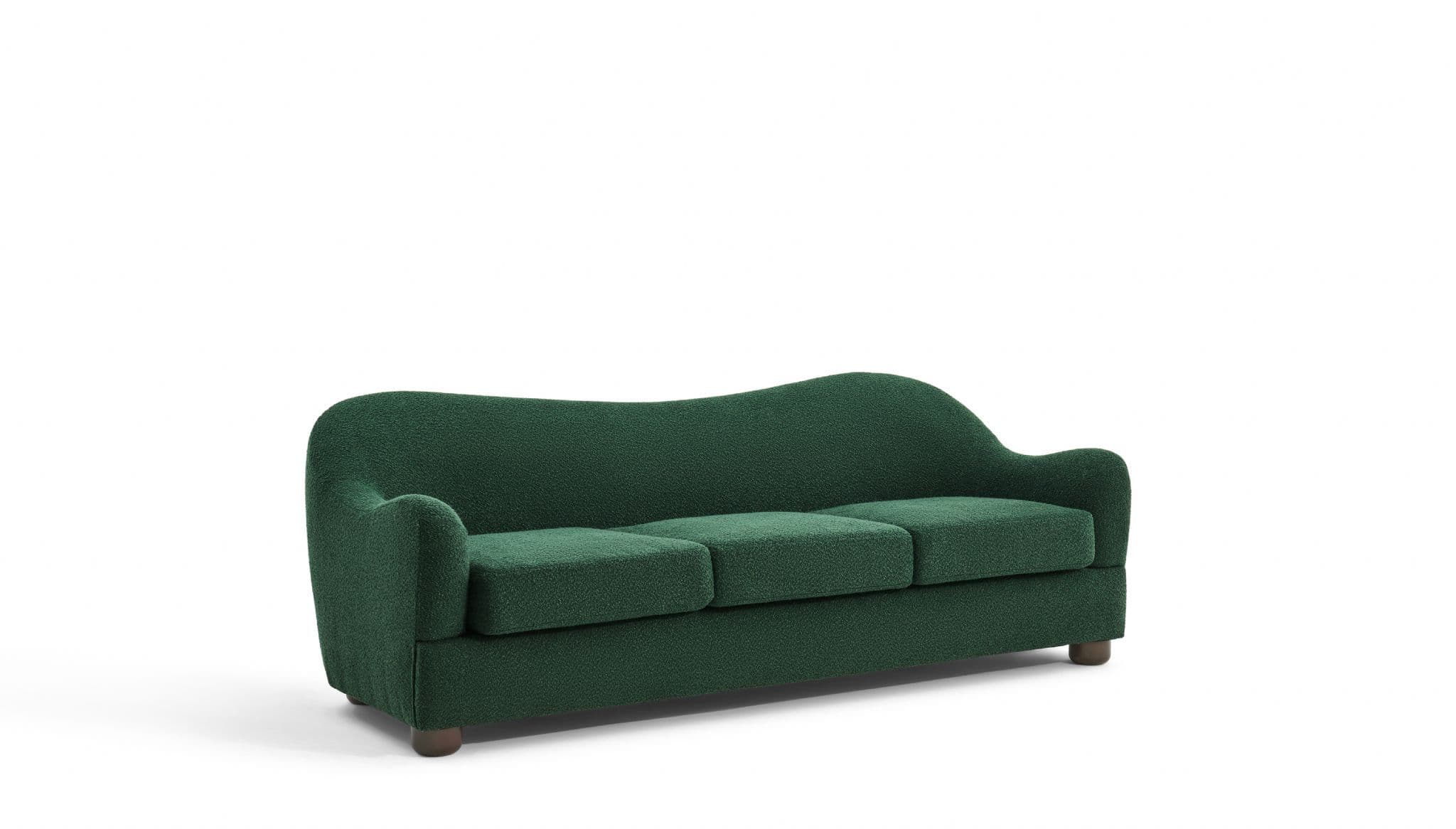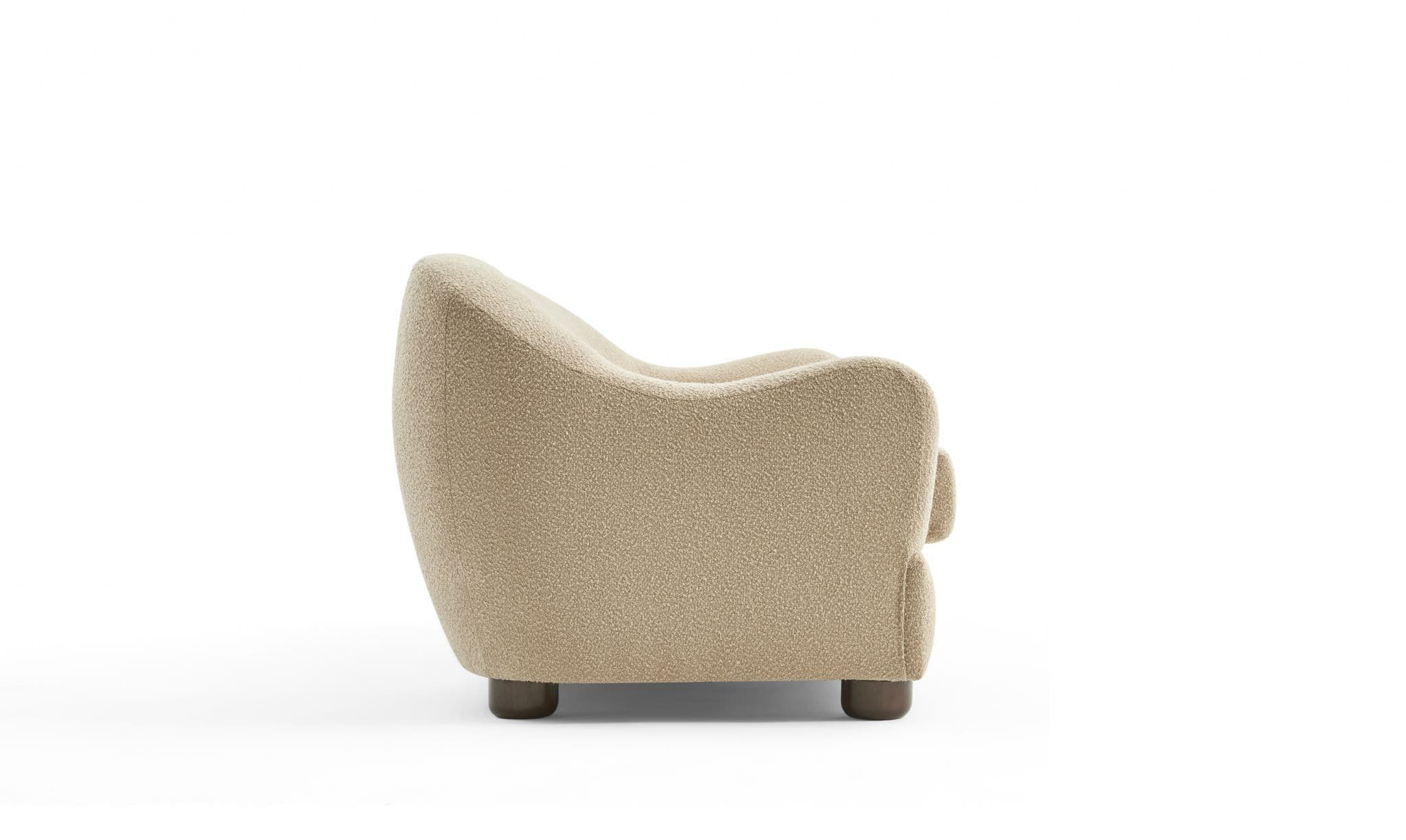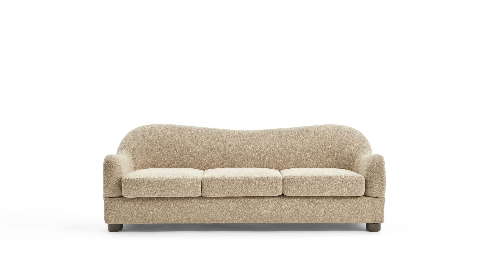 The Biscuit Sofa combines comfort with a unique wave back design Upholstered in soft beige boucle fabric it features plush seat cushions and a sculptural silhouette that adds elegance to any living room Built with plywood eucalyptus wood sponge and springs it ensures durability while providing cozy everyday seating.