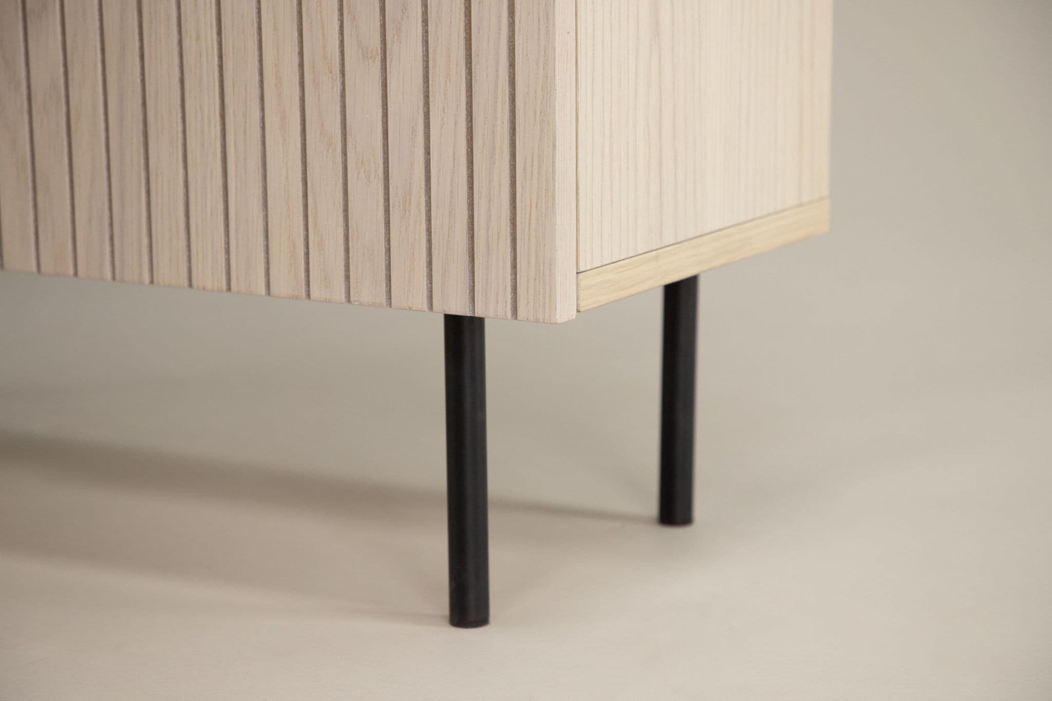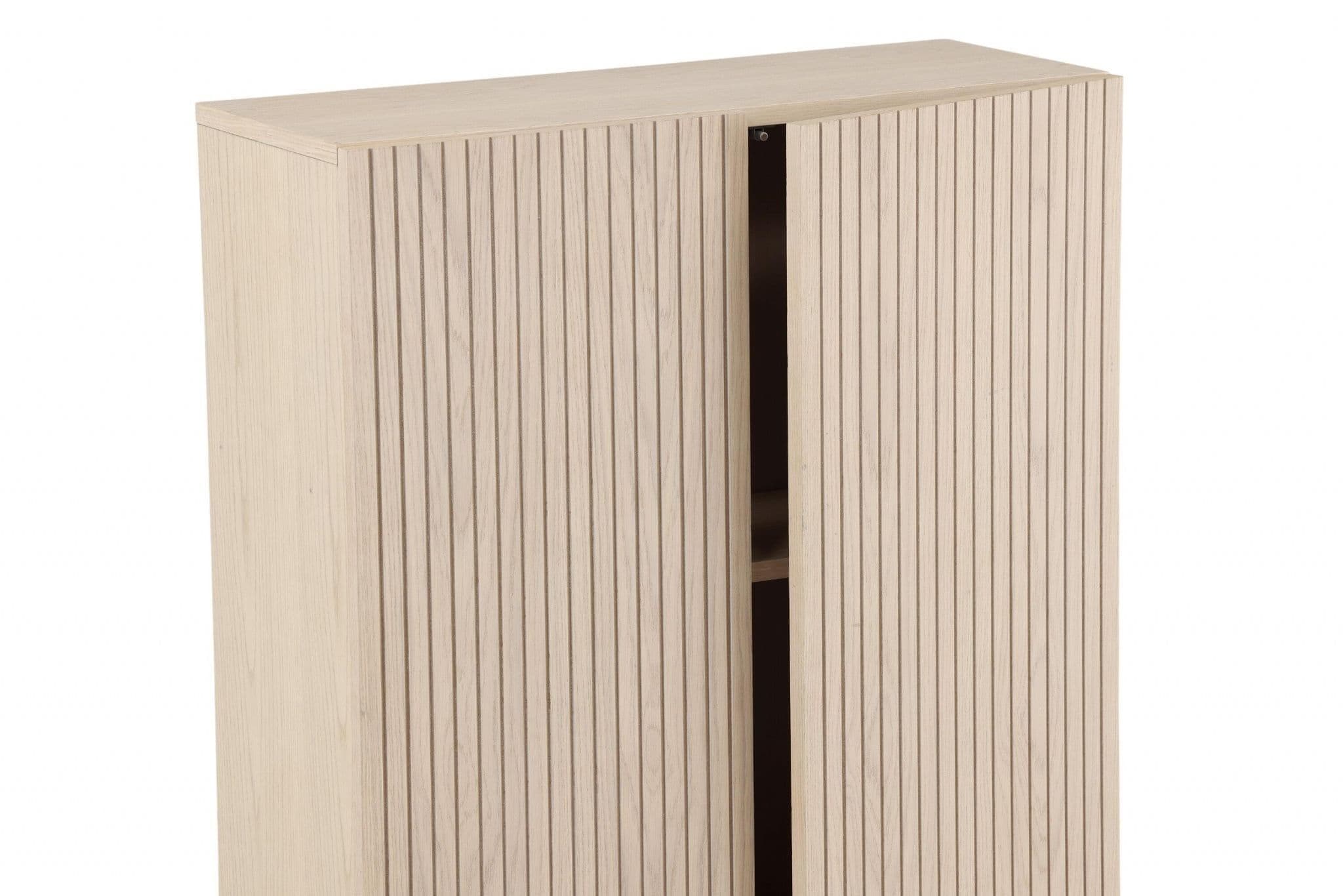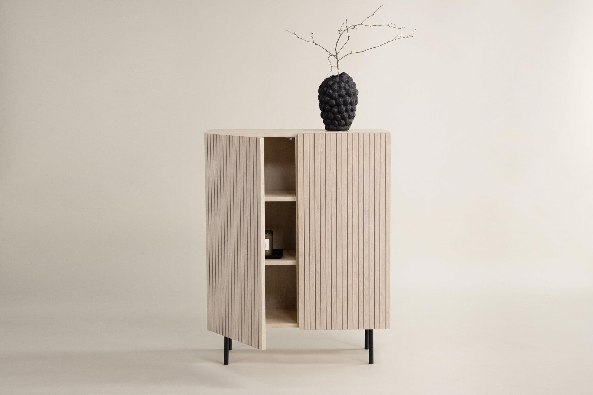 An as stylish as a smart storage solution for your home! This high relief cabinet from the Bjorkon series is available in different colors and sizes and quickly climbs on the trend lists with its stylish design. The cabinet has two gaps in ribbed look and three shelves for hidden storage. Made in white plastered veneer and lifted by narrow legs in black steel. Place as a side table with beautiful decorations and candlesticks or as a hidden display cabinet – only the imagination sets limits!