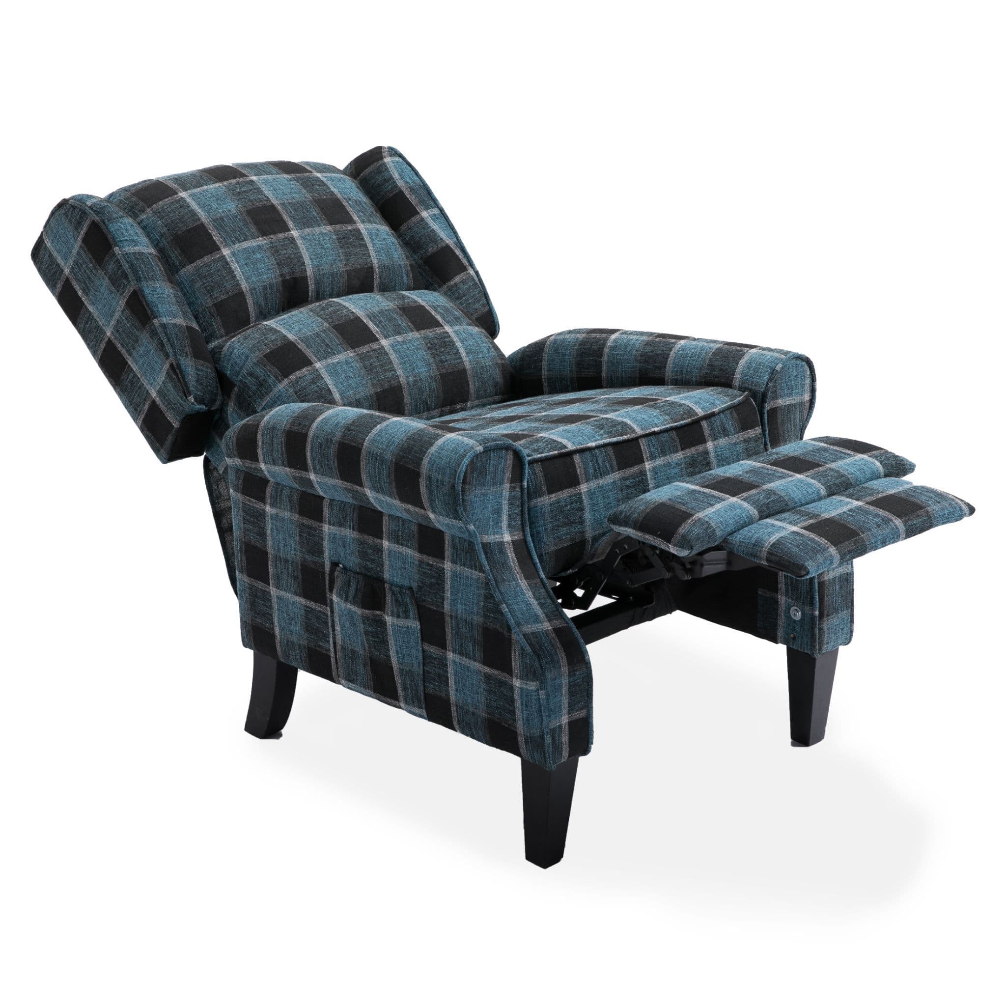 Blue Checked Fabric Recliner Armchair, With Wood Feet