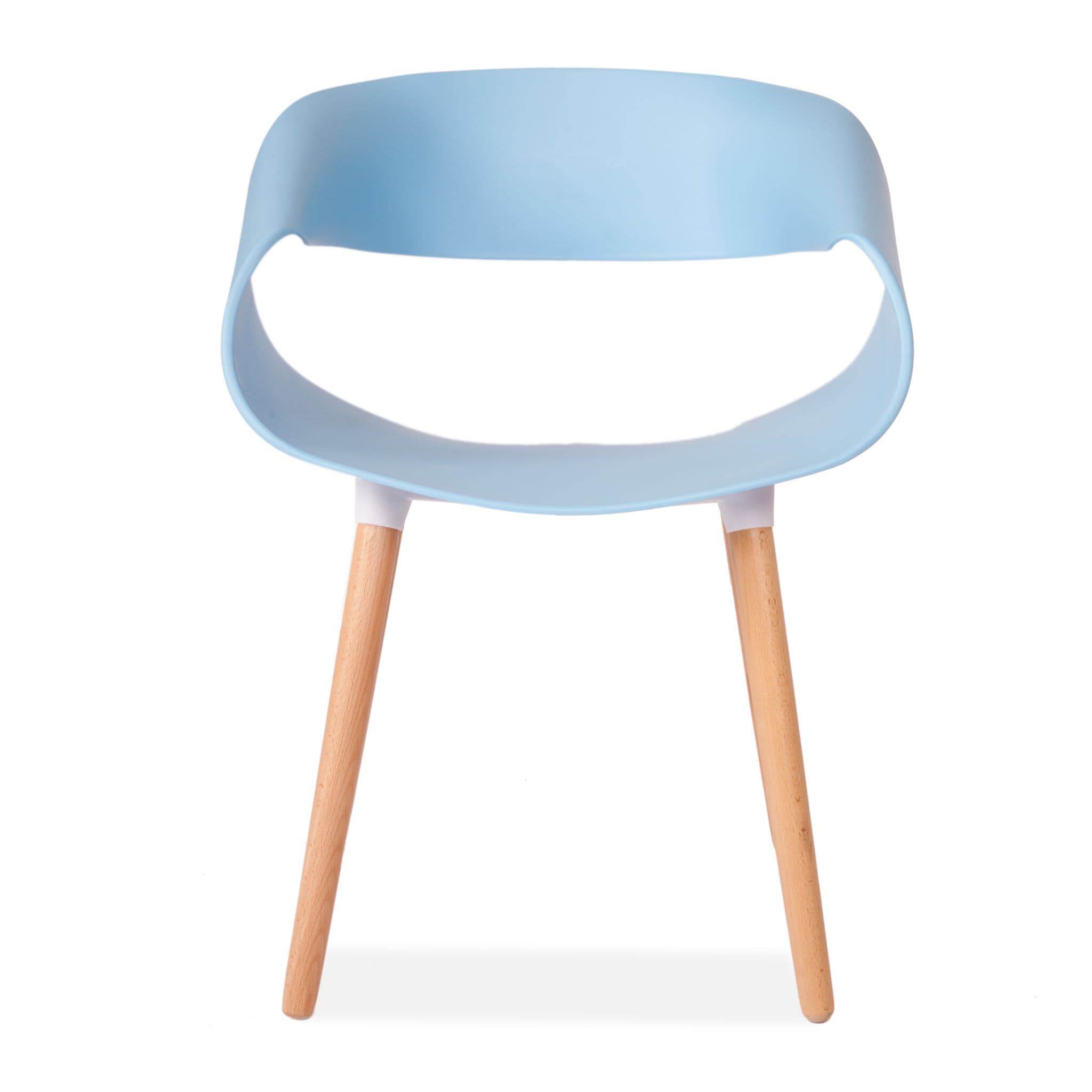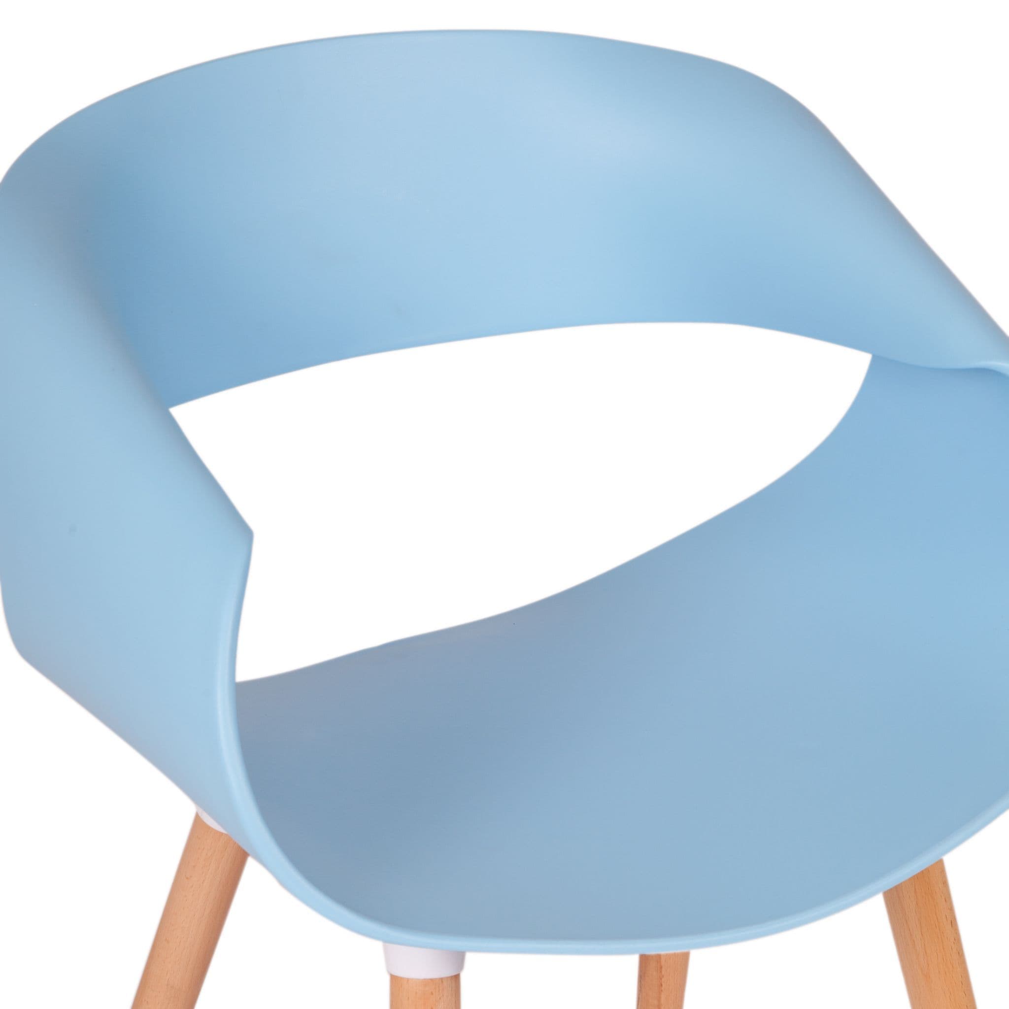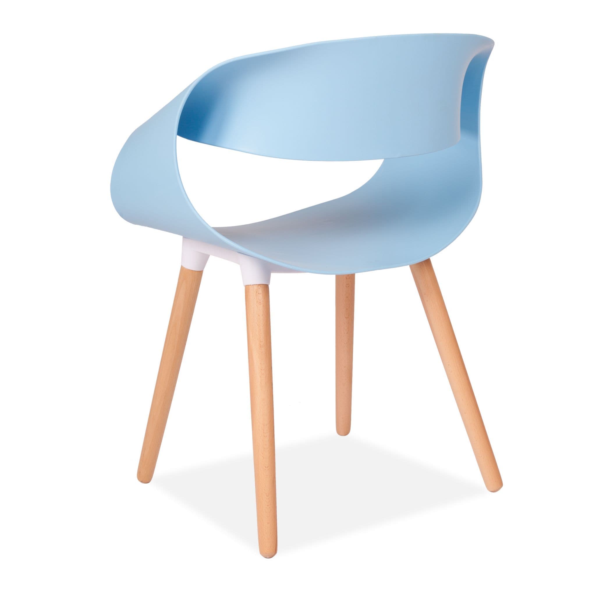 Simple Practical and High quality chair with solid wooden legs These modern design Twist back plastic chairs are perfect for modern homes or contemporary office spaces Designed for style and comfort with sturdy solid wooden legs These chairs not only look great but are comfy too The backrest is made from polypropylene plastic and s available in both Blue and White Its legs made of beech wood come with transparent non slip and anti scratch studs which allow them to be used on any type of floors or surfaces.