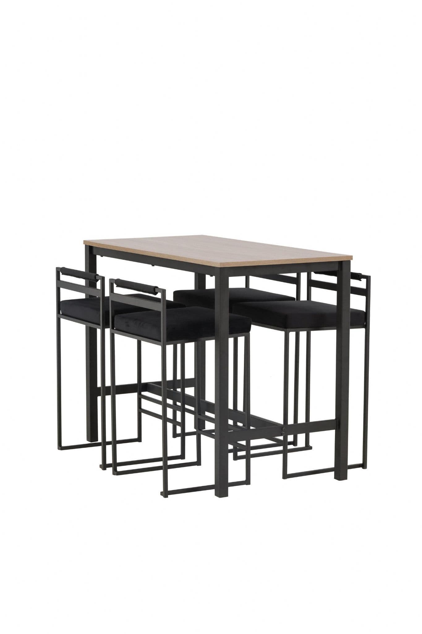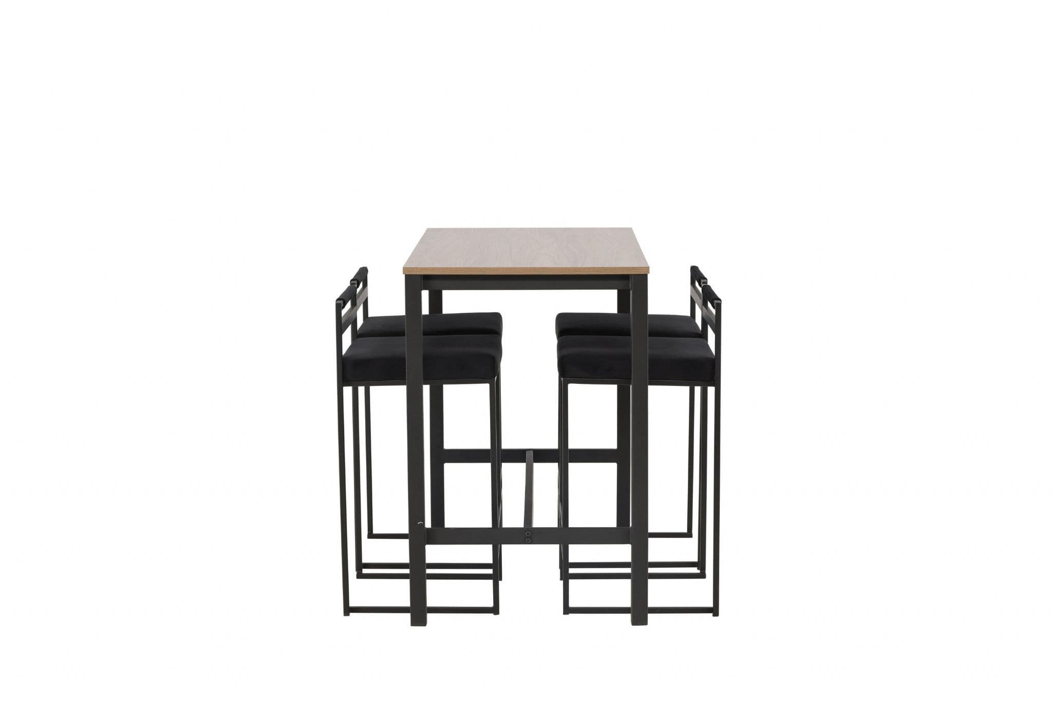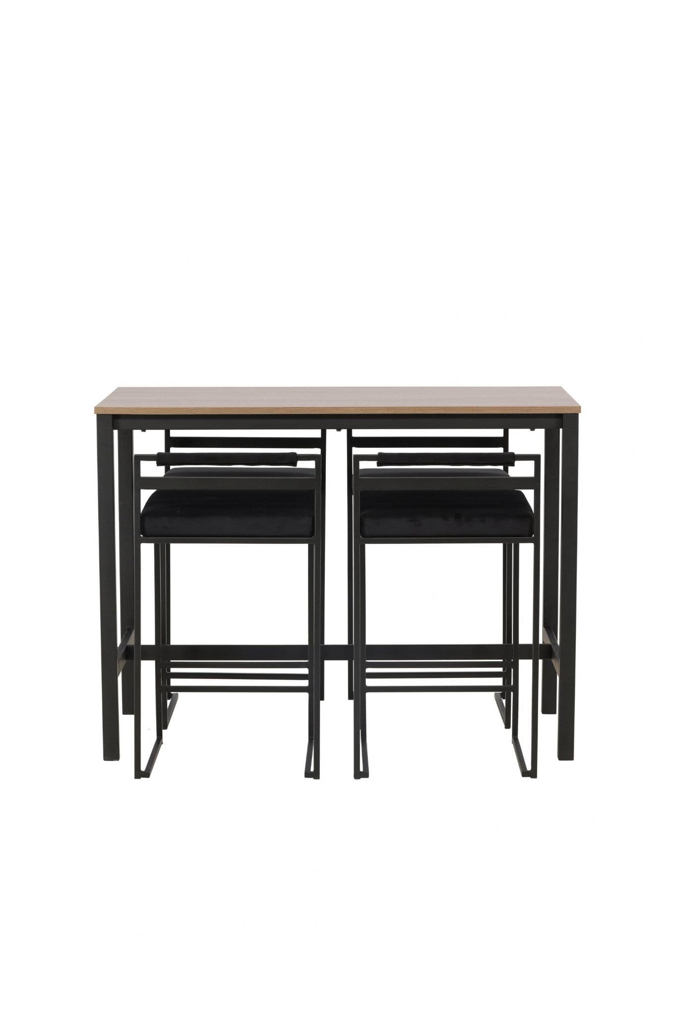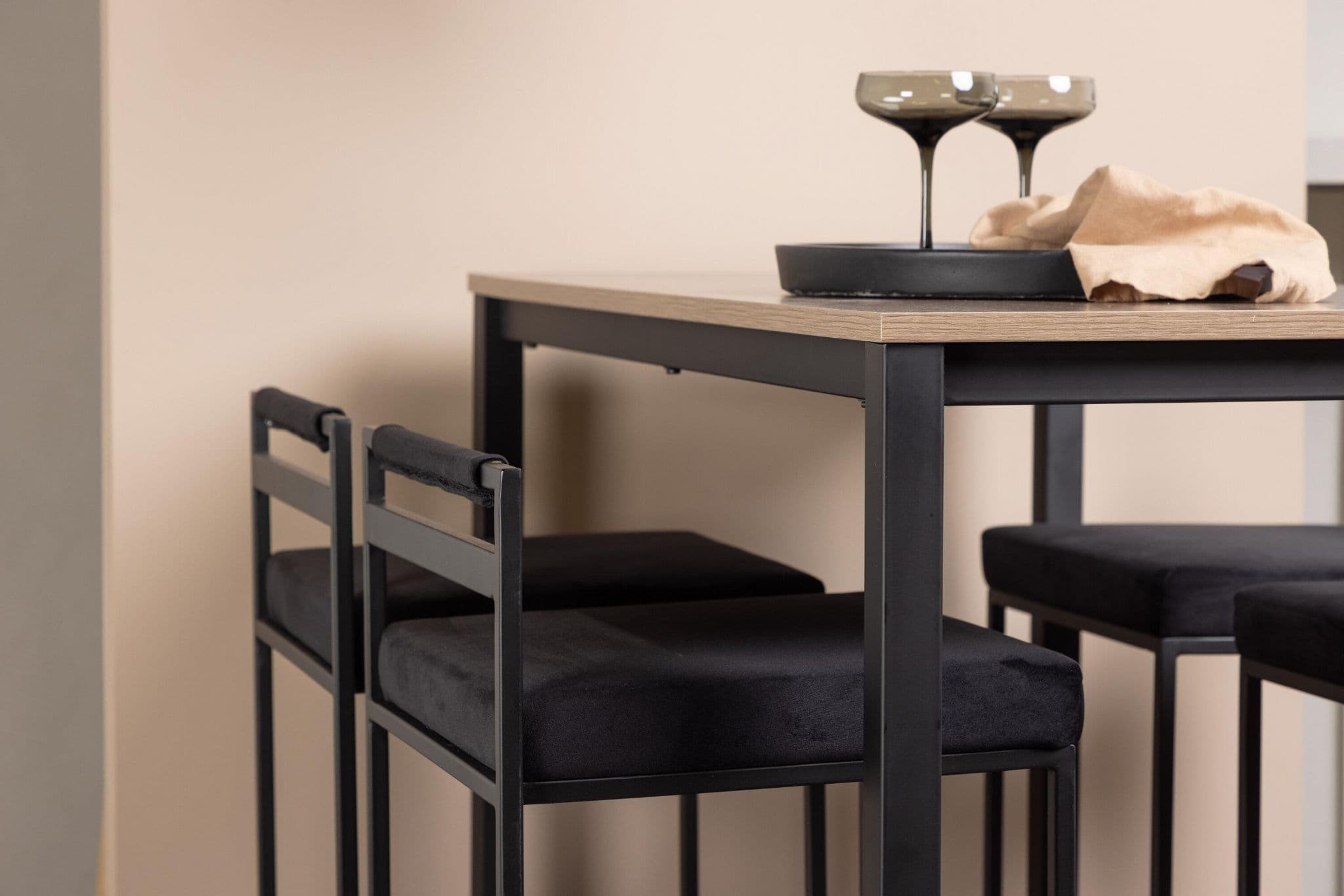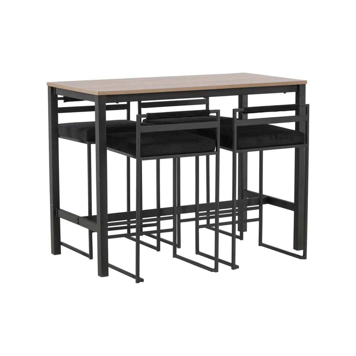 The perfect combination of minimalistic and industrial design The Camden bar table has straight Nordic shapes with a rectangular walnut colored table top in MDF and straight table legs in black steel with a frame for footrest Here in matching combination with black barstools from the Opelika series The seat is softly upholstered and has an elegant upholstery in black velvet fabric and the leg structure is stylishly minimalistic in black steel with a lower backrest and integrated footrest for extra comfort Take the interior to new heights Table dimensions 120x60cm.
