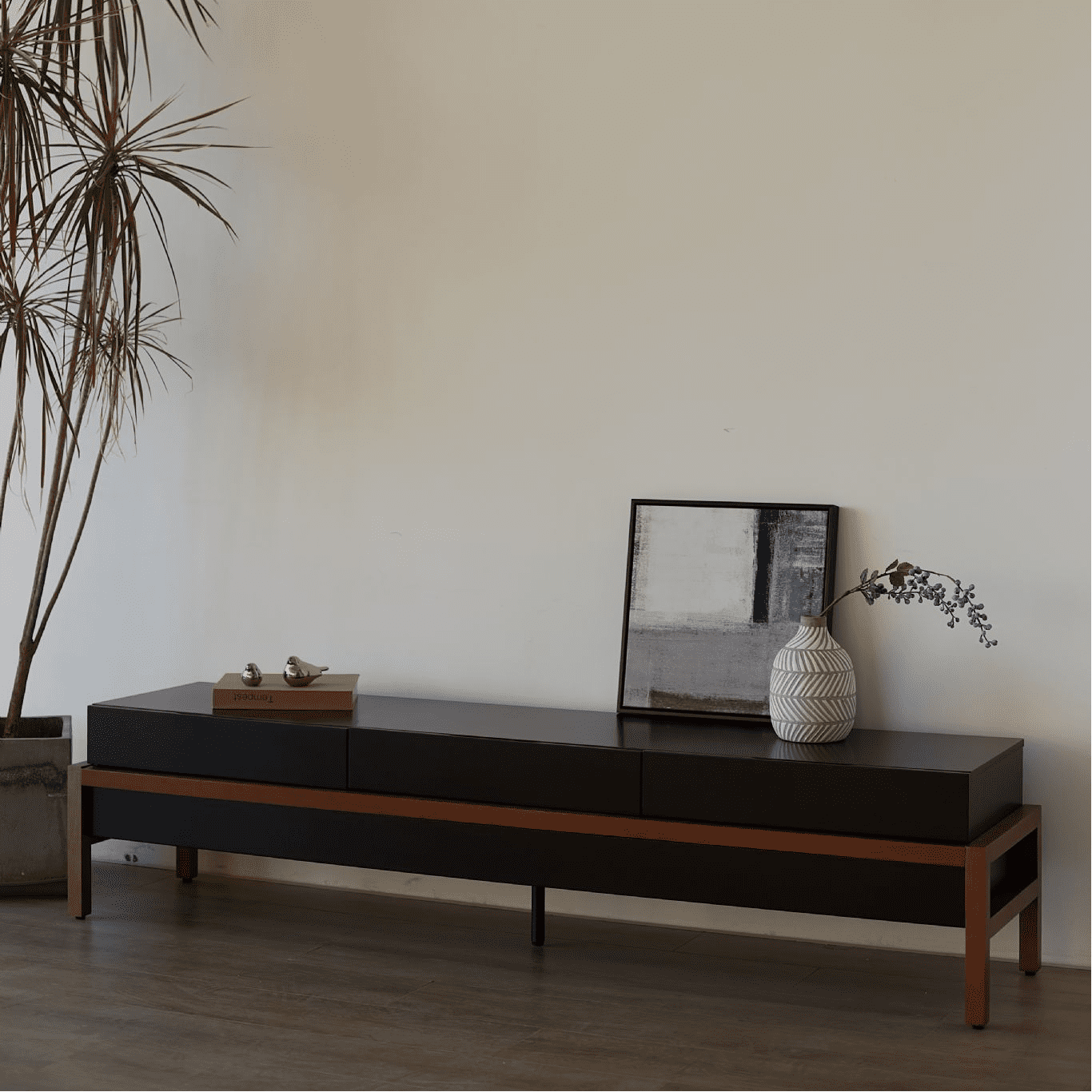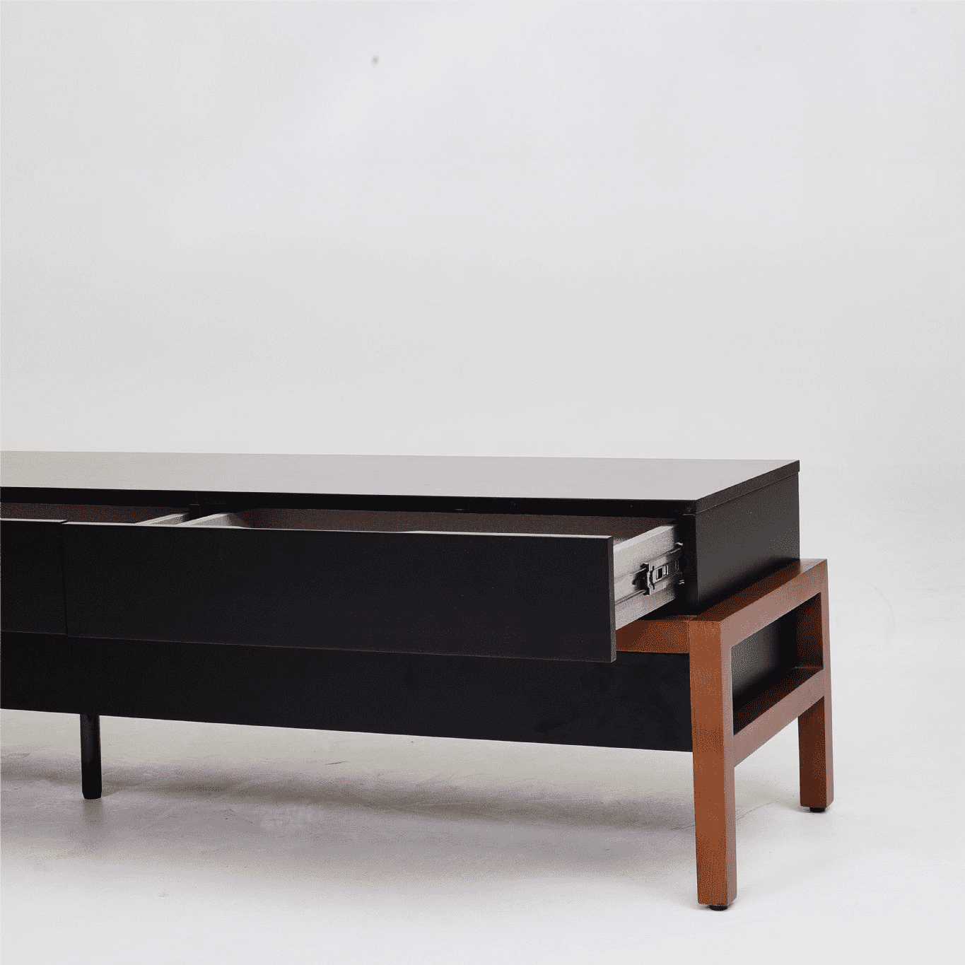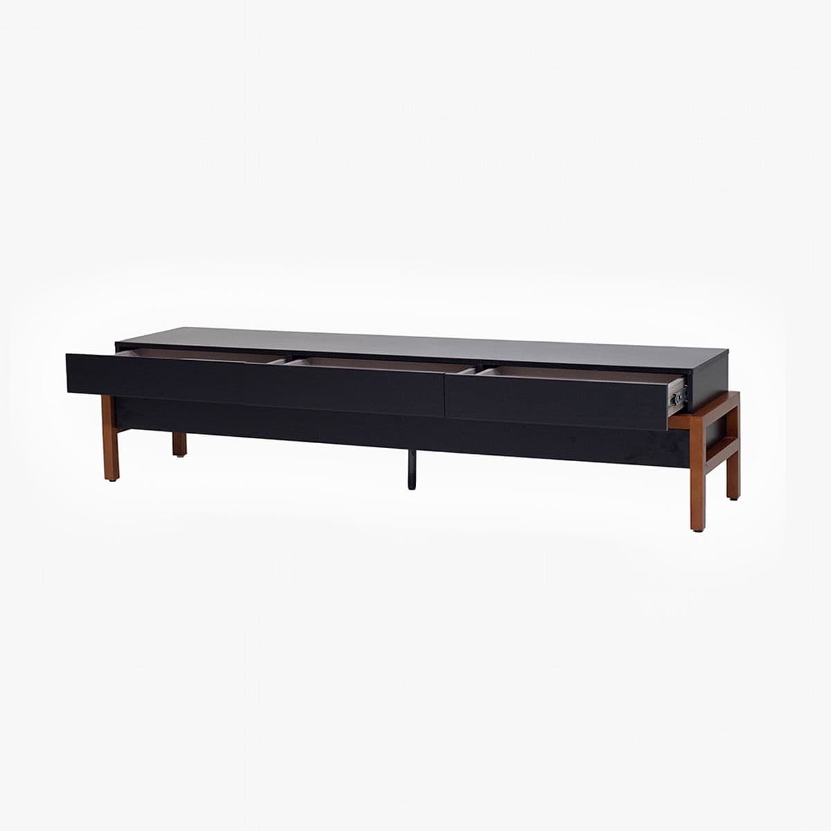 Elevate your living room with the Clifton TV stand This sleek and stylish TV stand combines functionality with modern design making it a perfect addition to any contemporary home Matt Black Finish The body of the stand boasts a sophisticated matt black finish that adds a touch of elegance to your space Stylish Interior The inside of the drawers features a chic grey finish offering a subtle contrast that enhances the overall aesthetic Durable Construction Designed with rubber legs in a rich walnut colour this TV stand ensures stability while adding a warm natural touch to the design Ample Storage Keep your entertainment area clutter free with spacious drawers and shelves that provide ample storage for cables accessories and other essentials Please note the net weight for this TV stand is 459kg As the TV stand size exceeds the pallet limitation the number 241kg is used to help the system make the right charge for the oversized pallet service.