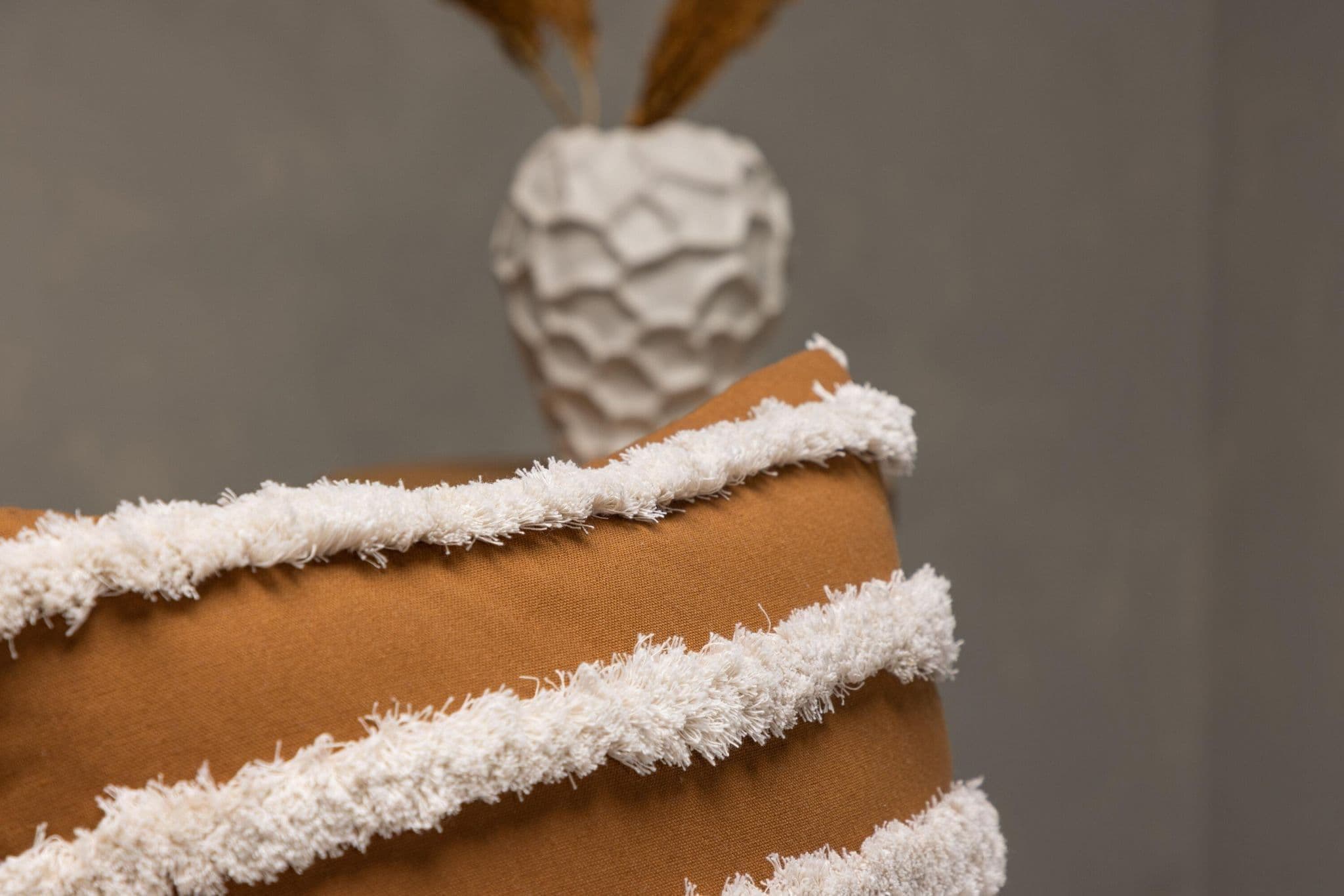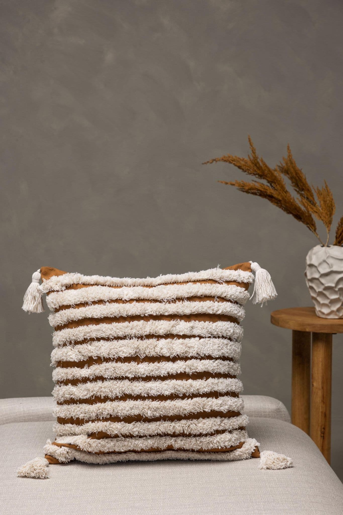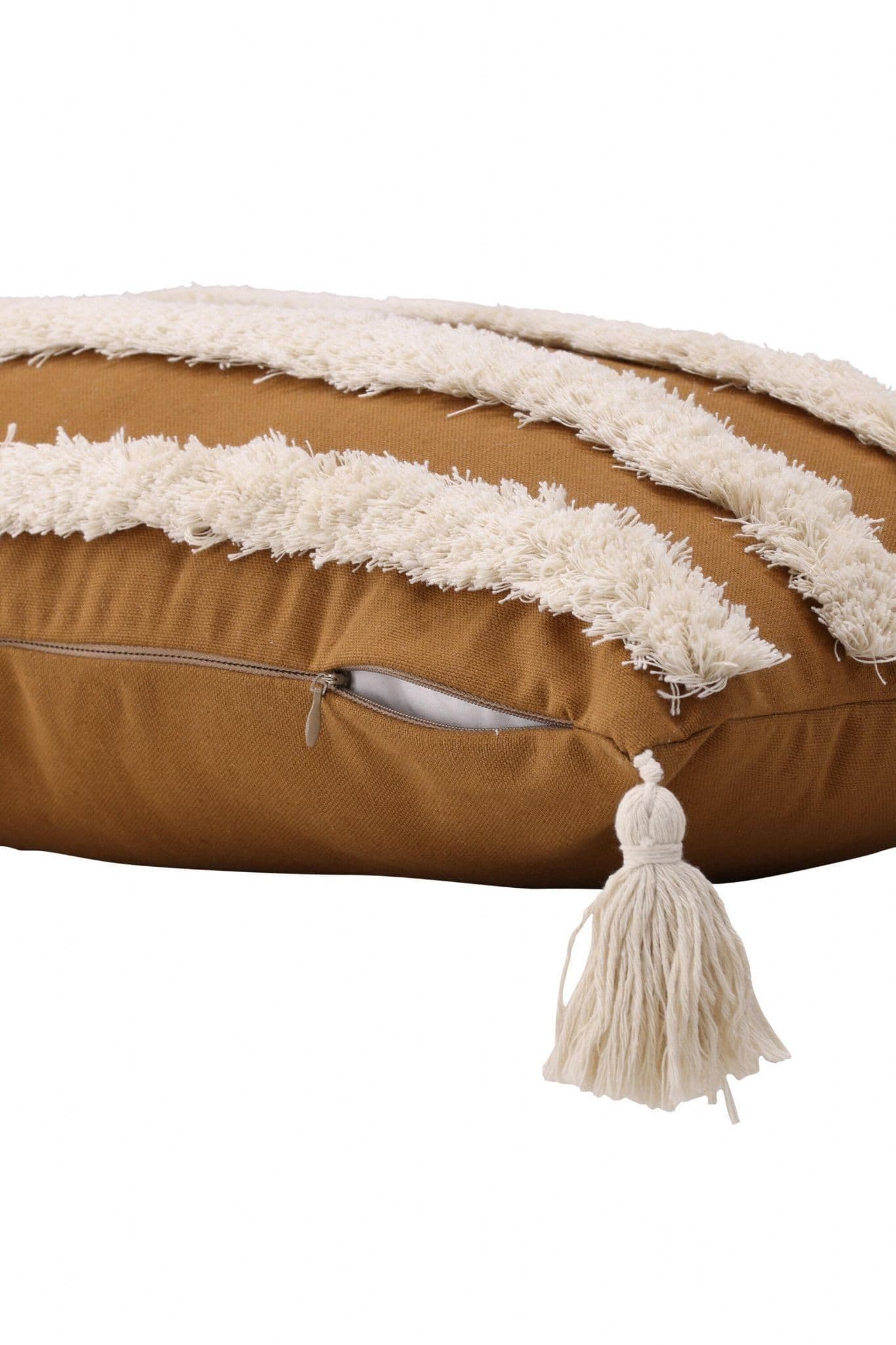 Put a personal touch on the interior with a pillow that stands out! This pillow case from the Elina series radiates art and fashion consciousness. The color base is in a rusty brown color and the tufted, linear pattern that gives delicious structure to the pillow, as well as the tassels in each corner are in a creamy beige color. Made of a perfect polyester and cotton mixture that is both compliant and durable. Match with other pillow cases in the sofa group and create a nice eye – catcher in the living room!