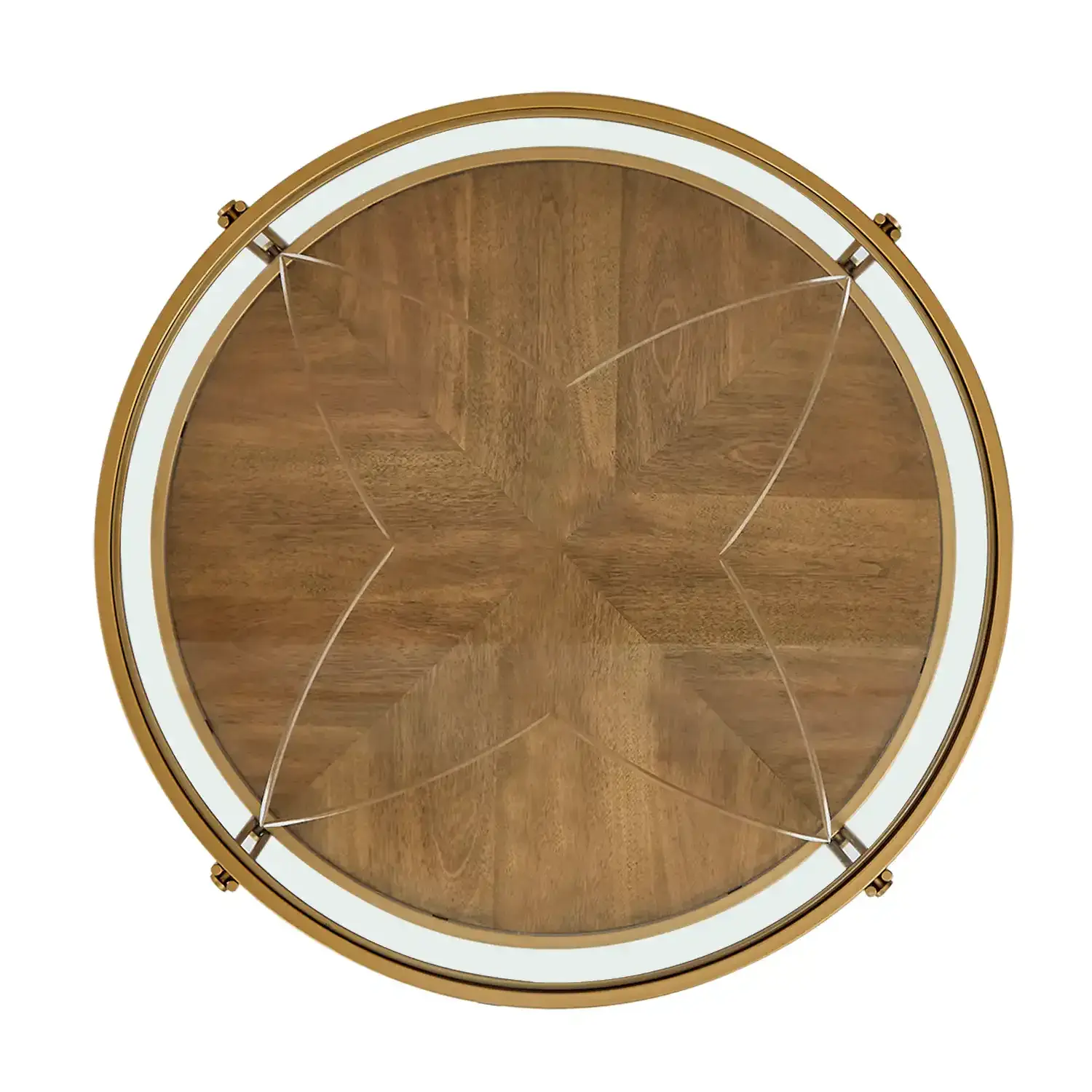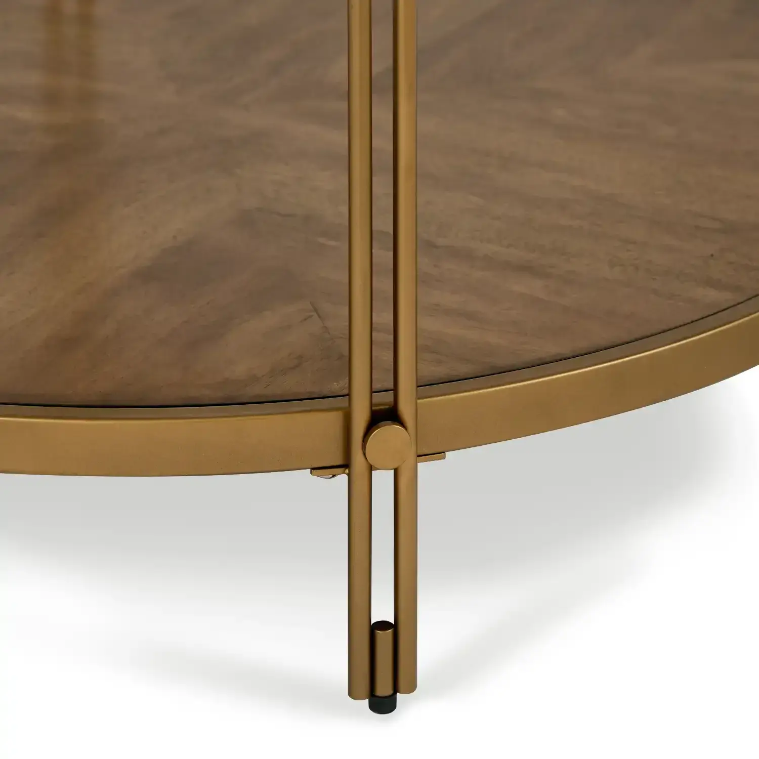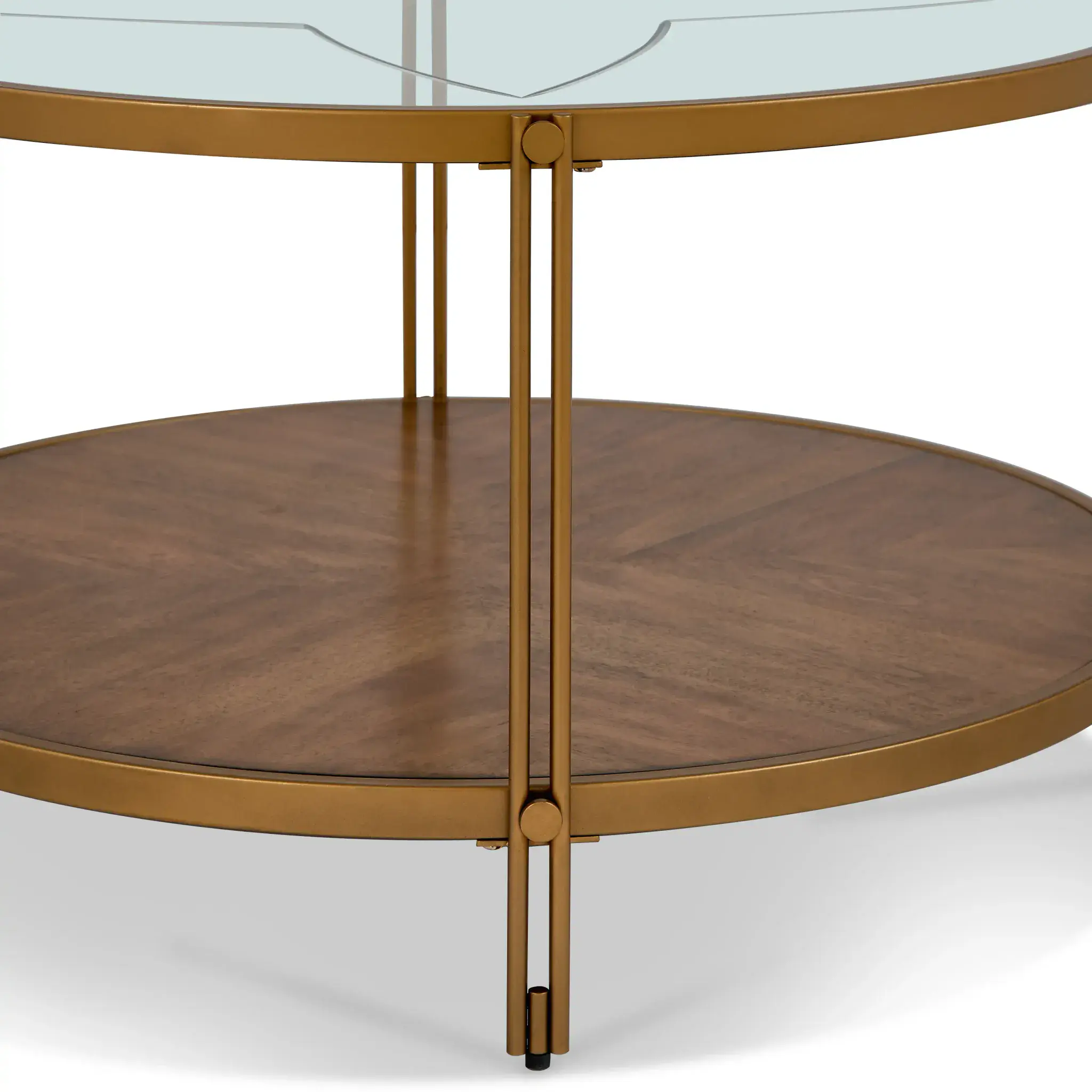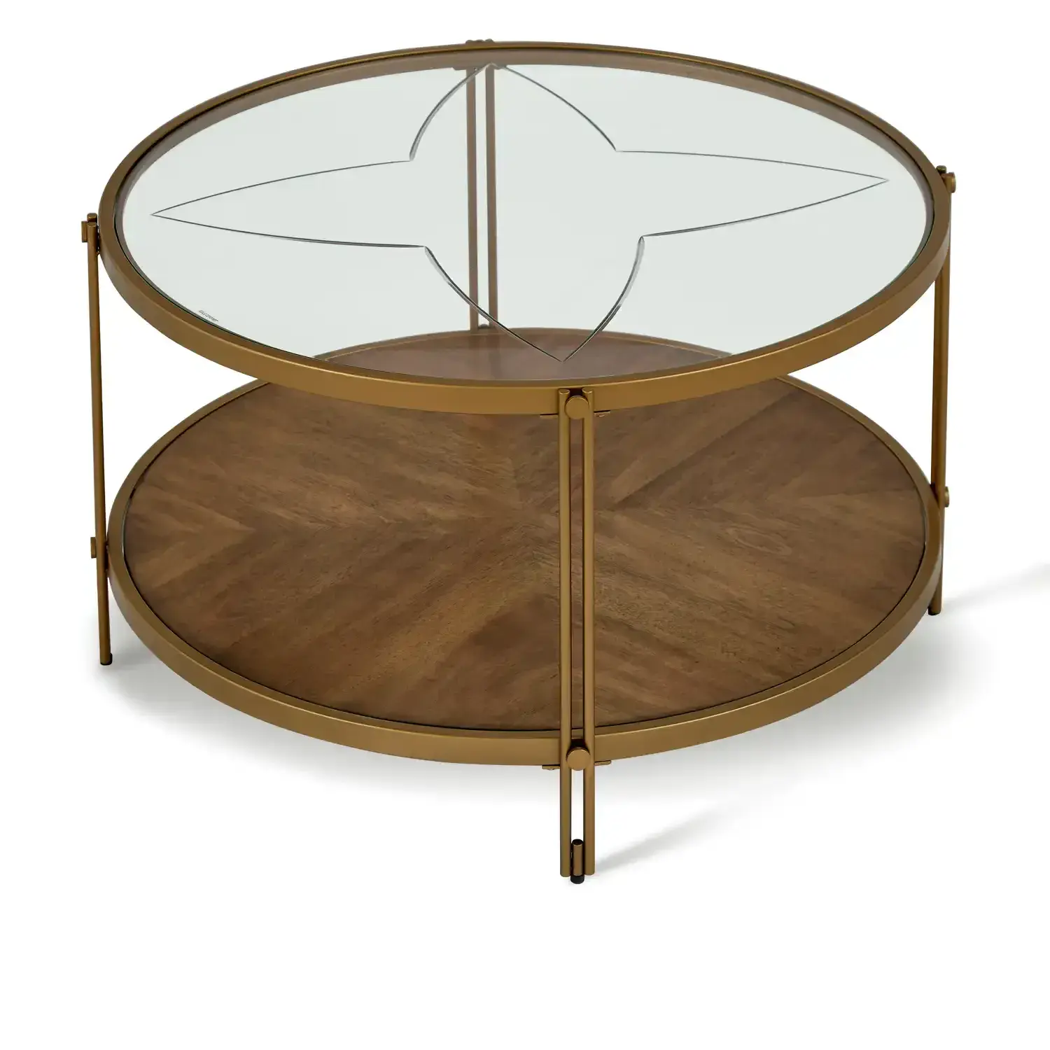 The Ember Round Coffee Table brings elegance and function into your living space Designed with a clear glass top gold powder coated metal frame and a lower shelf in birch veneer it offers both style and storage The round silhouette softens the look making it a perfect centerpiece for modern or classic interiors.
