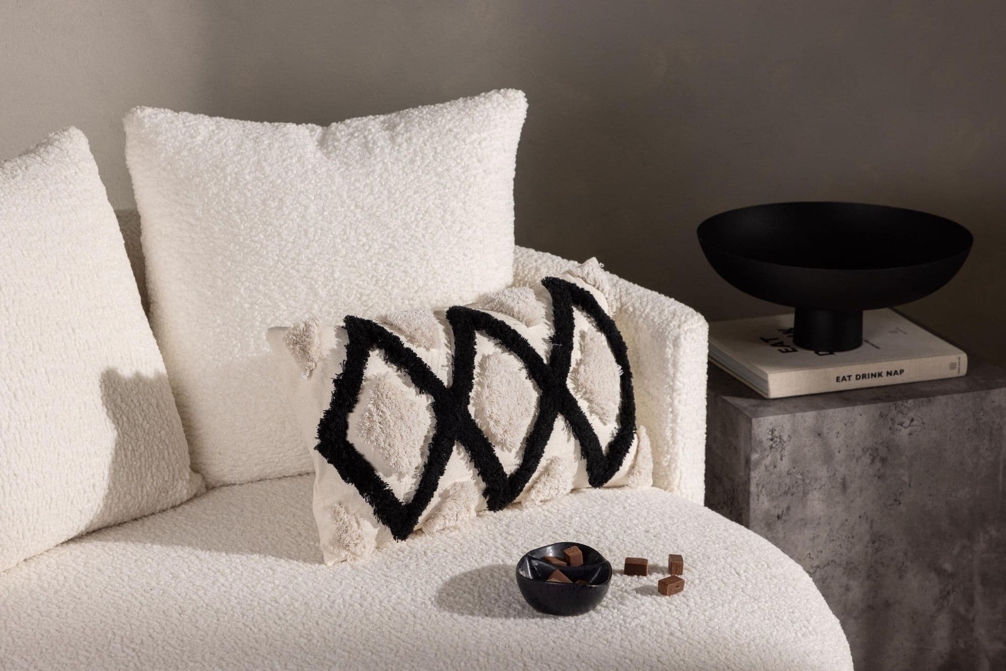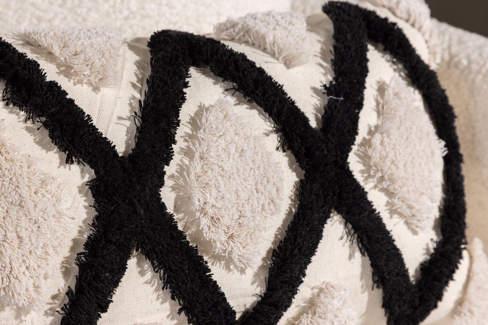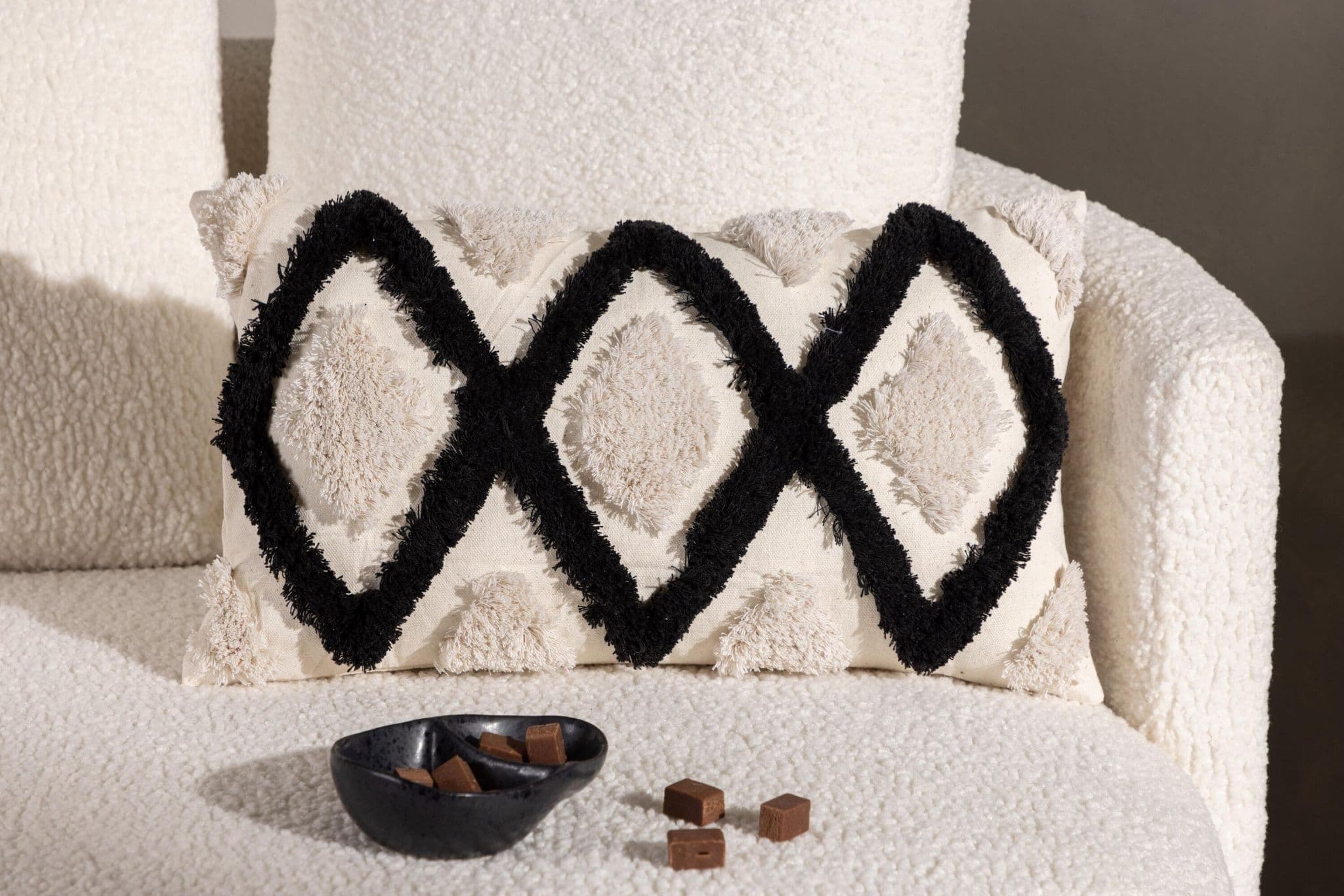 Emelie, our popular pillow case that combines comfort with modern designs! This elongated pillow case has a white color base and an abstract pattern in tufted material in both white and black color. Made of a perfect polyester and cotton mixture that is both compliant and durable. Create a nice eye – catcher in the sofa group with a trend – proof pillow that can easily be matched and combined with other pillow cases!