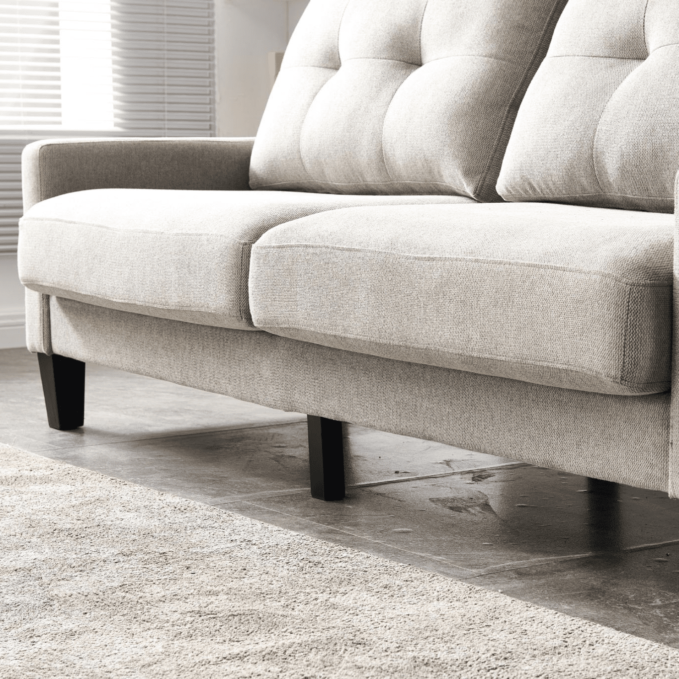 Upgrade your living space with the ENKO 2 Seater Beige Fabric Sofa Durable polyester fabric cover High density new foam for maximum comfort and support Sturdy wood frame and sleek black metal legs Cushions and pillows vacuum packed for easy shipping and unpacking Whether youre entertaining guests or relaxing at home this elegant sofa provides a comfortable and stylish seating solution.