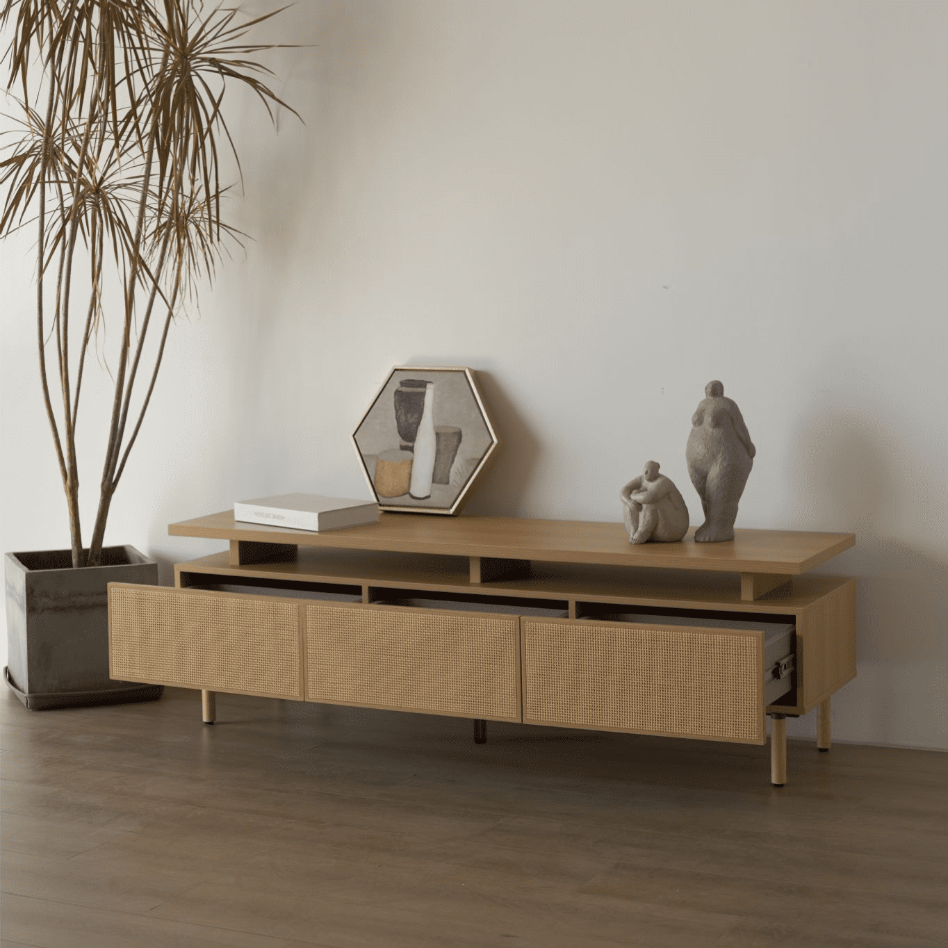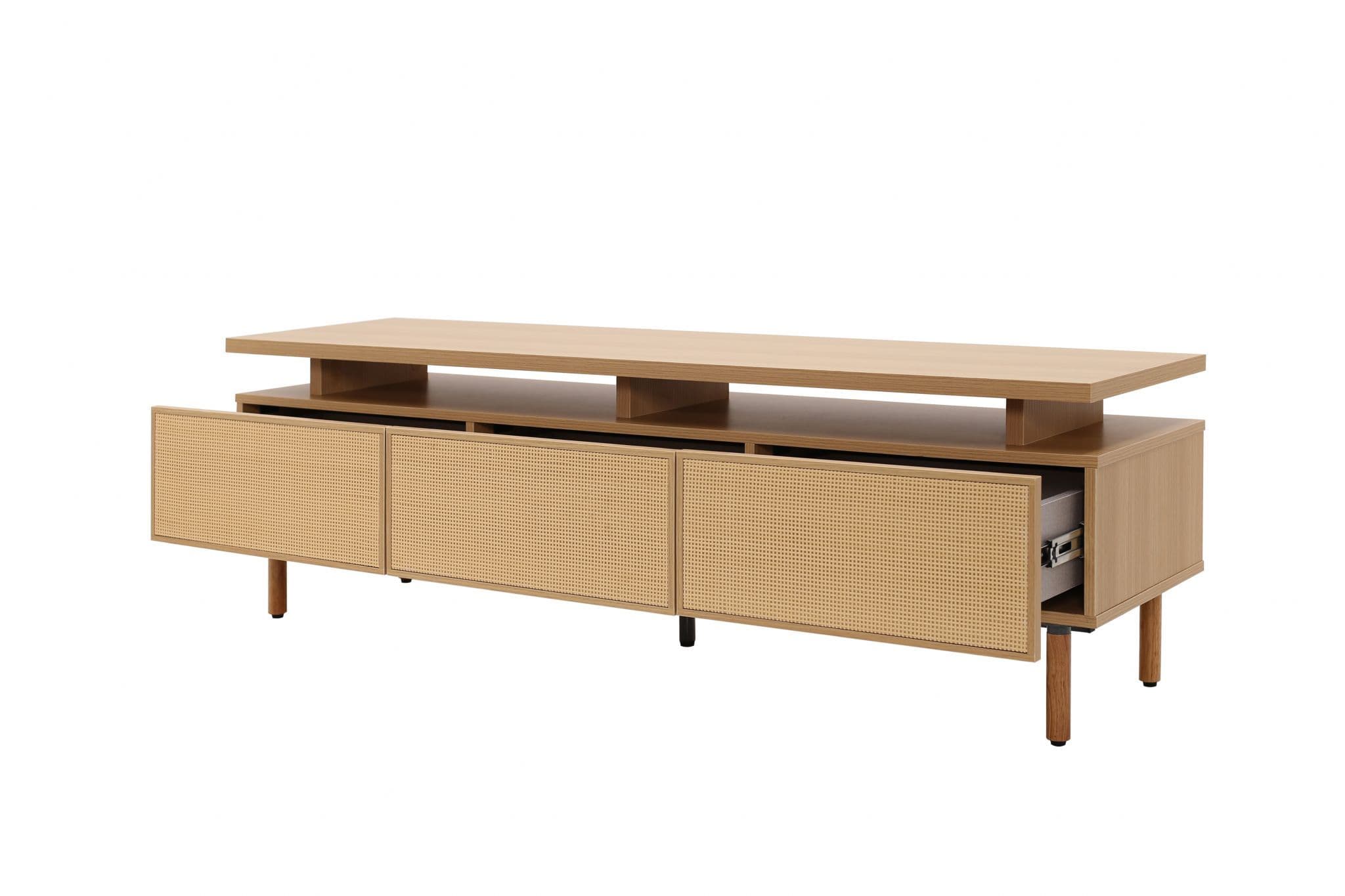 Elevate your living space with the elegant Grace TV Unit Featuring a blend of style and functionality this unit is a perfect addition to any home decor Natural Oak Colour Melamine Body Offers a stylish and durable finish Grey Drawer Interior Adds a sleek contrast and a touch of sophistication Rubber Wood Legs in Natural Colour Provides sturdy support and a harmonious blend with the overall design Spacious Storage Ideal for organising your essentials Modern Elegance Perfect for those who appreciate fine craftsmanship and contemporary design Please note the net weight for this TV stand is 496kg As the TV stand size exceeds the pallet limitation the number 241kg is used to help the system make the right charge for the oversized pallet service.