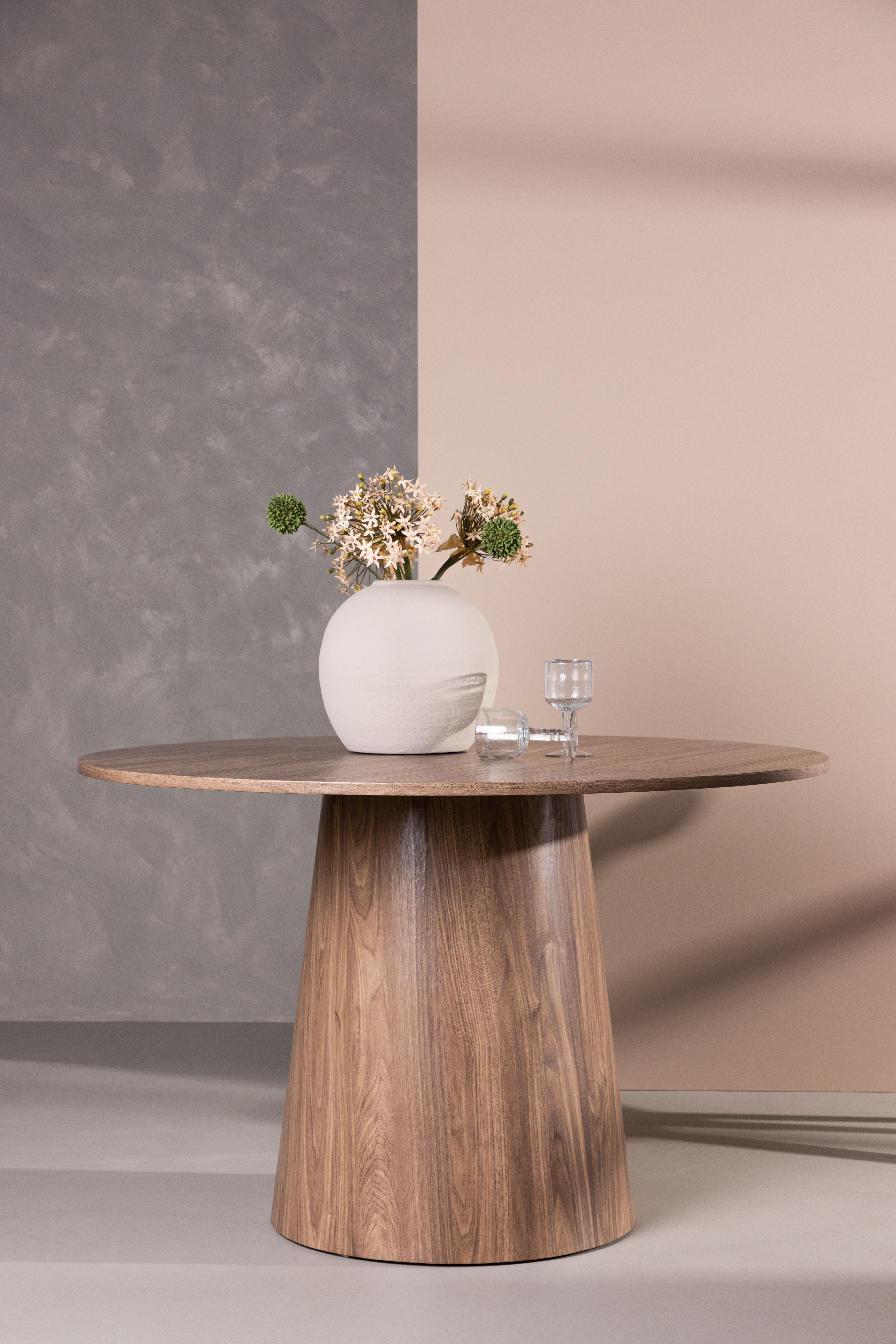 Dining table Lanzo impresses with Scandinavian design and tasteful form! The table has a consistent design in MDF with a thin, round tabletop and a twisted cylindrical base centered under the table. The earthy color and visible material pattern add life and movement. Create a stylish centerpiece – no one ends up on the edge!