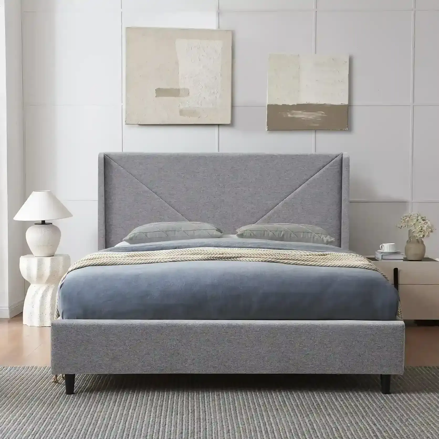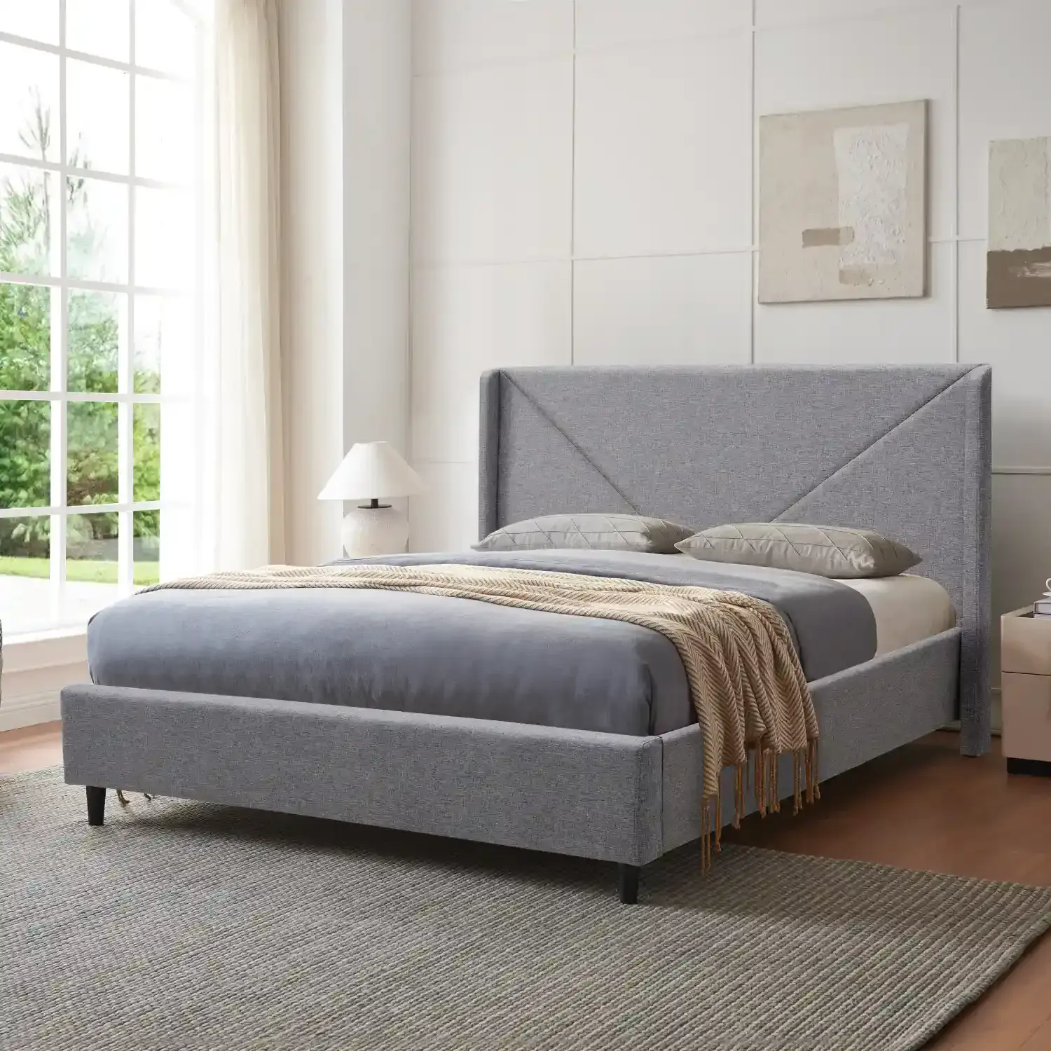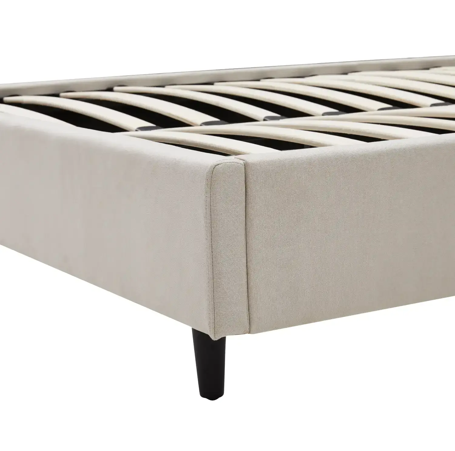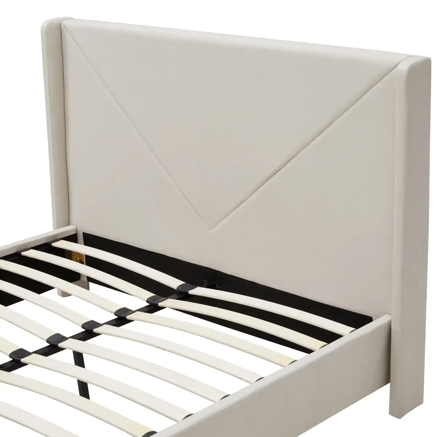 The Leonie Beige Doublesize Size Upholstered Bed has the same stylish V stitched headboard as the king size version but in a smaller size Its great for guest rooms smaller bedrooms or apartments where space is limited Covered in high quality grey linen fabric it has a simple modern look that fits well with various interior styles The bed frame is strong made from hardwood and plywood with 12mm thick wooden slats that provide solid support Features Stylish V stitched headboard Strong frame supports up to 180kg Durable 12mm solid wood slatsno box spring needed Fire resistant fabric meeting UK safety standards Easy to assemble with instructions included Great for smaller rooms 1 year warranty A perfect blend of style comfort and durability.