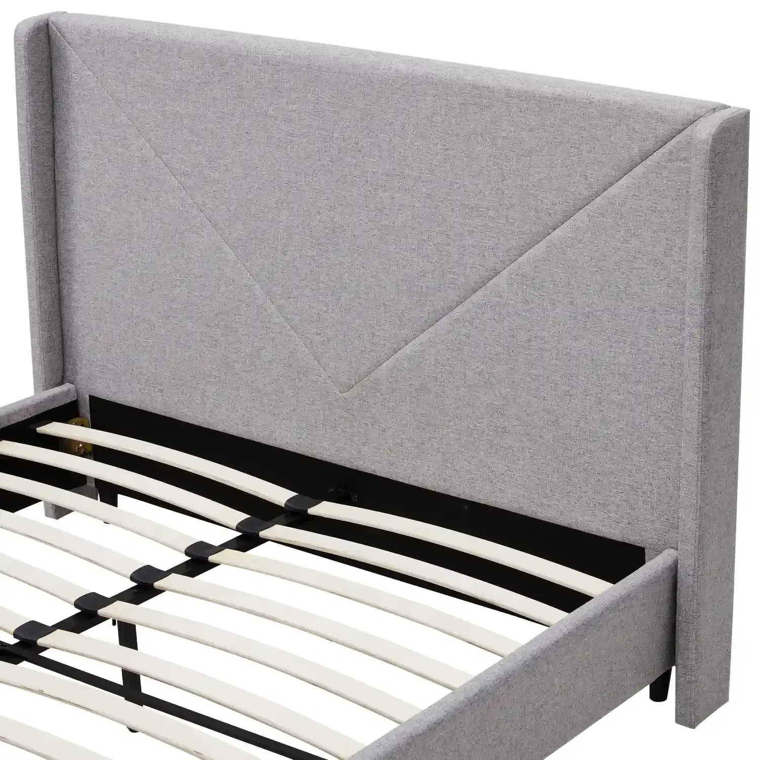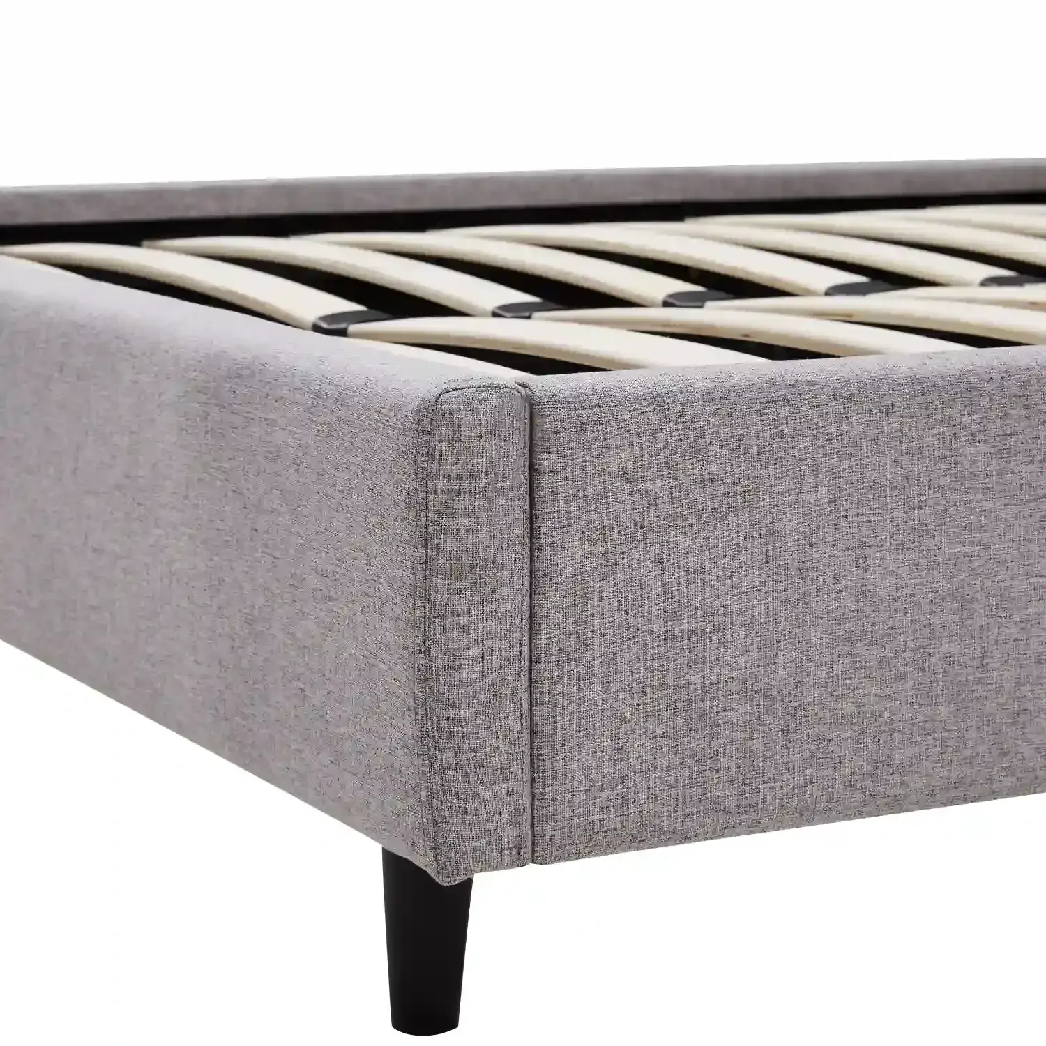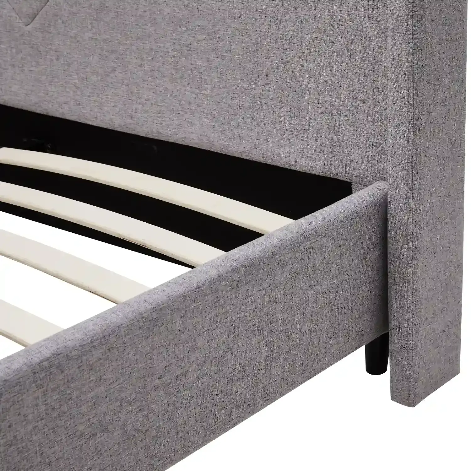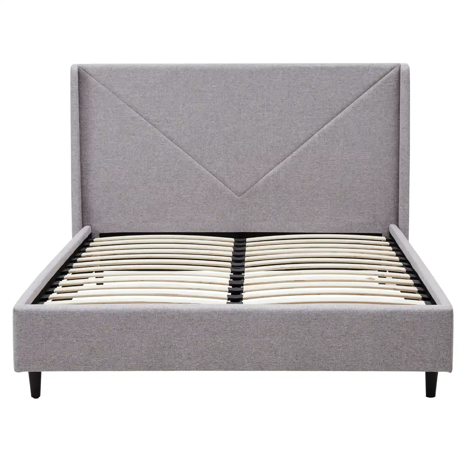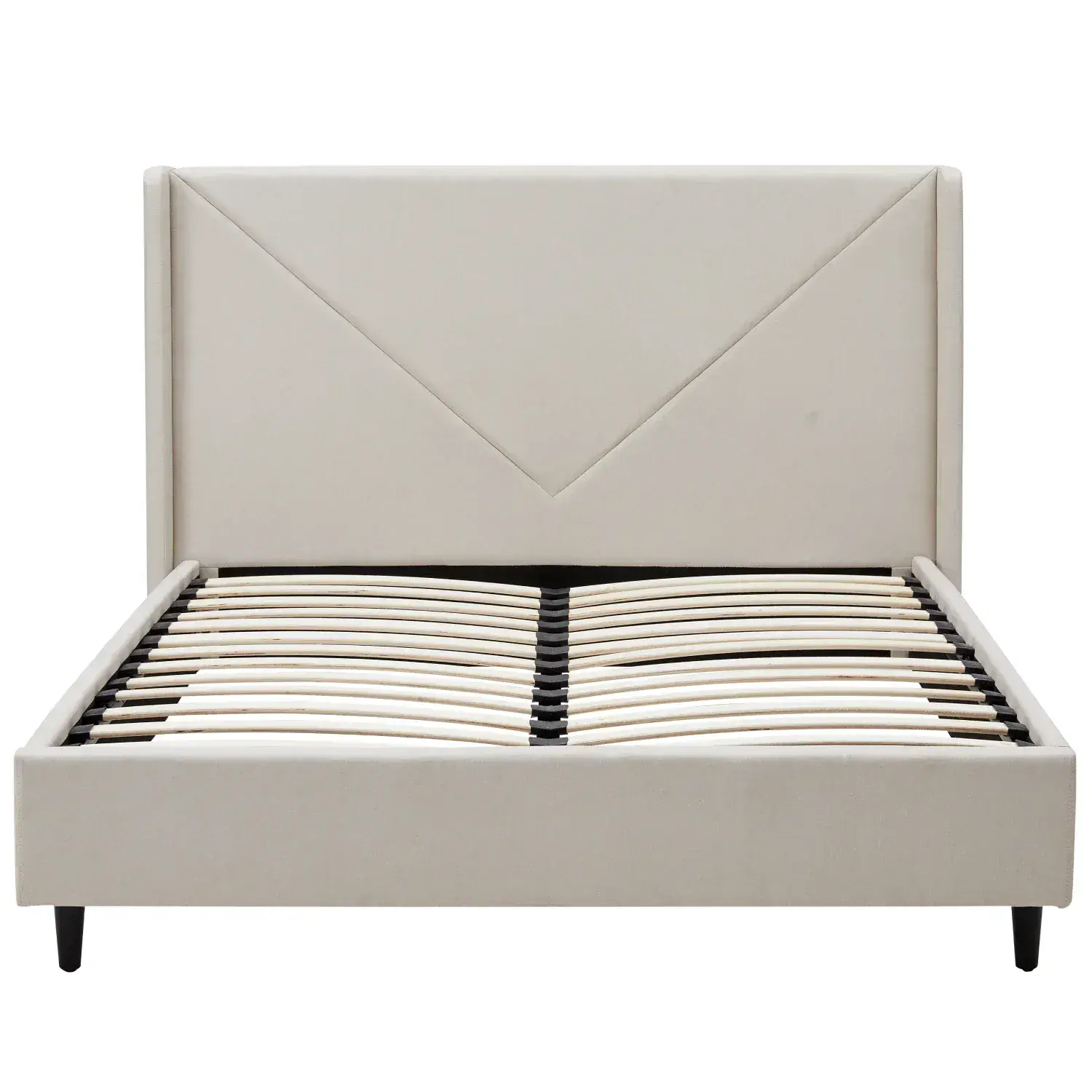 The Leonie Beige Doublesize Size Upholstered Bed has the same stylish V stitched headboard as the king size version but in a smaller size Its great for guest rooms smaller bedrooms or apartments where space is limited Covered in high quality grey linen fabric it has a simple modern look that fits well with various interior styles The bed frame is strong made from hardwood and plywood with 12mm thick wooden slats that provide solid support Features Stylish V stitched headboard Strong frame supports up to 180kg Durable 12mm solid wood slatsno box spring needed Fire resistant fabric meeting UK safety standards Easy to assemble with instructions included Great for smaller rooms 1 year warranty A perfect blend of style comfort and durability.