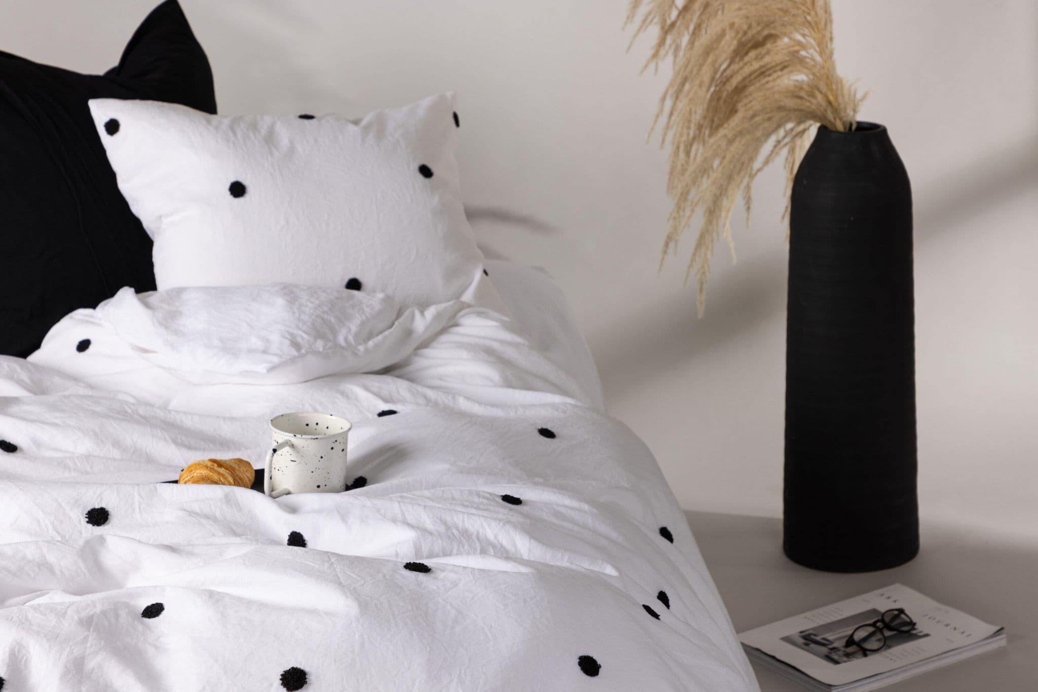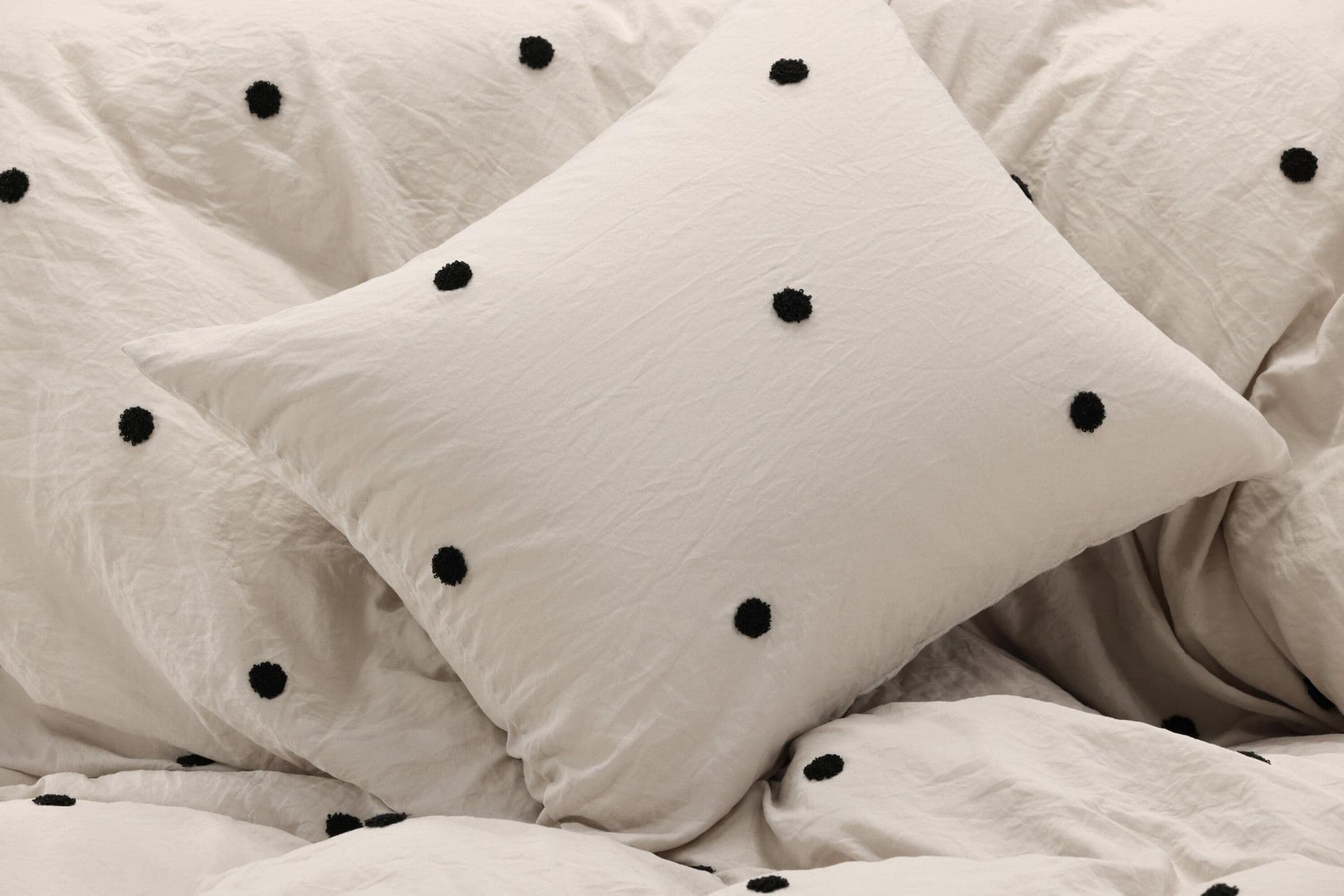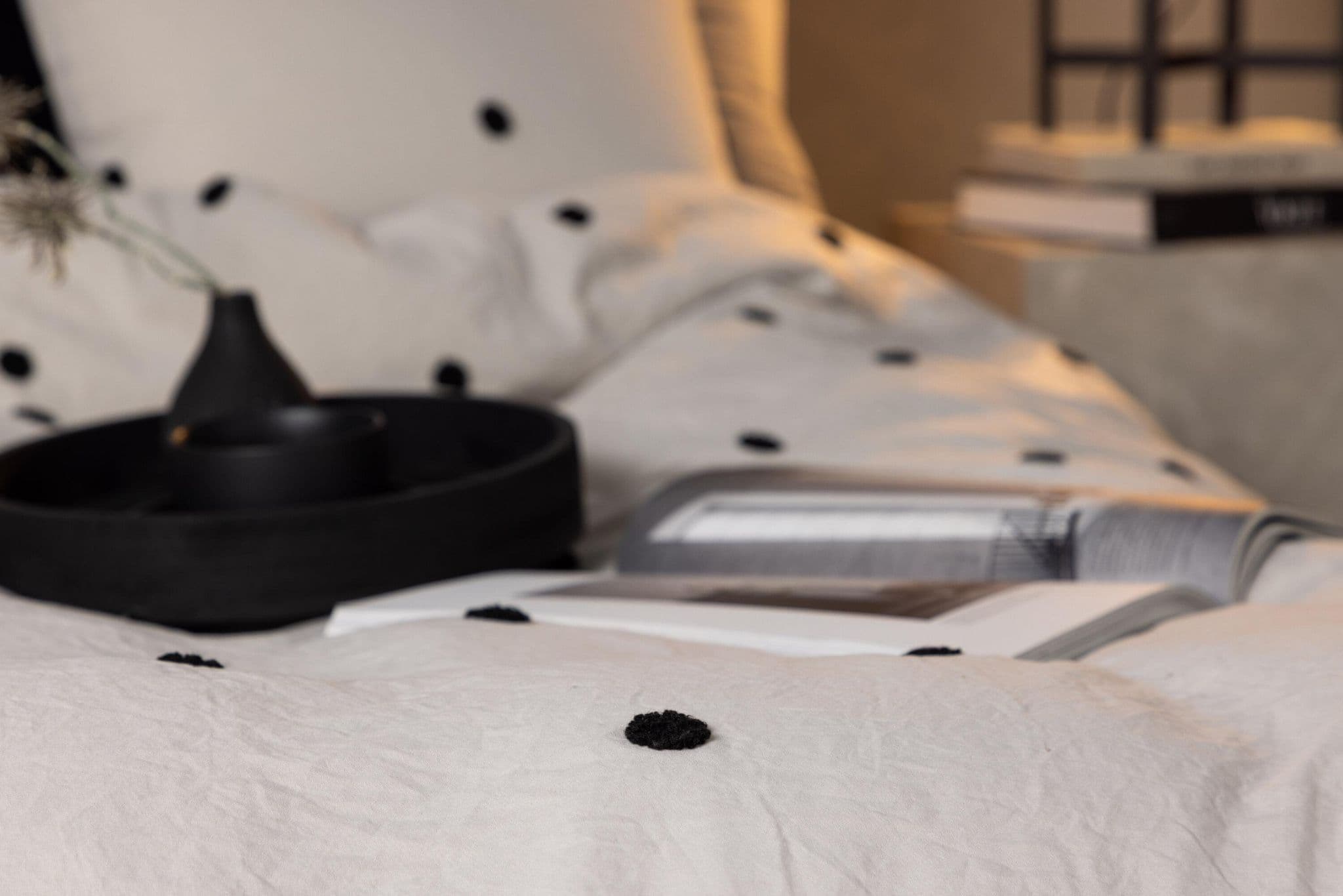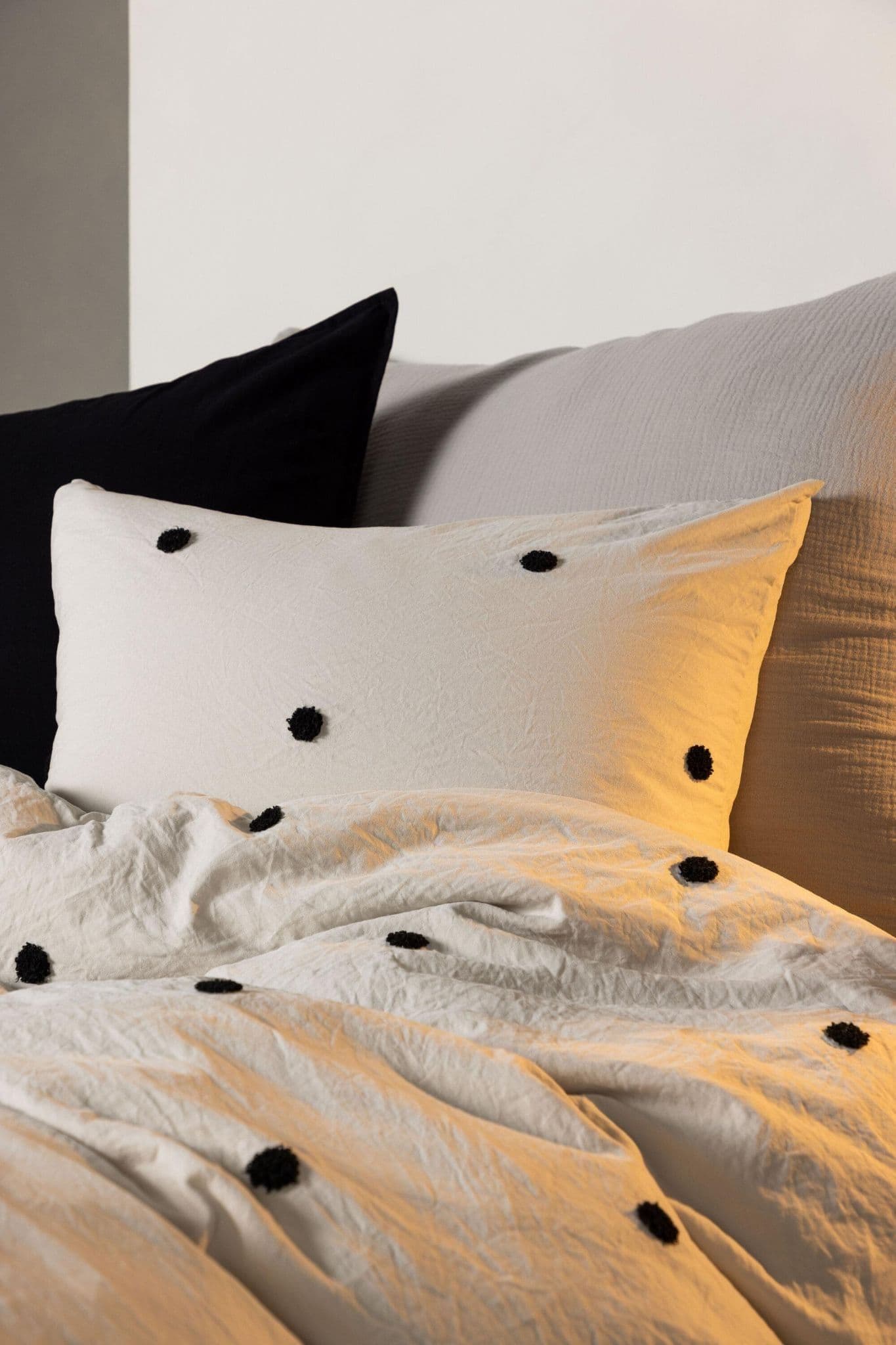 This bed set from the series Loke is just as cuddly to make the bed with as it is nice to sleep on! The bedding is made of durable and comfortable microfiber, which is washable and stands the test of time. The bed set is light gray with black tufted dots that create a lively eye-catcher in trendy colors. Cozy, neat, and nice what more can you want?