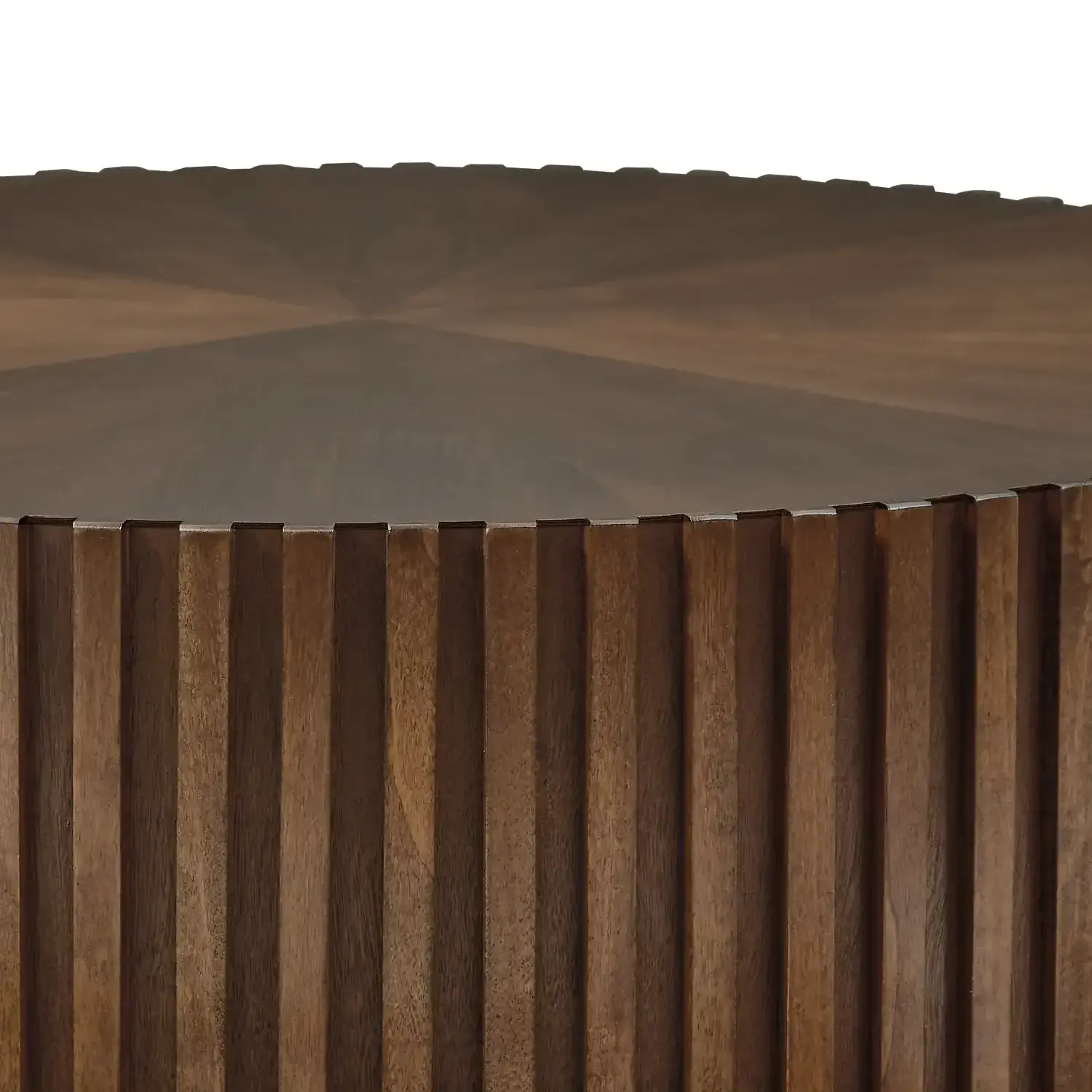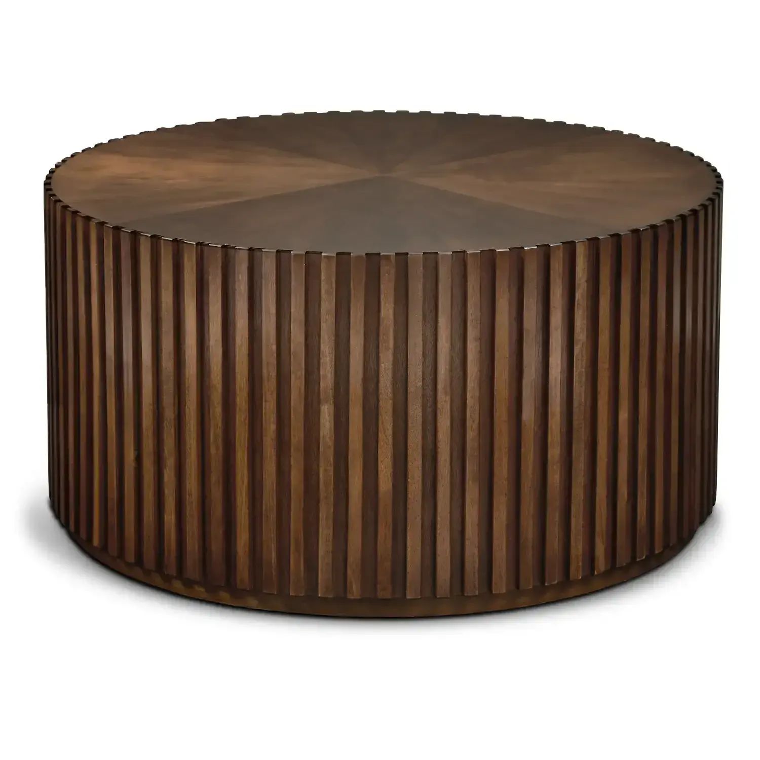 The Madison Round Coffee Table showcases timeless craftsmanship with a modern twist Designed with MDF and solid poplarpine wood it features a smooth brown finish and vertical fluted detailing that adds depth and texture Its bold circular shape makes it a striking centerpiece for any living room.