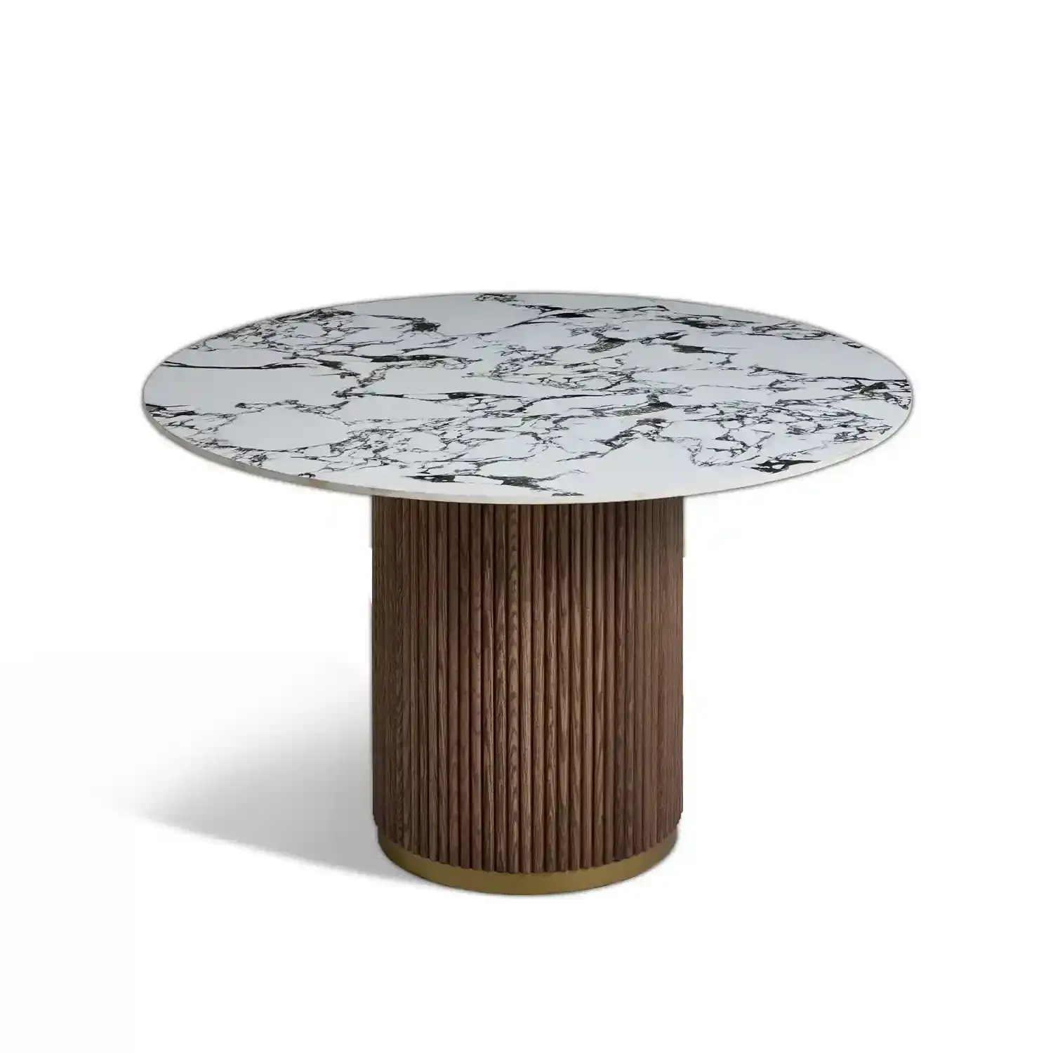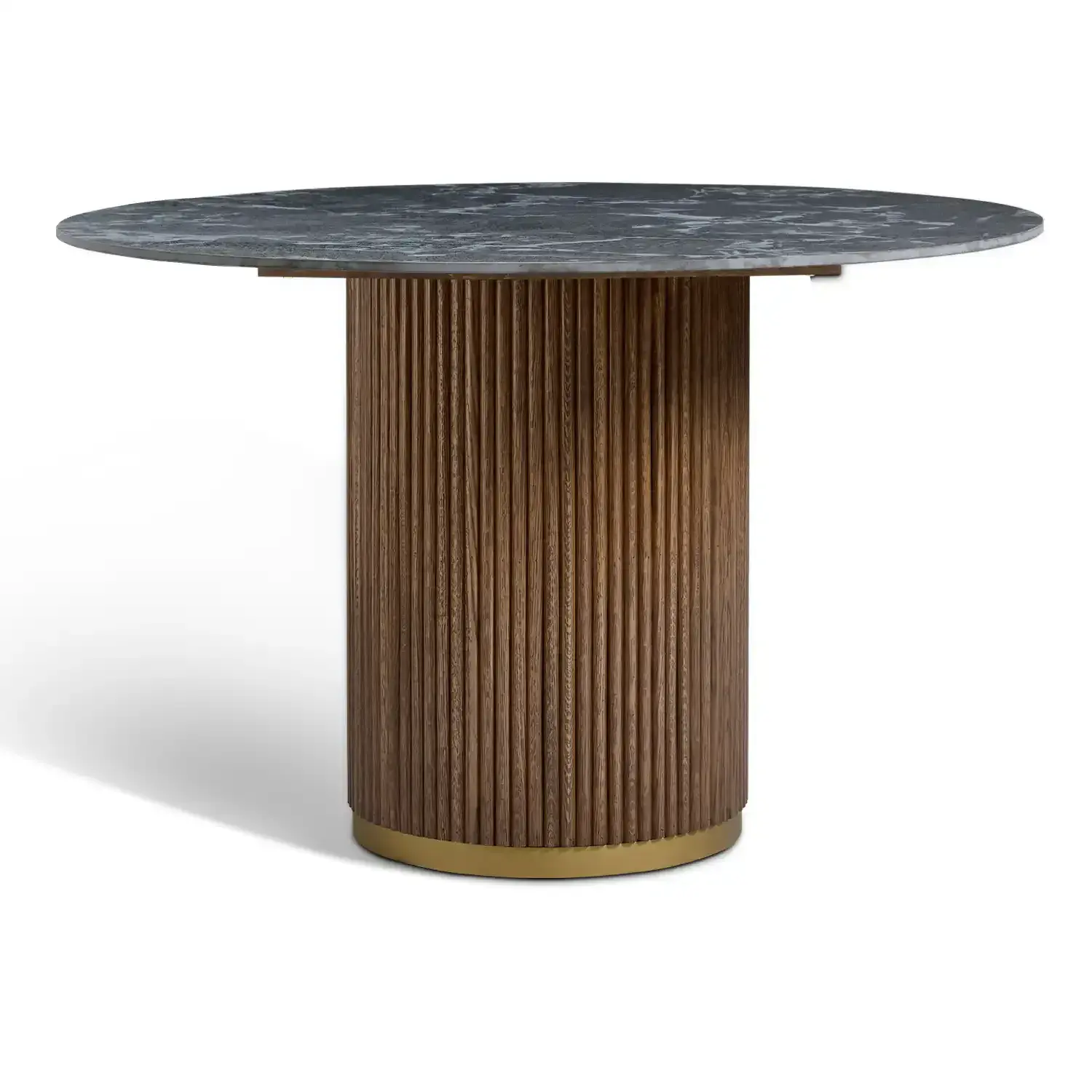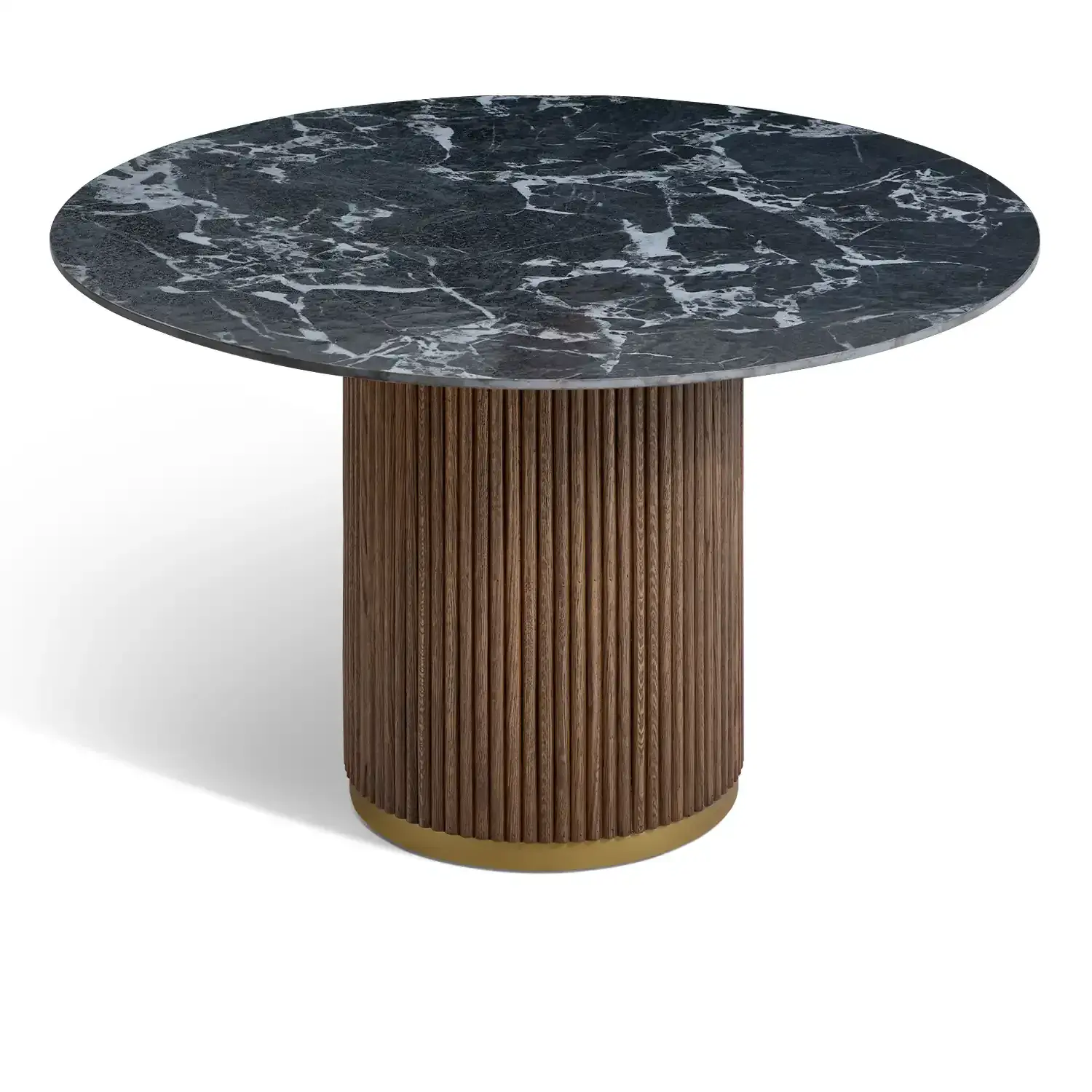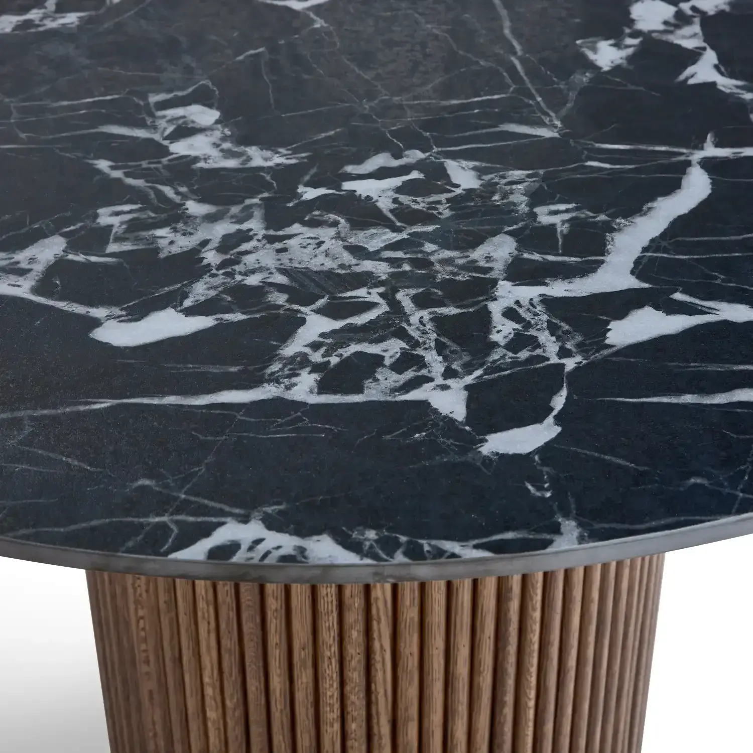 The Marcio Round Dining Table is a perfect blend of modern elegance and natural warmth Featuring a striking black marble effect top and a sturdy cylindrical wooden base with fluted detailing it creates a luxurious focal point for your dining area At 120cm its ideal for family meals and stylish entertaining.