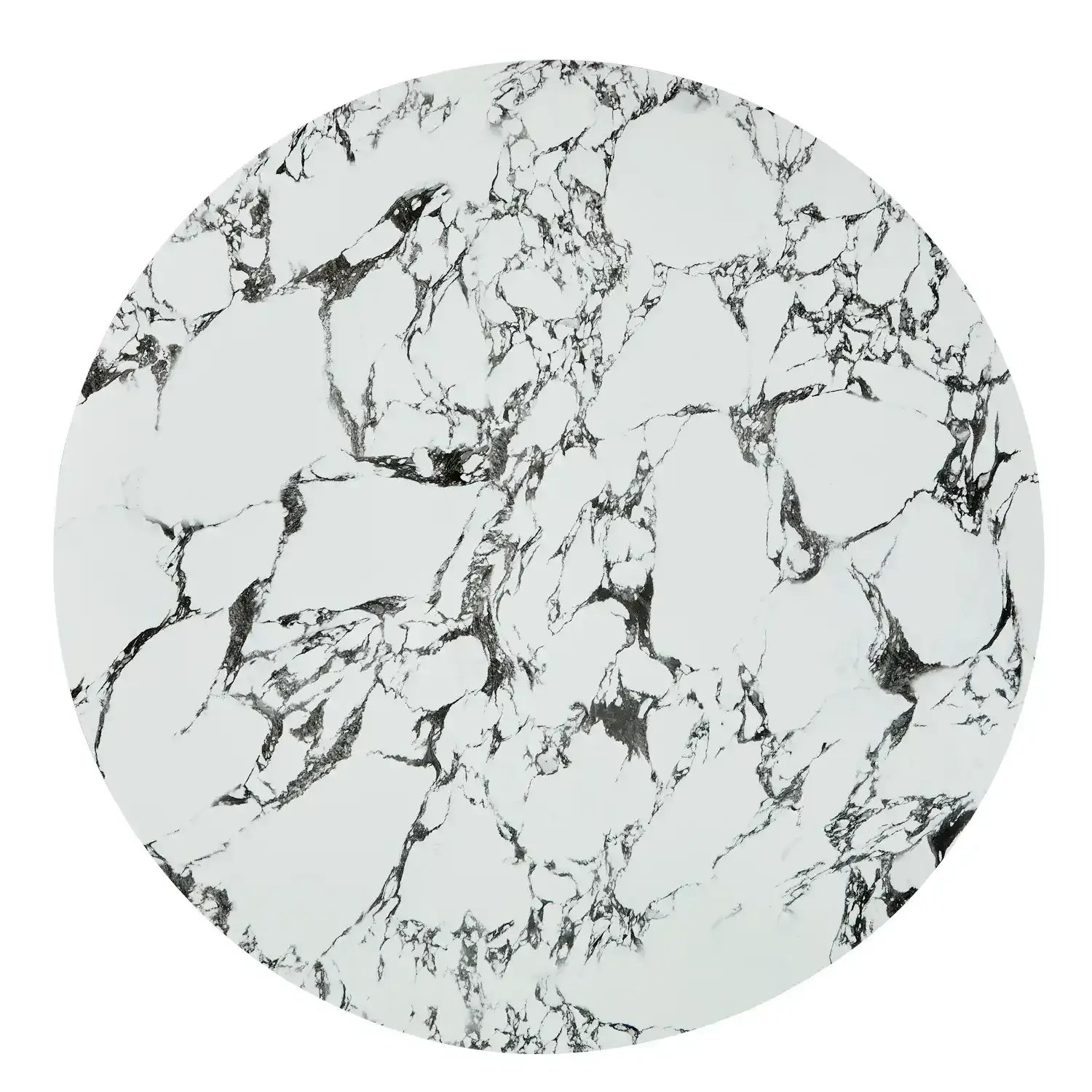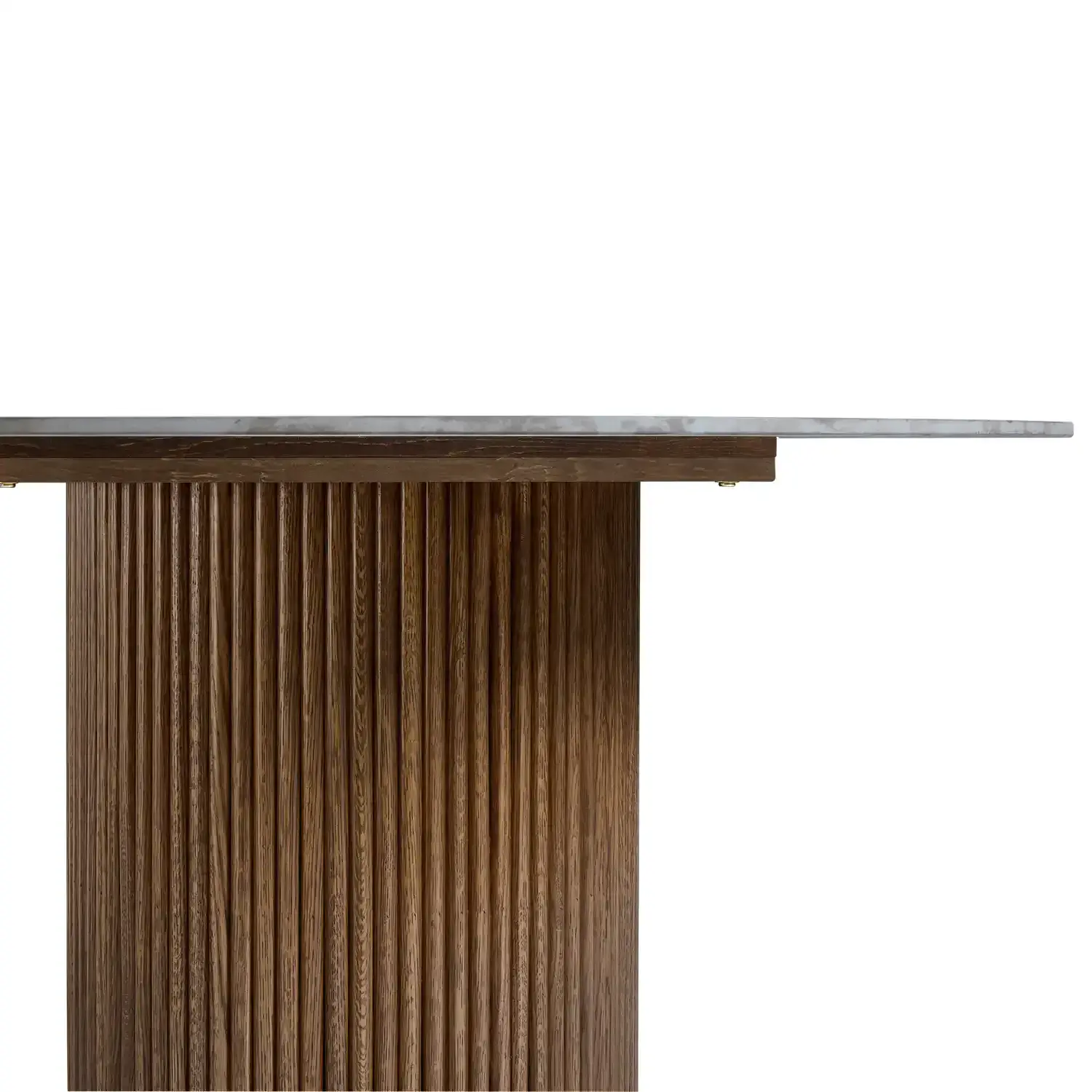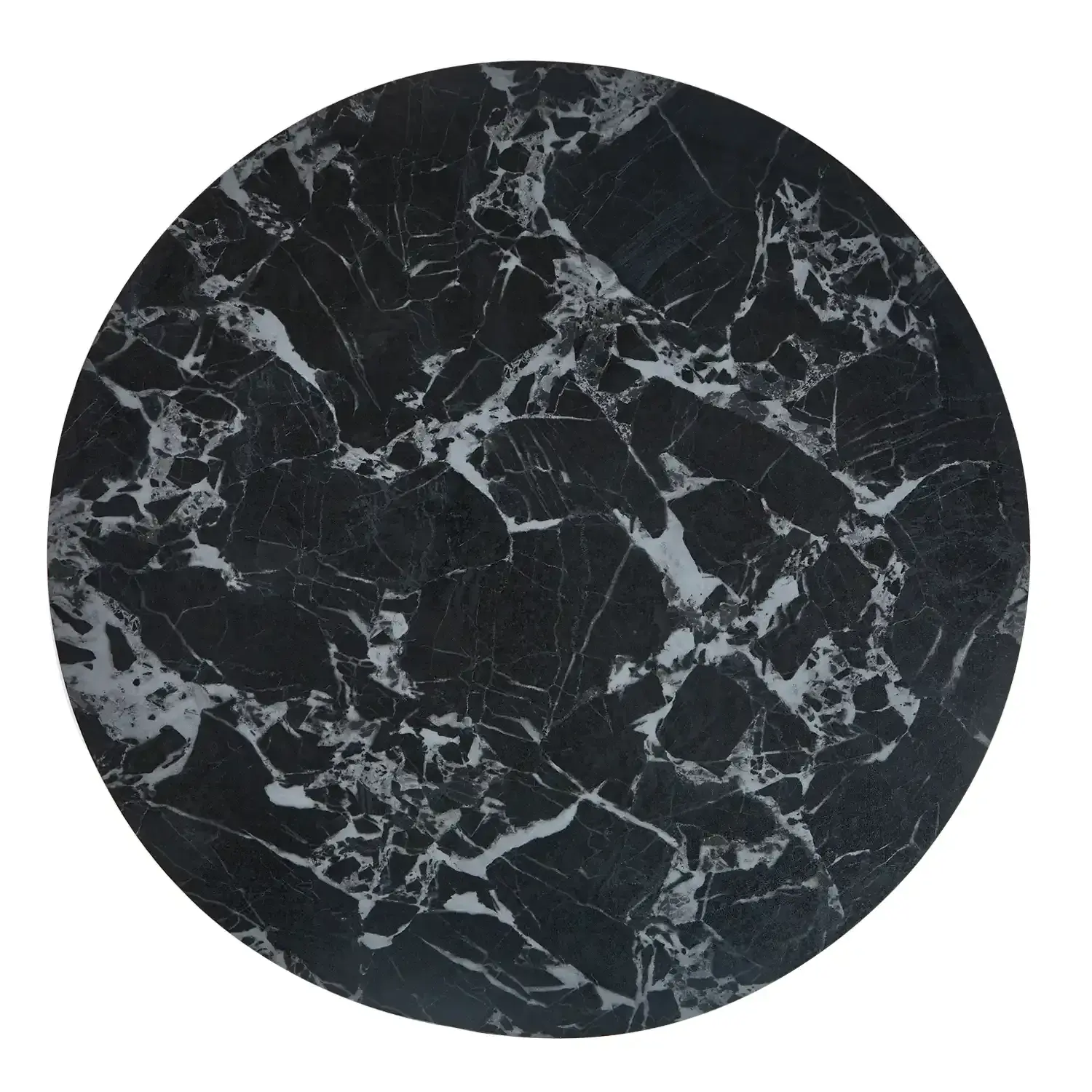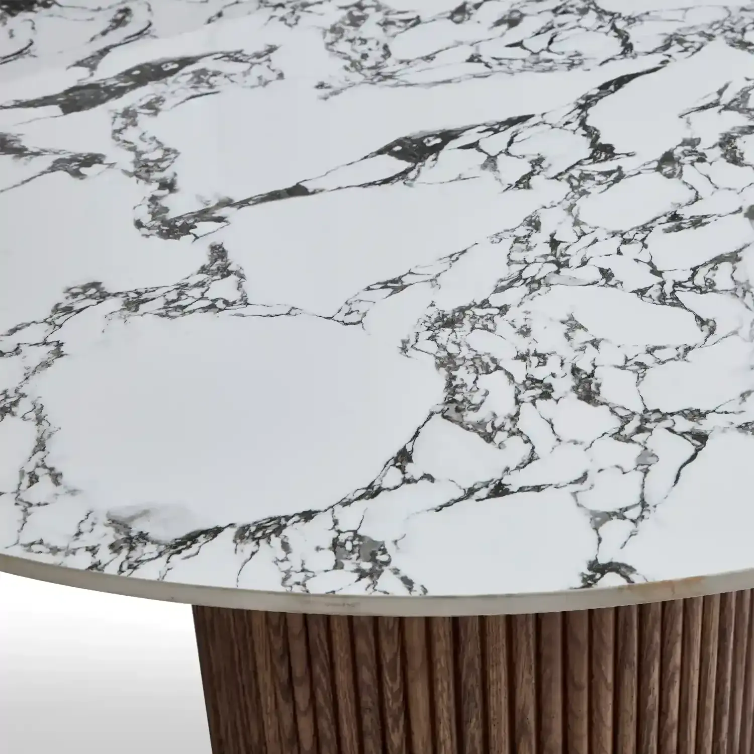 The Marcio Round Dining Table is a perfect blend of modern elegance and natural warmth Featuring a striking black marble effect top and a sturdy cylindrical wooden base with fluted detailing it creates a luxurious focal point for your dining area At 120cm its ideal for family meals and stylish entertaining.