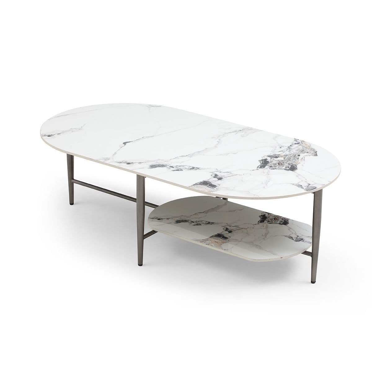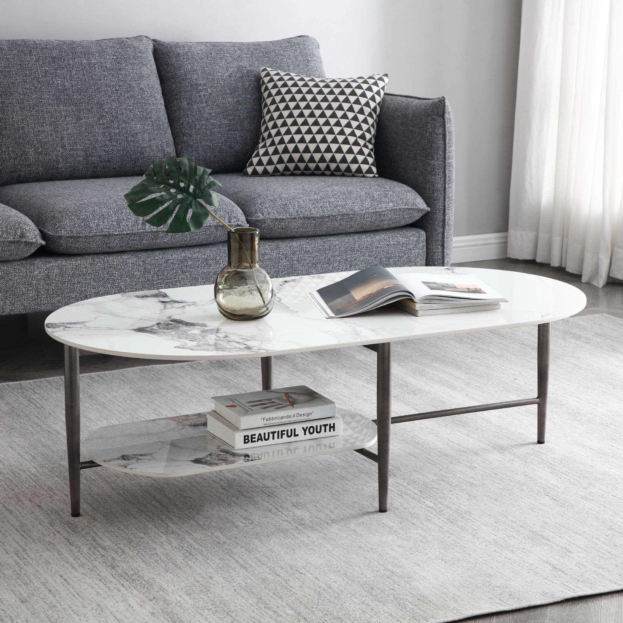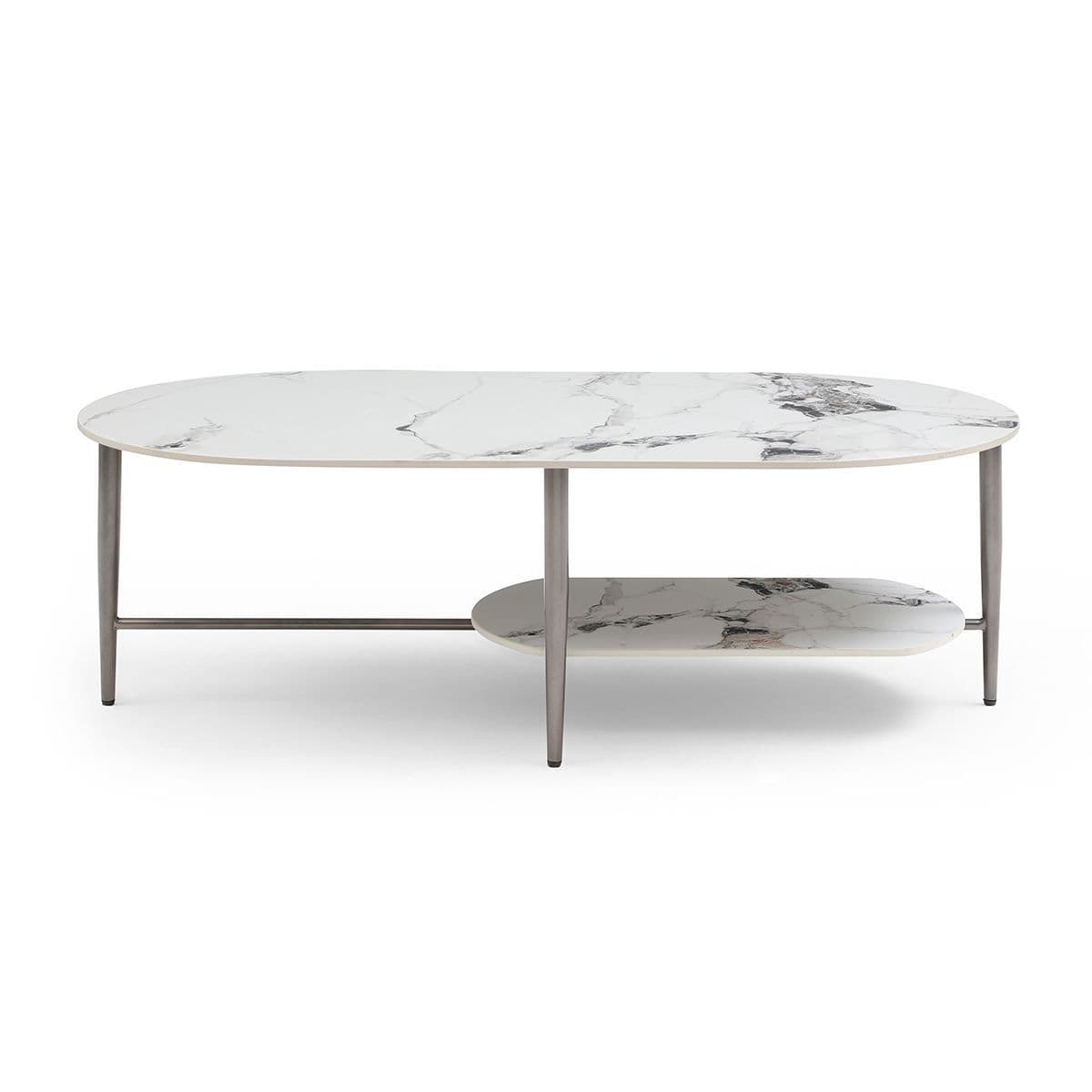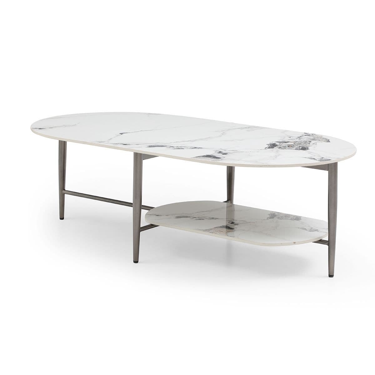 Minimalist Style The coffee table emanates a minimalist design extending the understated elegance seen in contemporary occasional tables Design Emphasis Its design highlights the simplicity of gentle contours rounded edges and the luxurious smoothness of the Sintered top Practical Shelf The table includes a shelf adding both storage capacity and charm to its overall appeal Sturdy Metal Legs The robust metal legs not only contribute to a sleek and modern style but also ensure strong and reliable support Please note the net weight for this table is 229 kg As the table size exceeds the pallet limitation the number 150 kg is used to help the system make the right charge for the oversized pallet service.