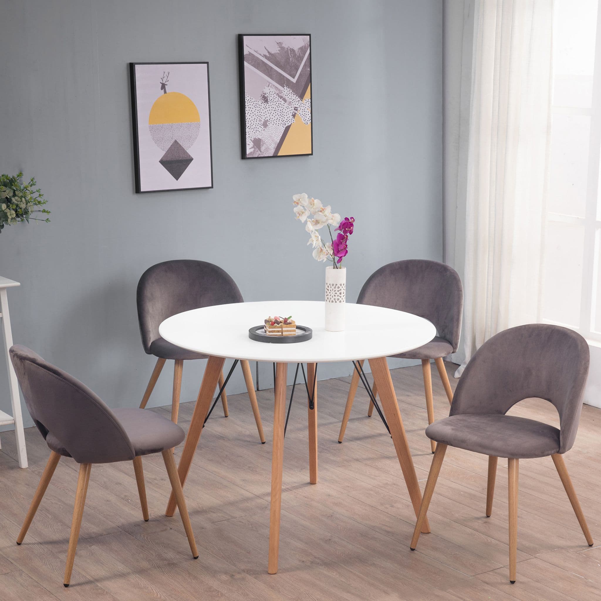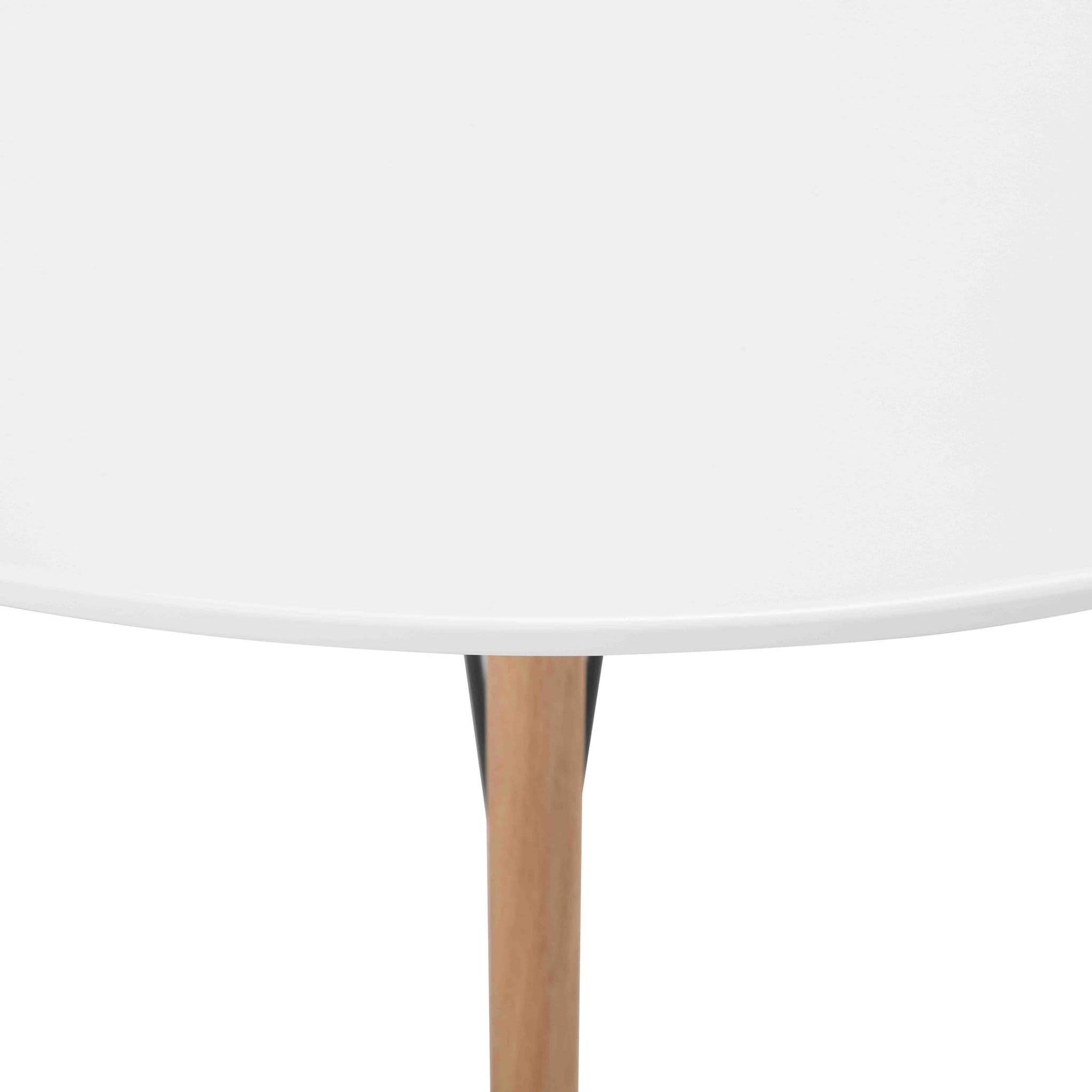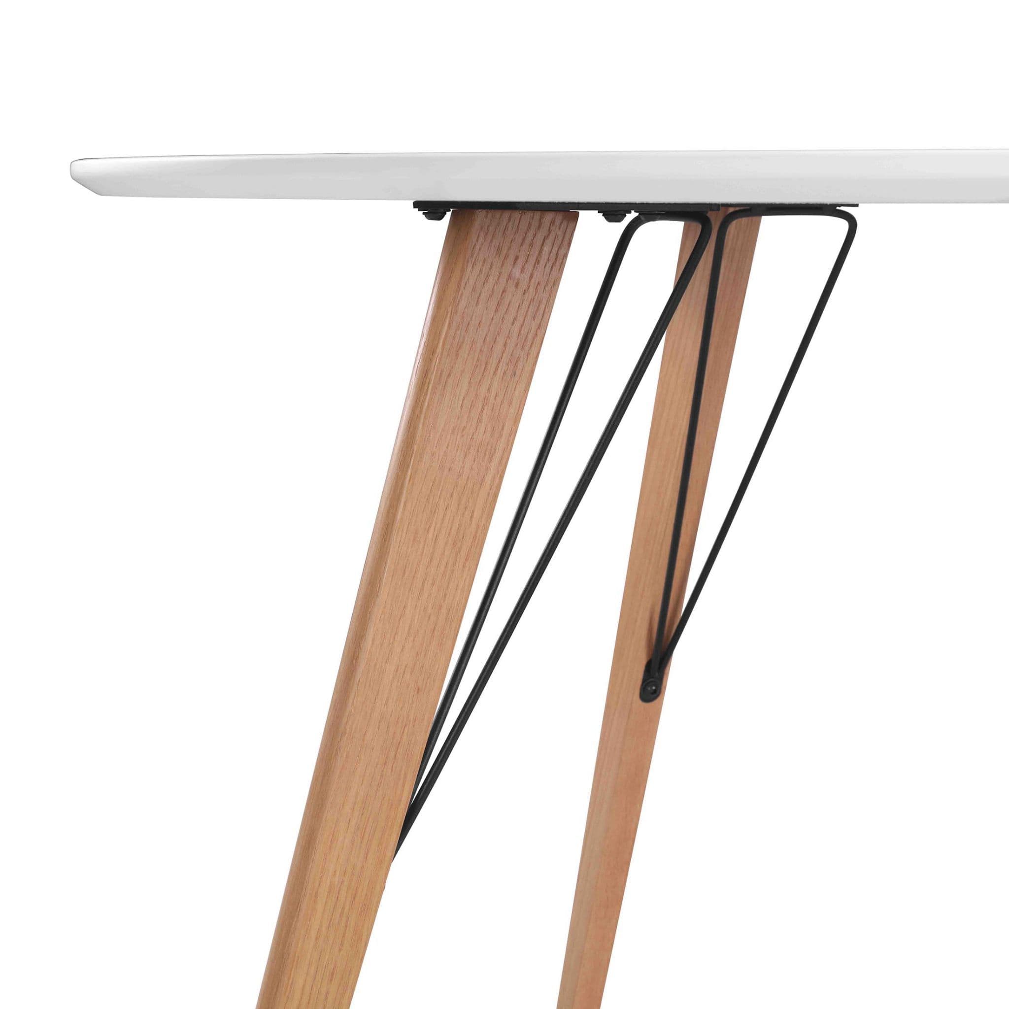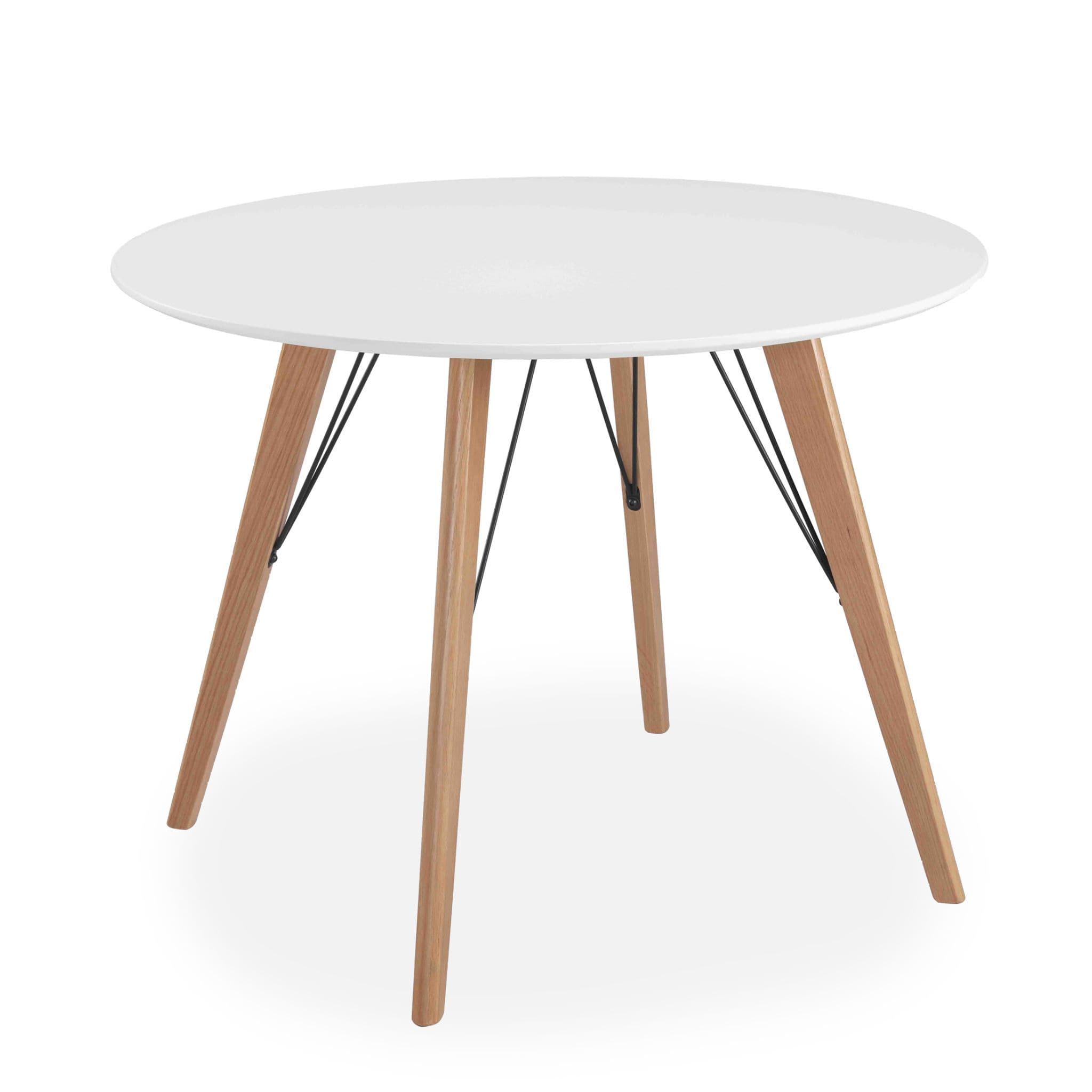 This sleek, rounded dining table is a versatile accent for your kitchen or dining area. Designed for four, it features oak legs and a fixed round top. Built using quality materials and techniques. Comfortably seats four.