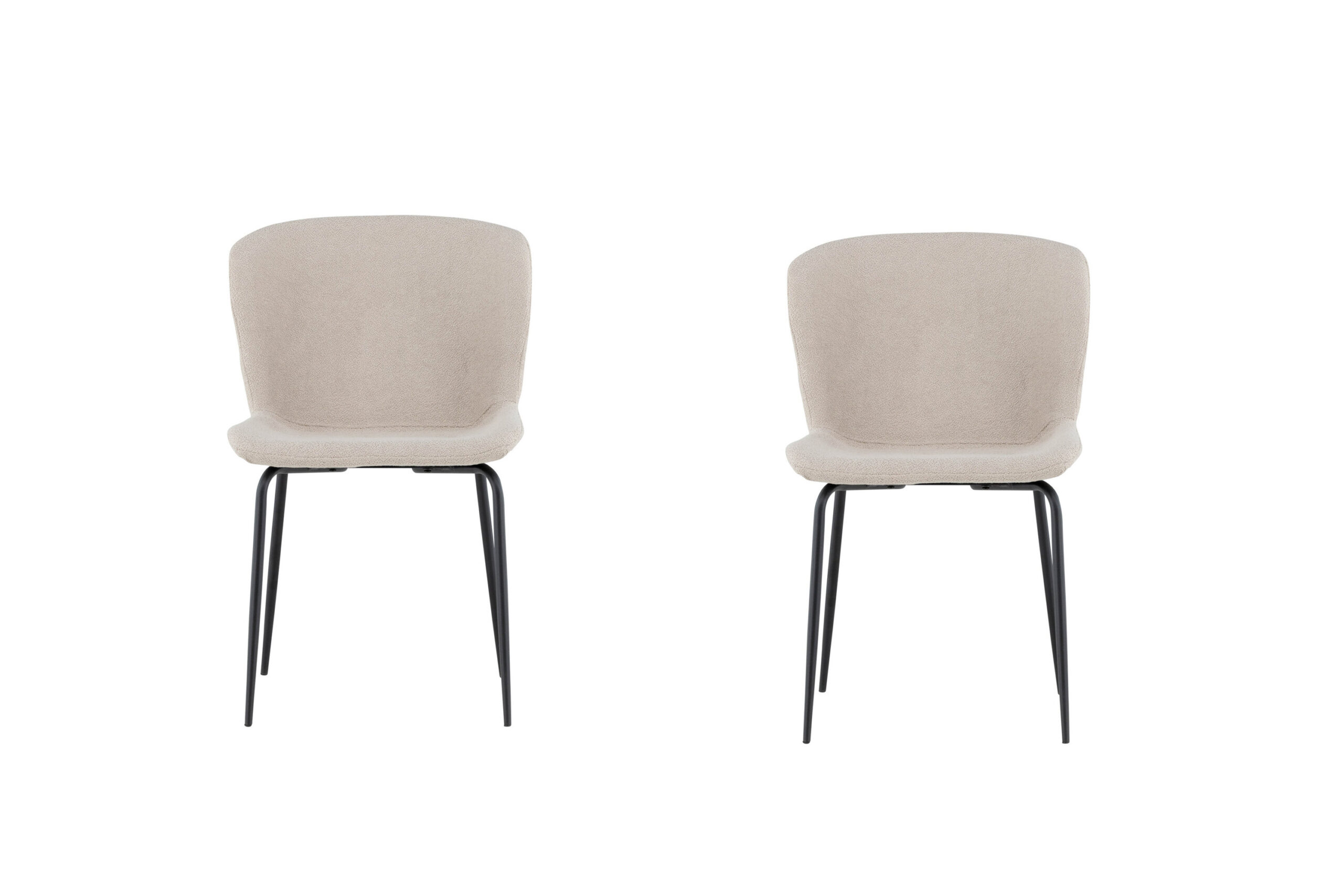 Modesto – our popular dining chair that is both trend-proof and comfortable! Create an inviting atmosphere with this soft dining chair in Scandinavian design. The chair is fully upholstered in beige, furry boucle fabric with slim chair legs in black metal. The slightly rounded back and padded seat cushion provide extra comfort for long meals around the table.