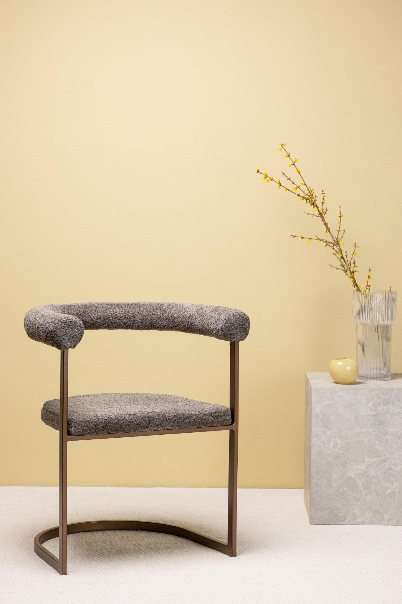 This delicious dining chair from the series Morning in thoughtful design is as comfortable as stylish! The rounded chair back and upholstered the seat is in gray boule fabric and the frame structure in minimalist design is in brown steel. Decorate your home with dining chairs that you are happy to stay in for a long time and enjoy pleasant meals with loved ones!