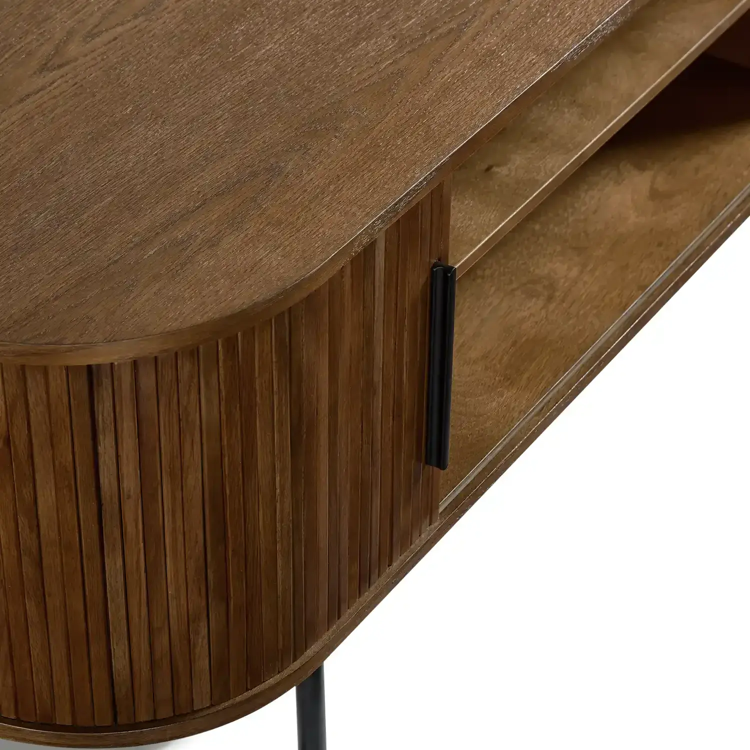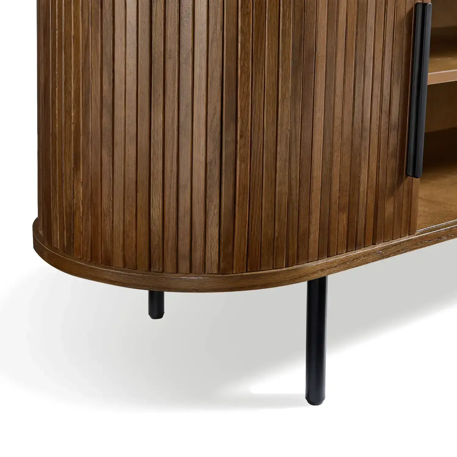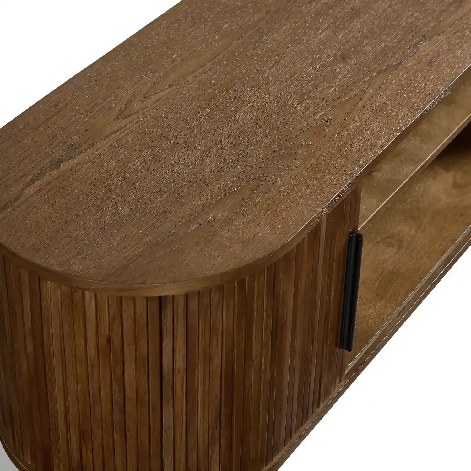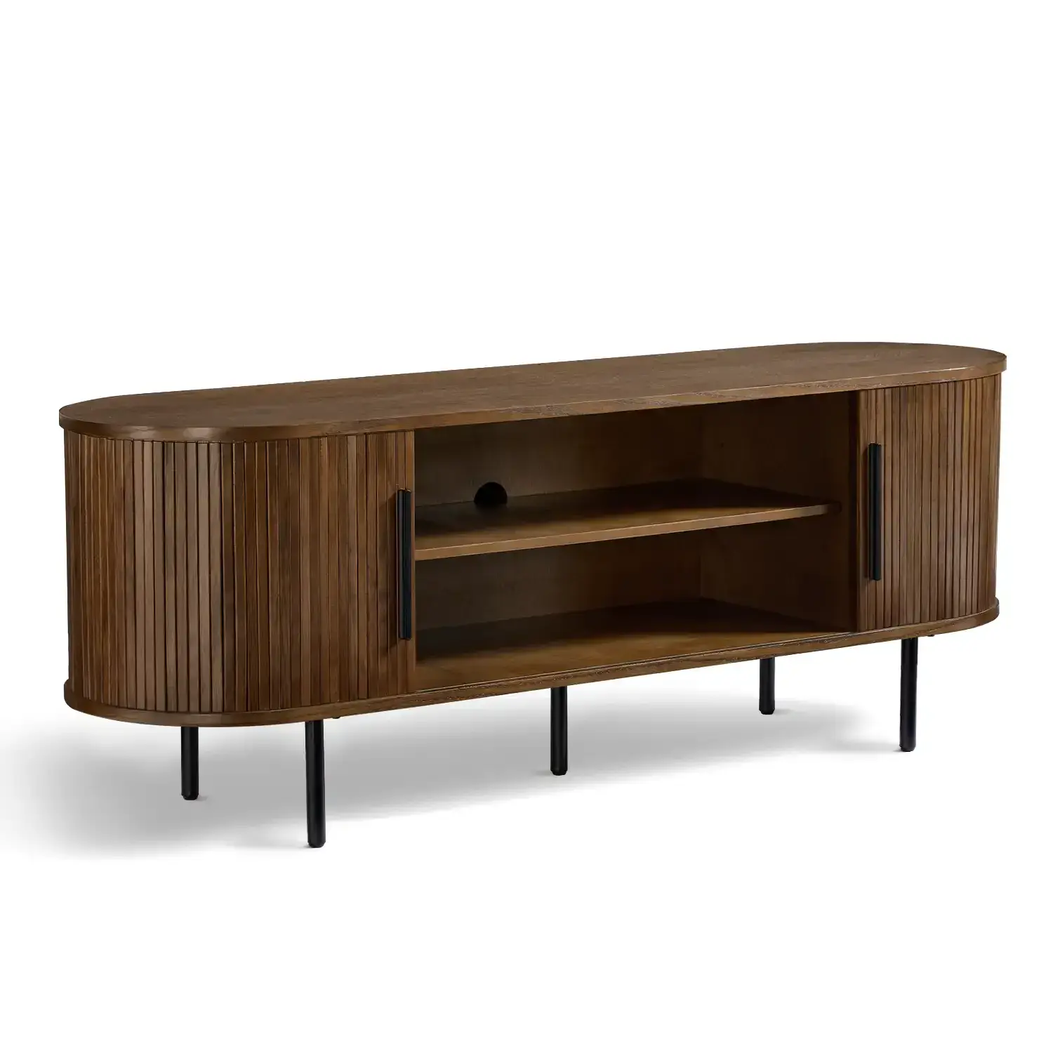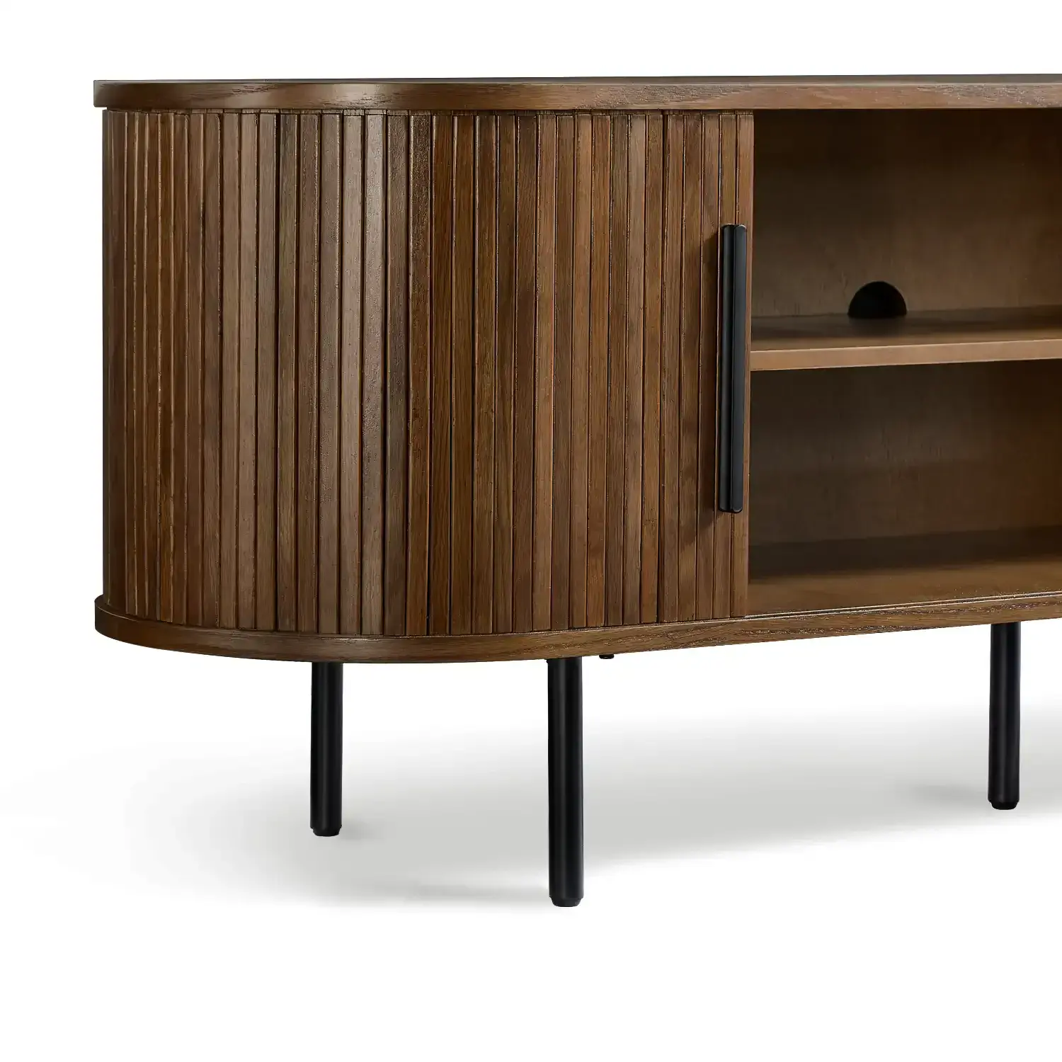 The Orion TV Cabinet blends natural warmth with modern design Crafted with an MDF top covered in red oak veneer solid red oak wood doors and sturdy black metal legs it offers both durability and style The rounded edges and slatted door design bring a contemporary touch while the open shelving and side storage provide space for your media essentials.