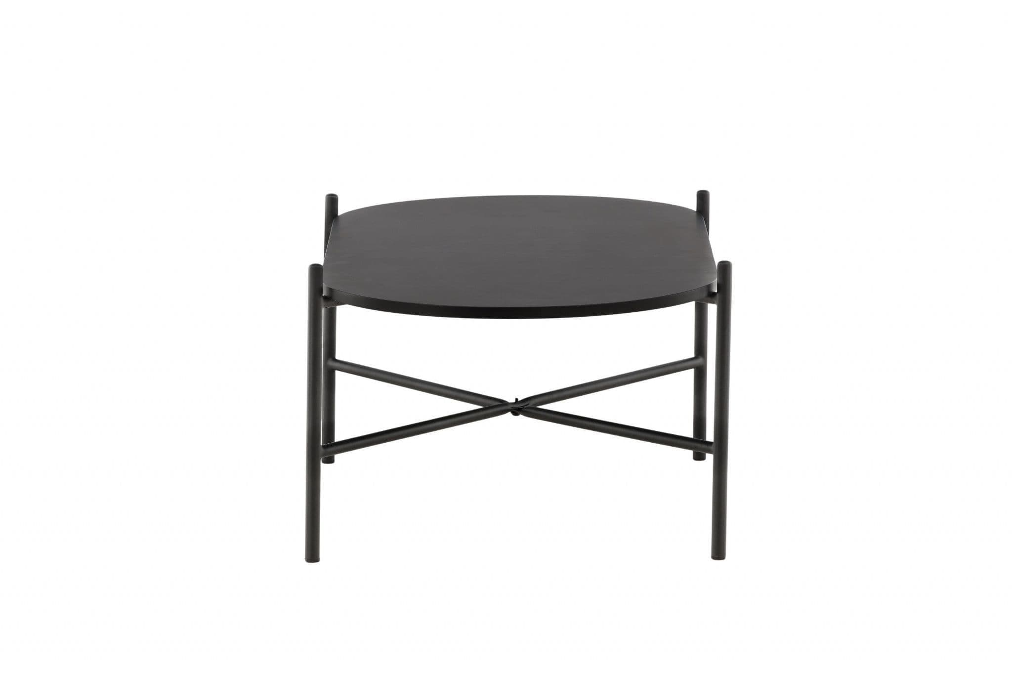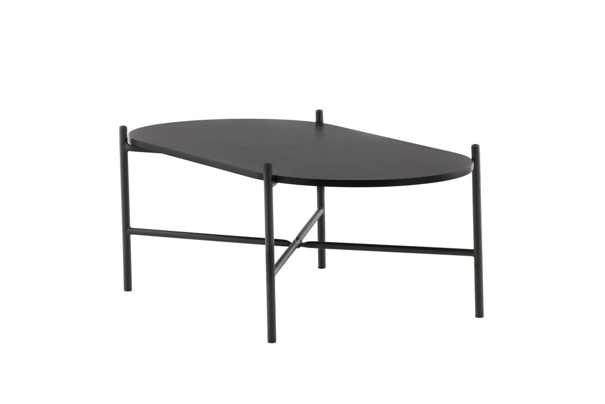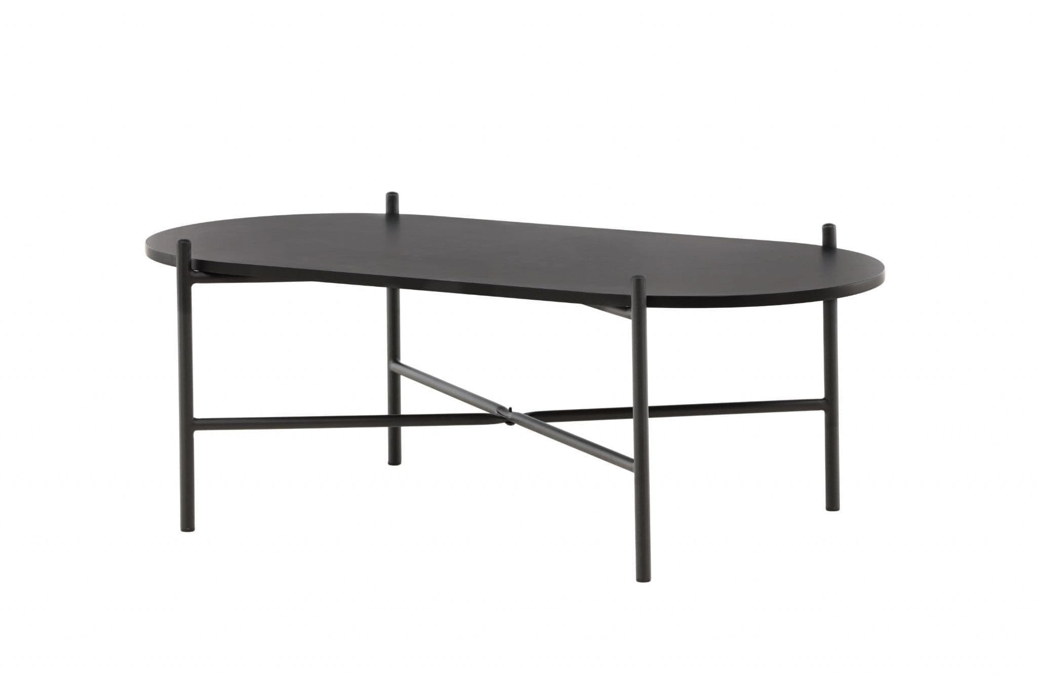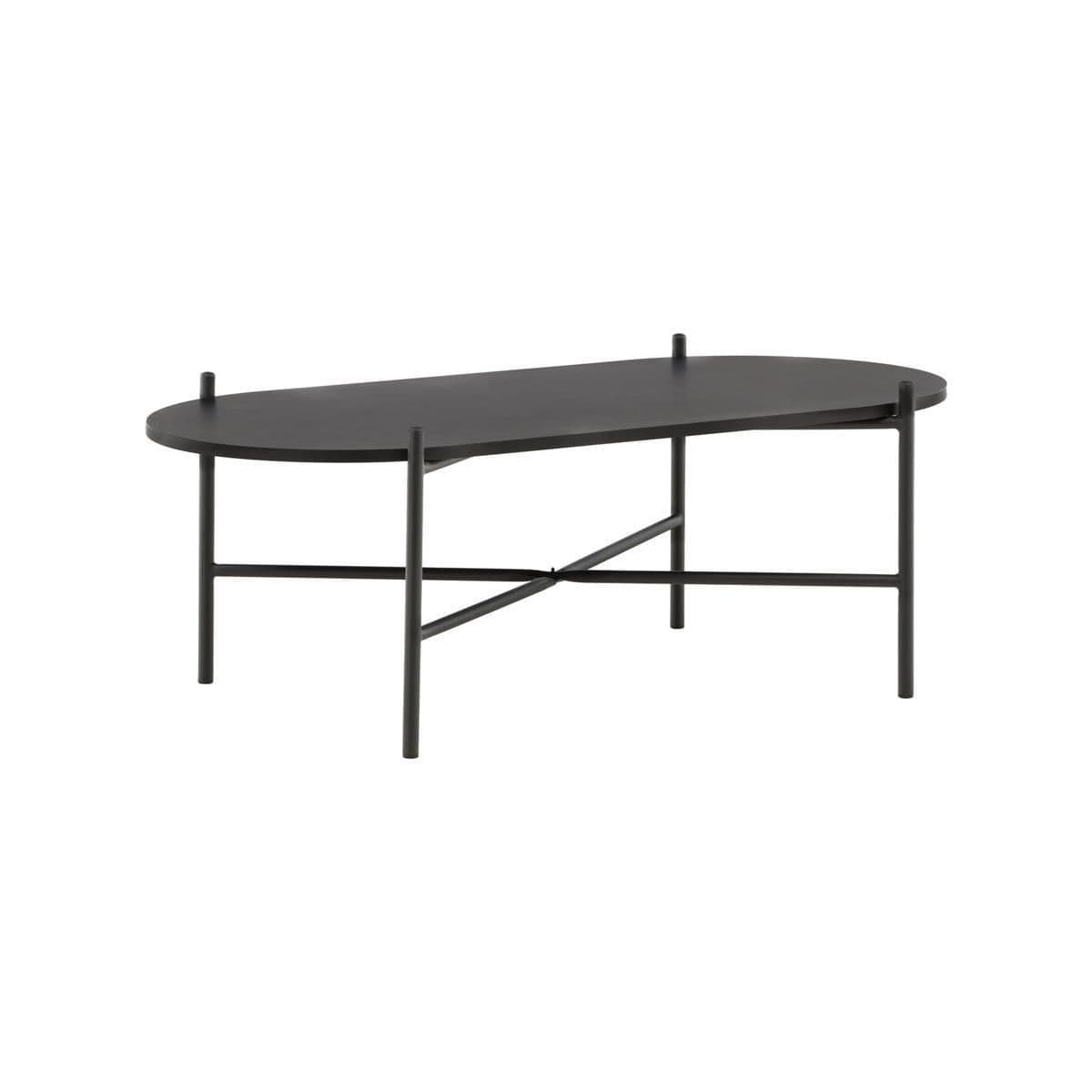 Pueblo coffee table: Scandinavian character with an oval black MDF top and a minimalist black steel frame. The airy base and generous surface create a stylish, spacious feel in the room.