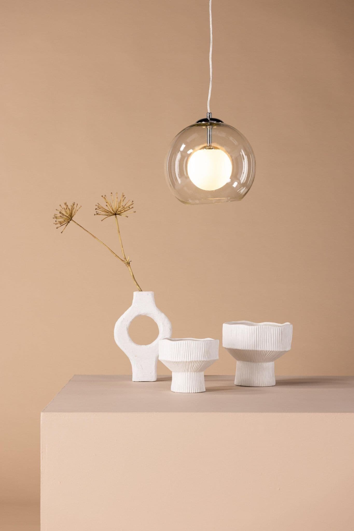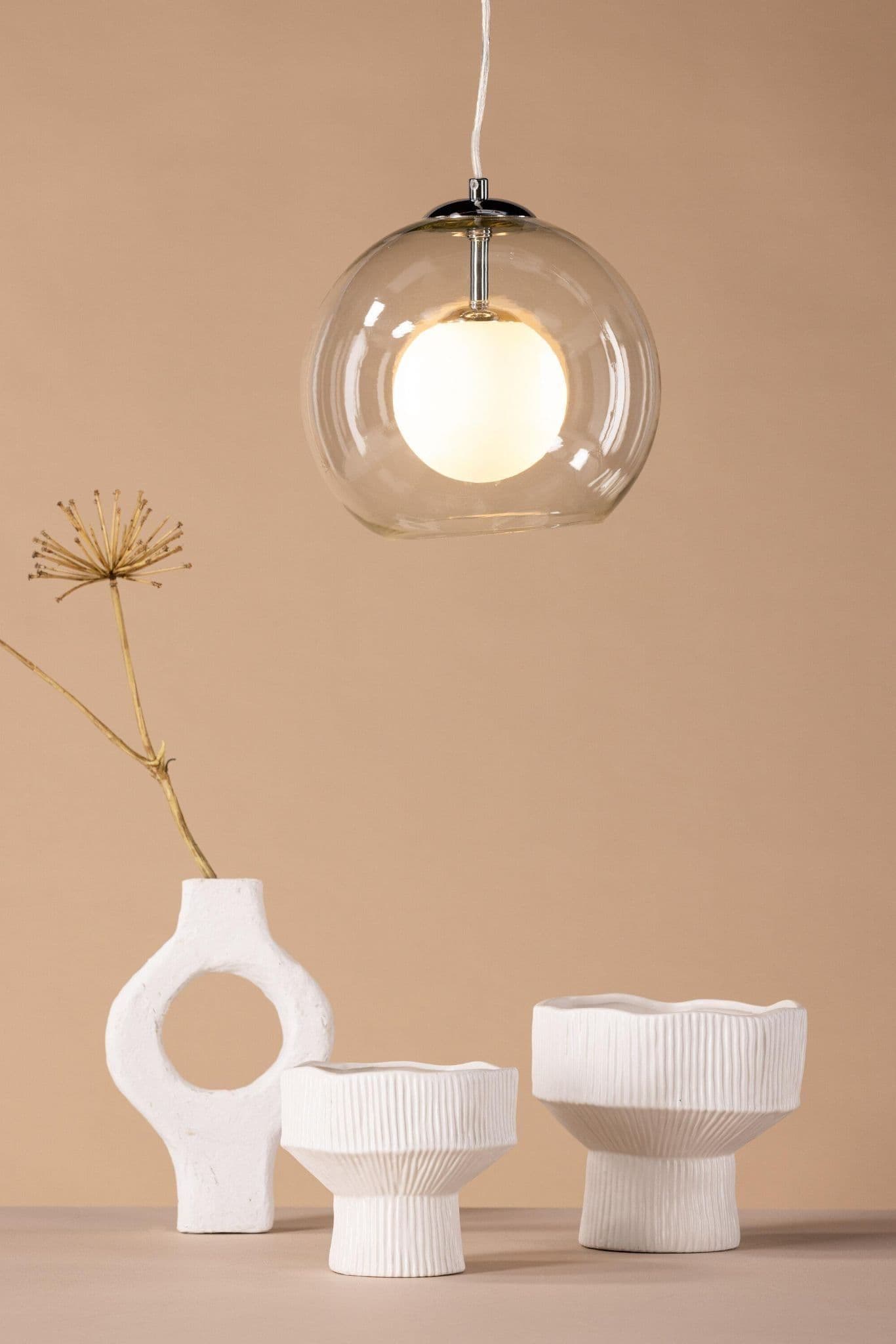 With Roche ceiling lamp you get an elegant and stylish lamp to hang over the dining table, coffee table or in the bedroom. The lamp has a pretty bracket in silvery iron and a round lamp shade in transparent glass that gives a beautiful light. With its simple design, this lamp fits in most rooms and interior styles and is not a lamp you get tired of in the first place.