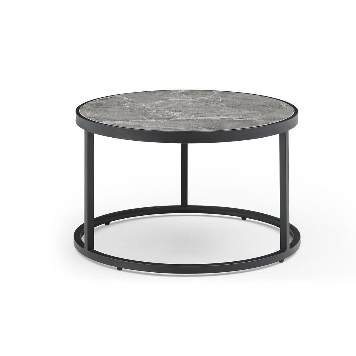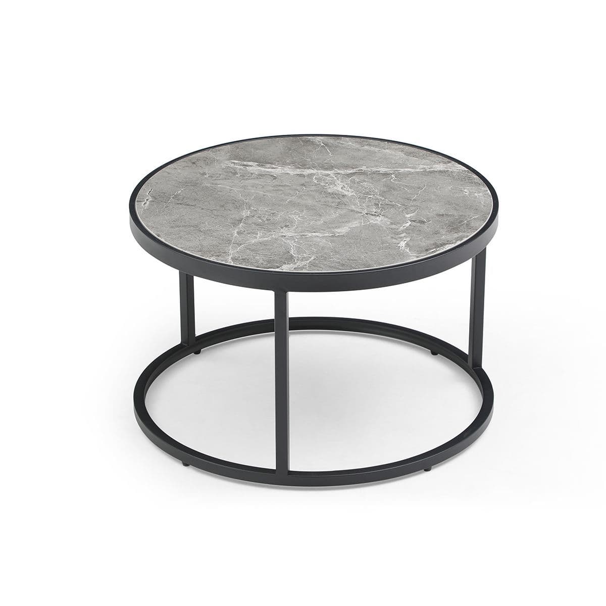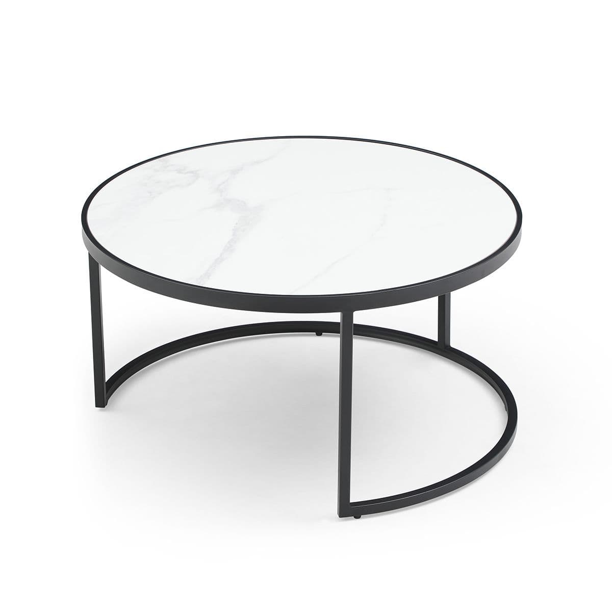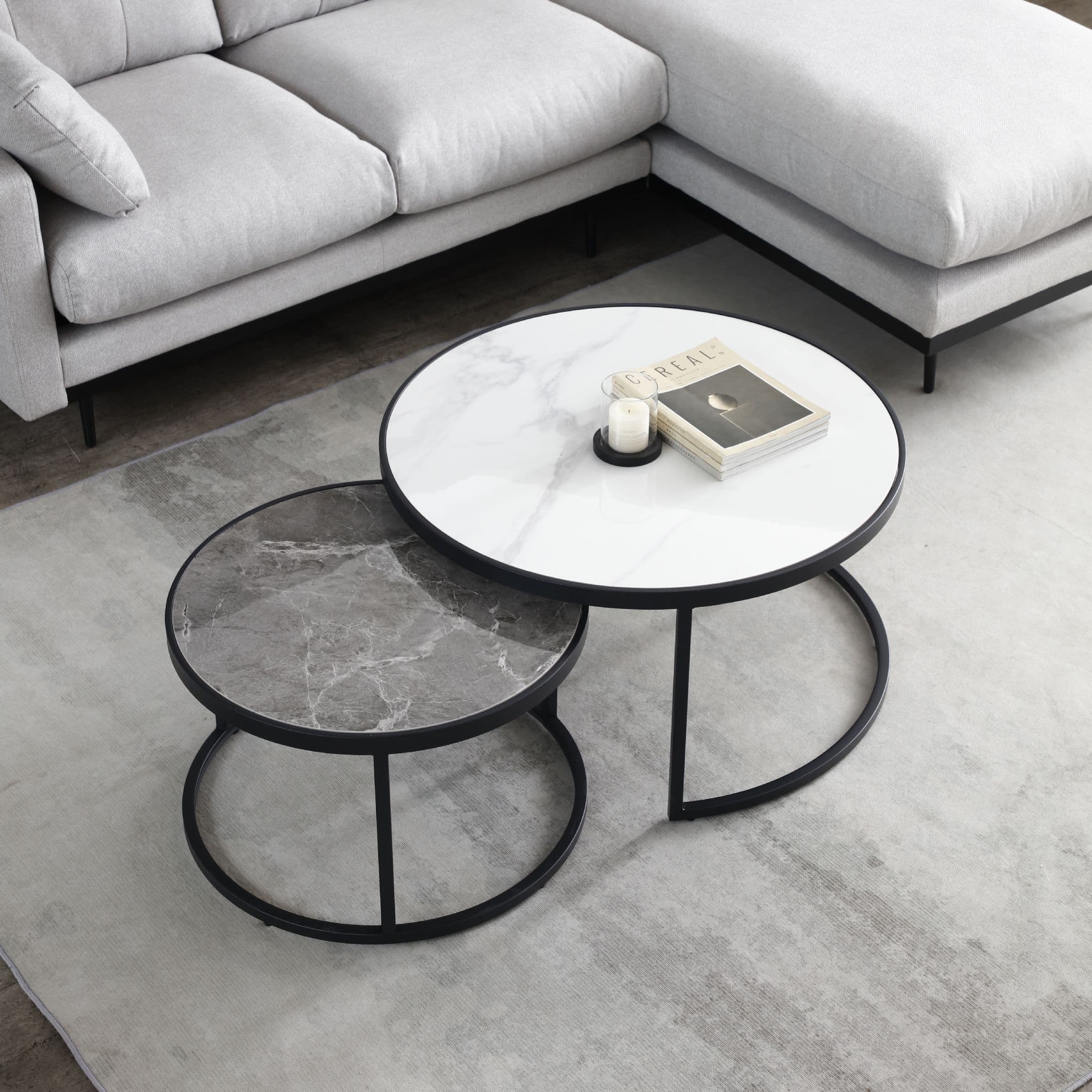 Versatile Design This new round nesting coffee table seamlessly blends modern aesthetics with practical functionality offering a versatile solution for your dining space The nesting feature adds a layer of convenience allowing you to save space when needed Store the smaller table neatly under the larger one offering flexibility in your living arrangements Premium Sintered Stone Finish Sintered stone finish that not only adds sophistication but also ensures long term durability and easy maintenance The surface is resistant to stains and scratches making it perfect for daily use Sleek Aesthetic The large white table paired with a grey small table creates a chic and contemporary aesthetic and highlighted by a sleek black metal base The stylish yet sturdy construction makes it a statement piece that seamlessly integrates into various interior styles Sturdy Support Supported by a robust black metal base this table not only boasts a sleek design but also provides stable and reliable support for all your dining needs Large Table Height 43cm x Width 80cm x Depth 80cm x Diameter 80cm Small Table Height 38cm x Width 60cm x Depth 60cm x Diameter 60cm.