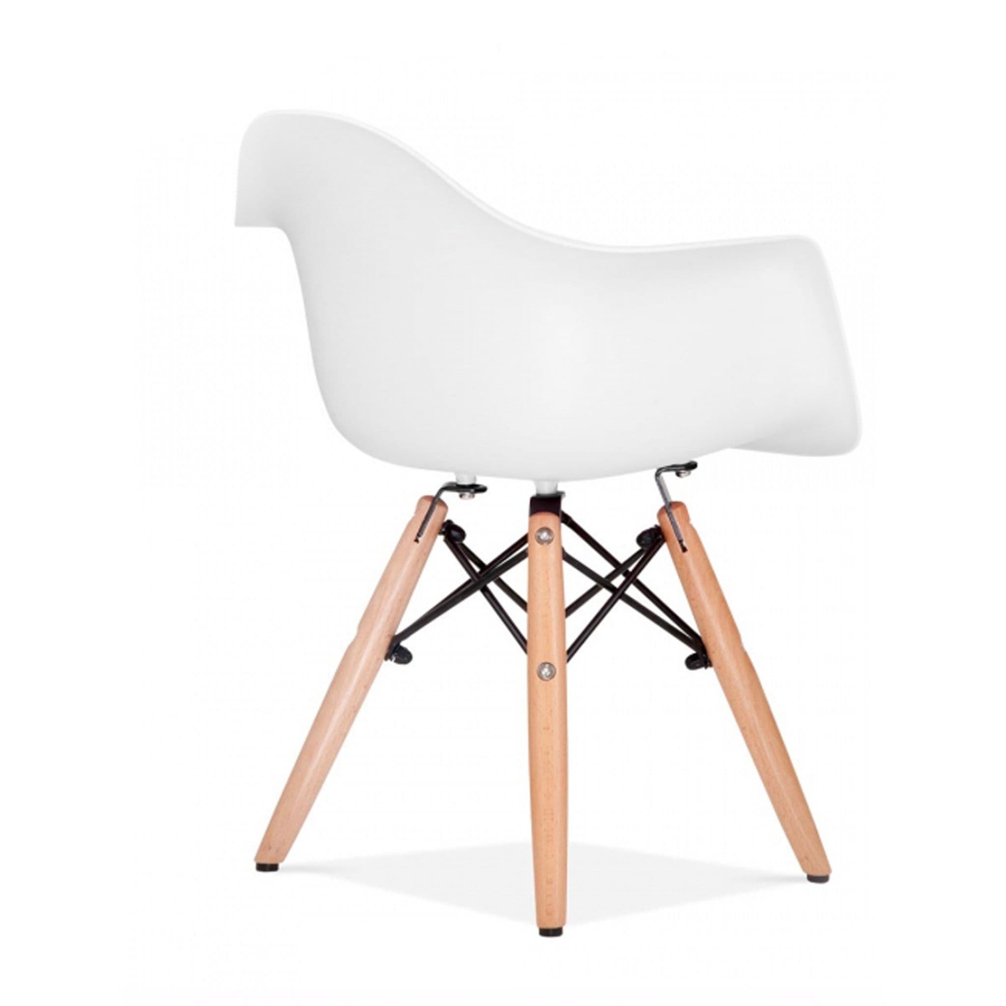 This ultra-stylish, comfortable chair is inspired by the Eames DSW and made from a moulded shell, redesigned to fit children. It comes in various colour options and is extremely practical while remaining effortlessly stylish and modern. The sleek, rounded armchair is supported by solid wood legs with a metal Eiffel-design insert for style and stability. Perfectly suited to our Mmilo Mini Eiffel Table.