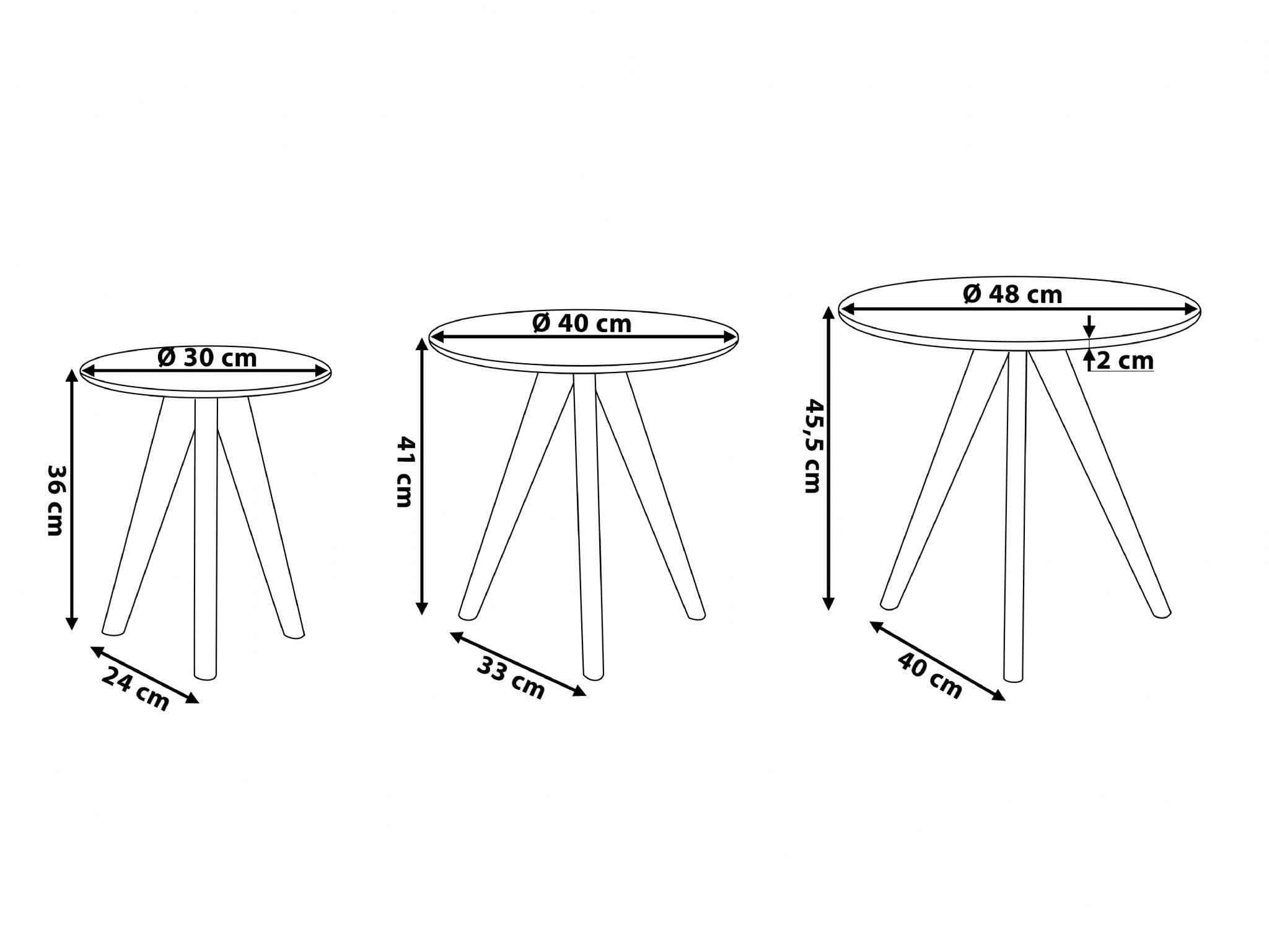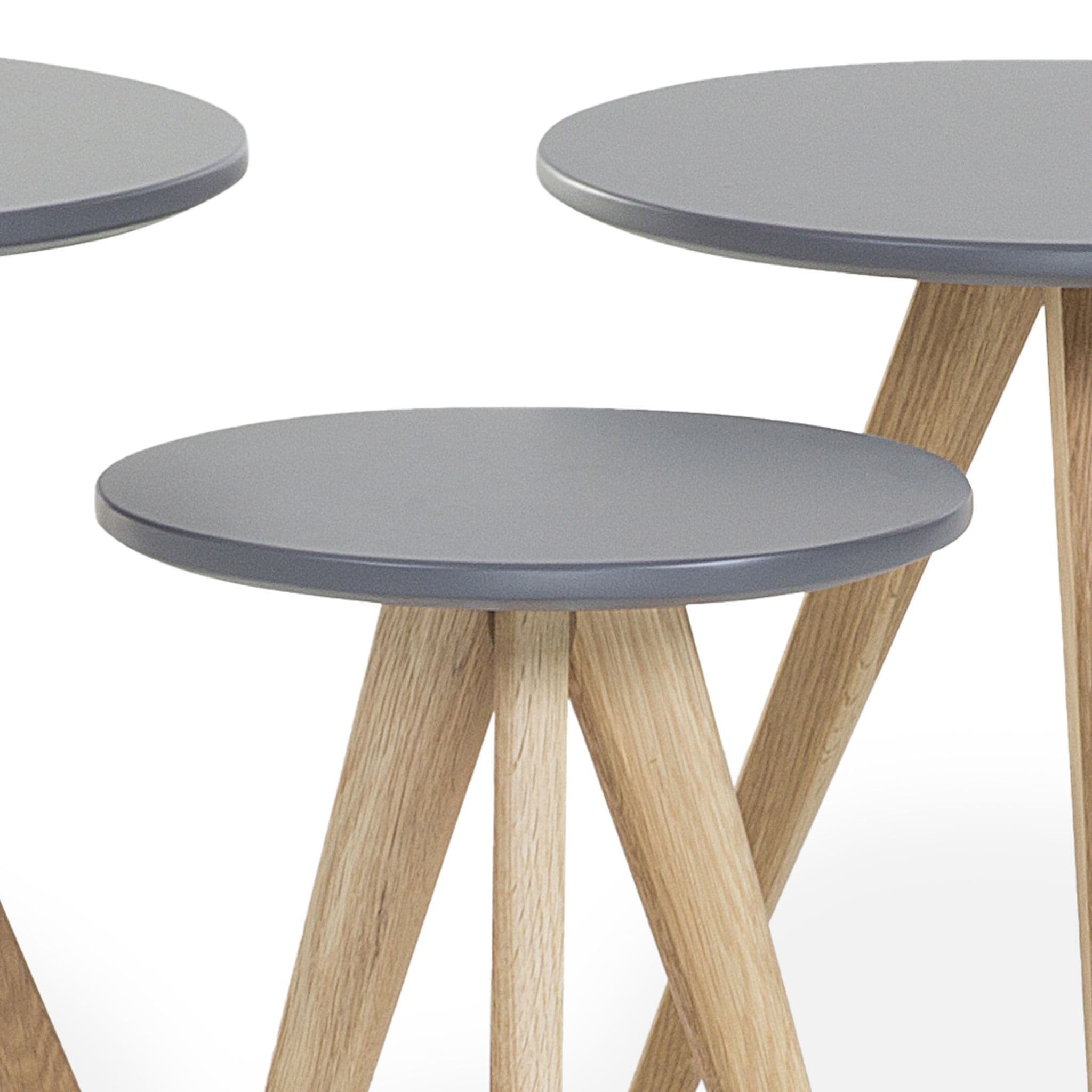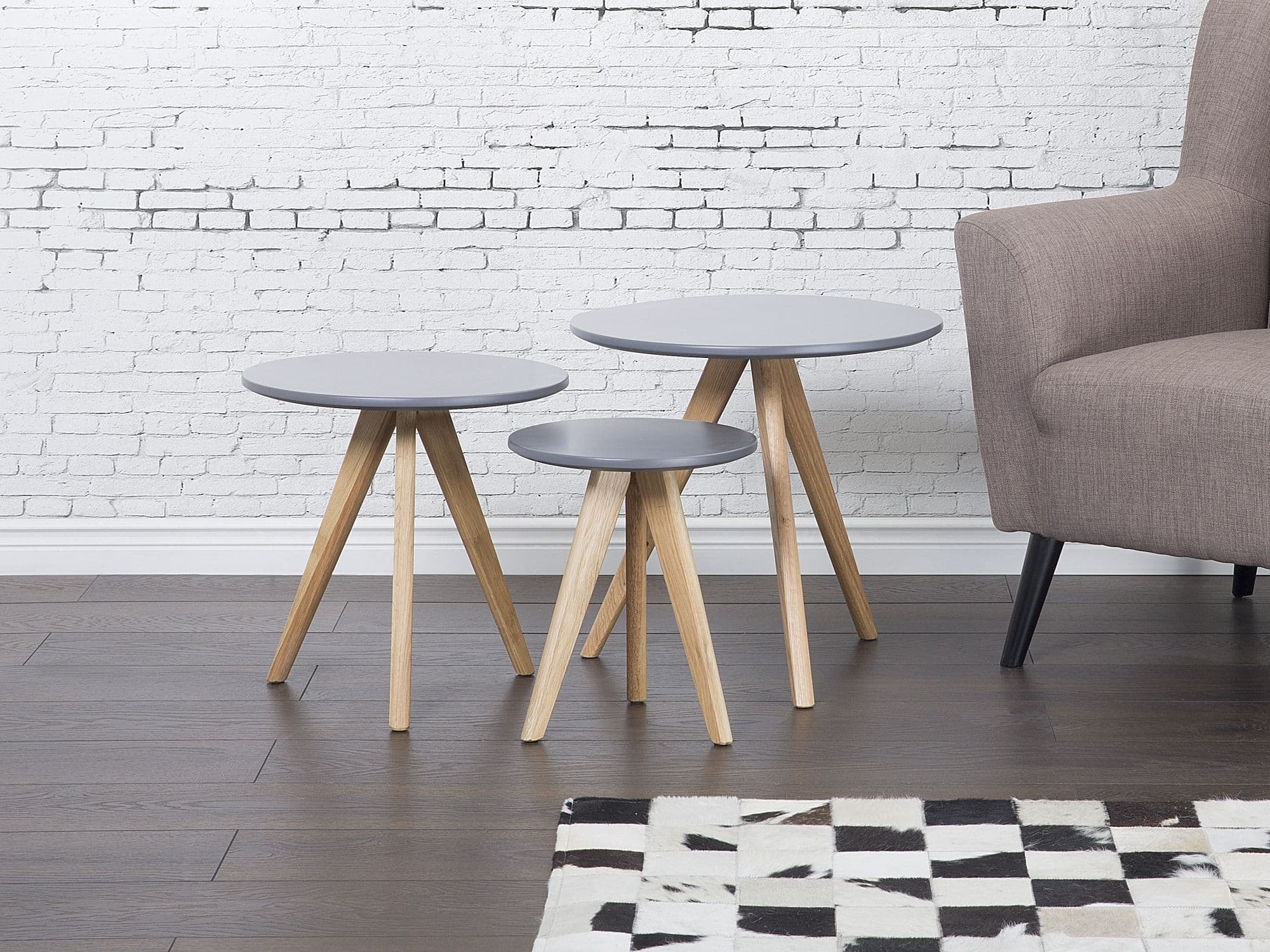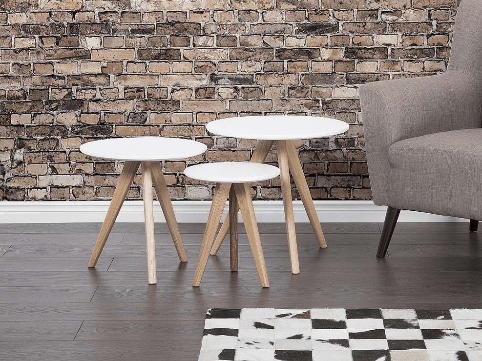 This three-piece table set is a popular choice because the tables can be used in many ways. Use them as small coffee tables, side tables, or activity tables for kids. Made from MDF and coated with a matte-white finish, they re easy to wipe clean and stay looking new after prolonged use. The oak legs make these tables small yet extremely durable. Perfect for any modern home.