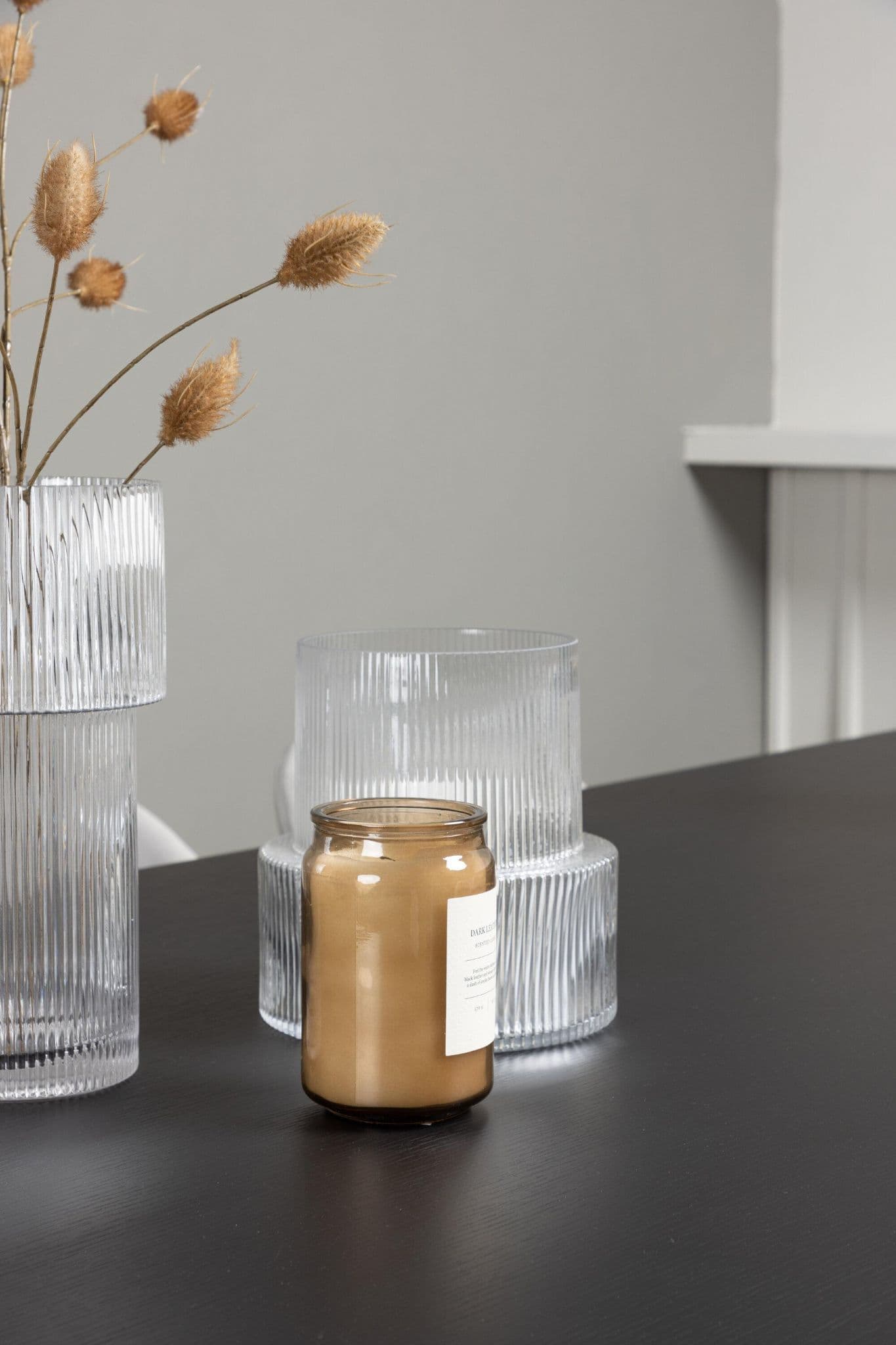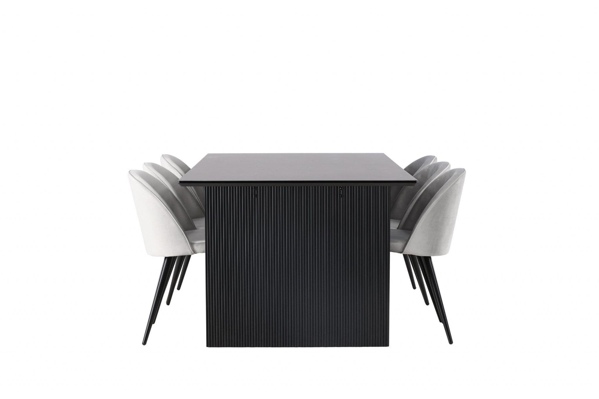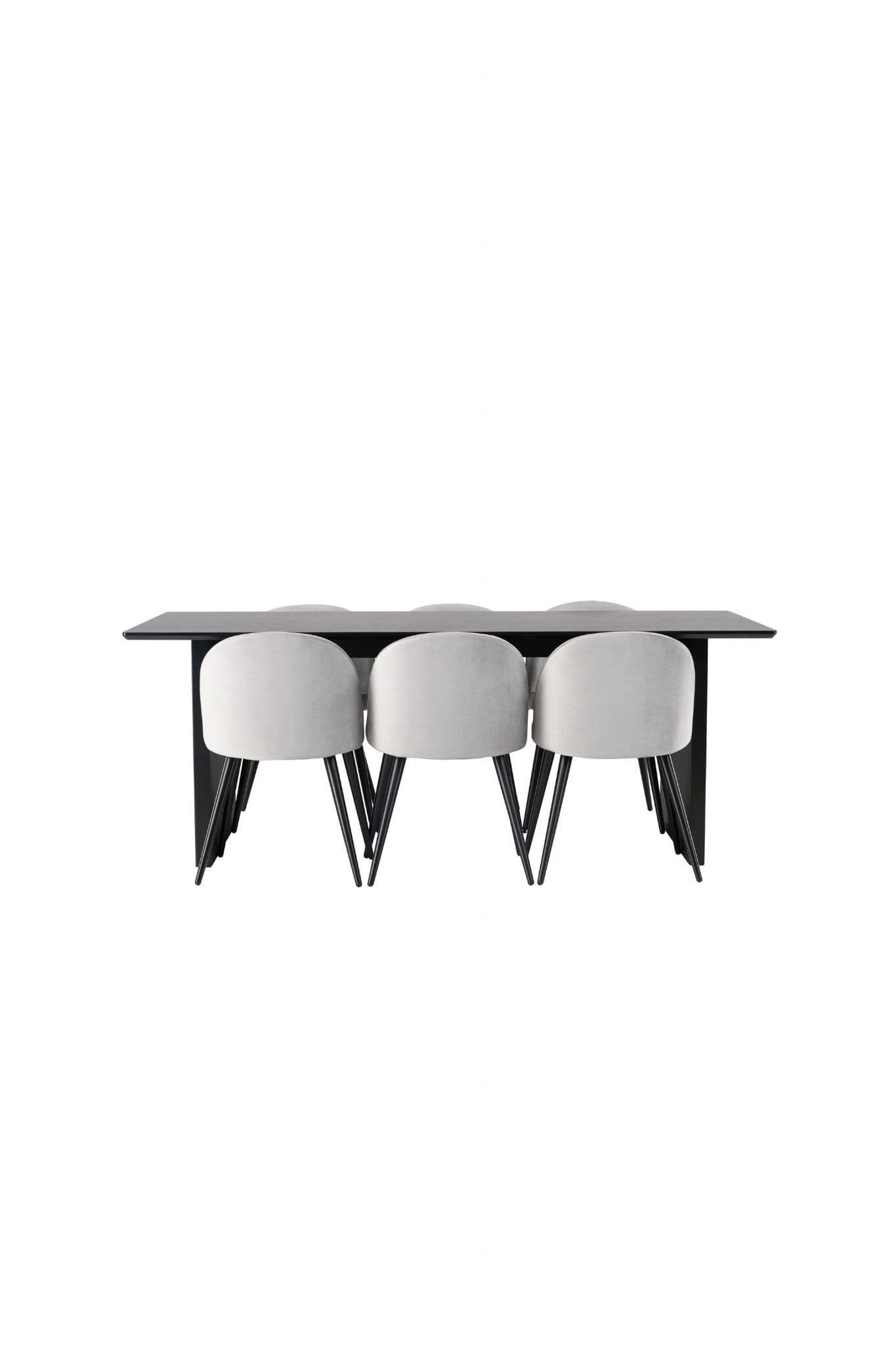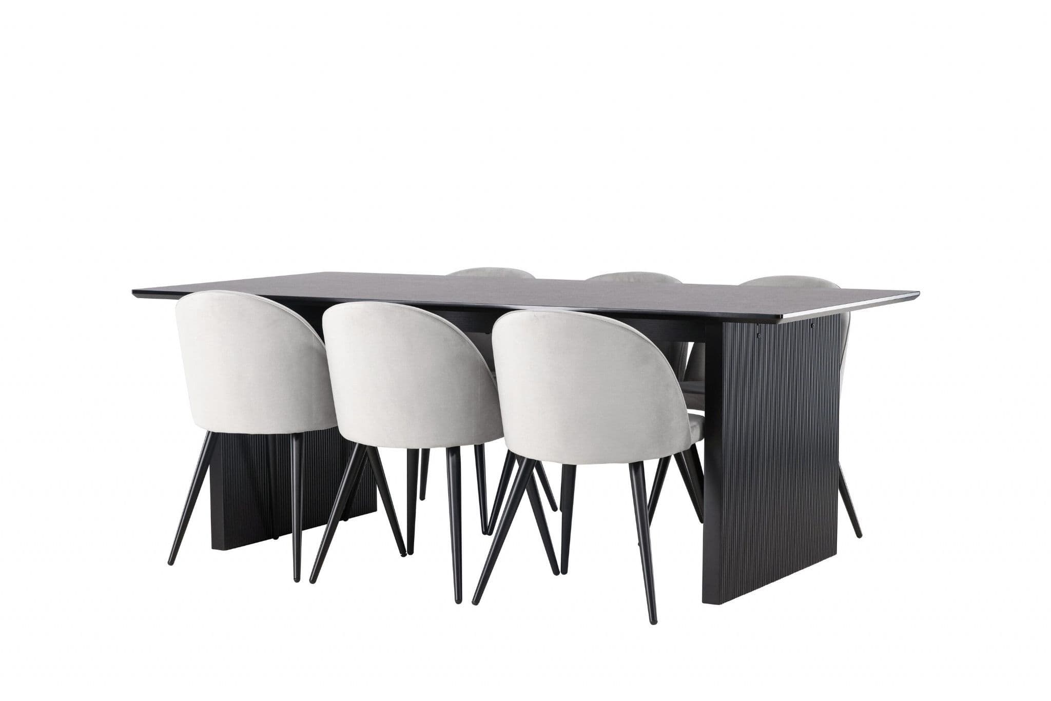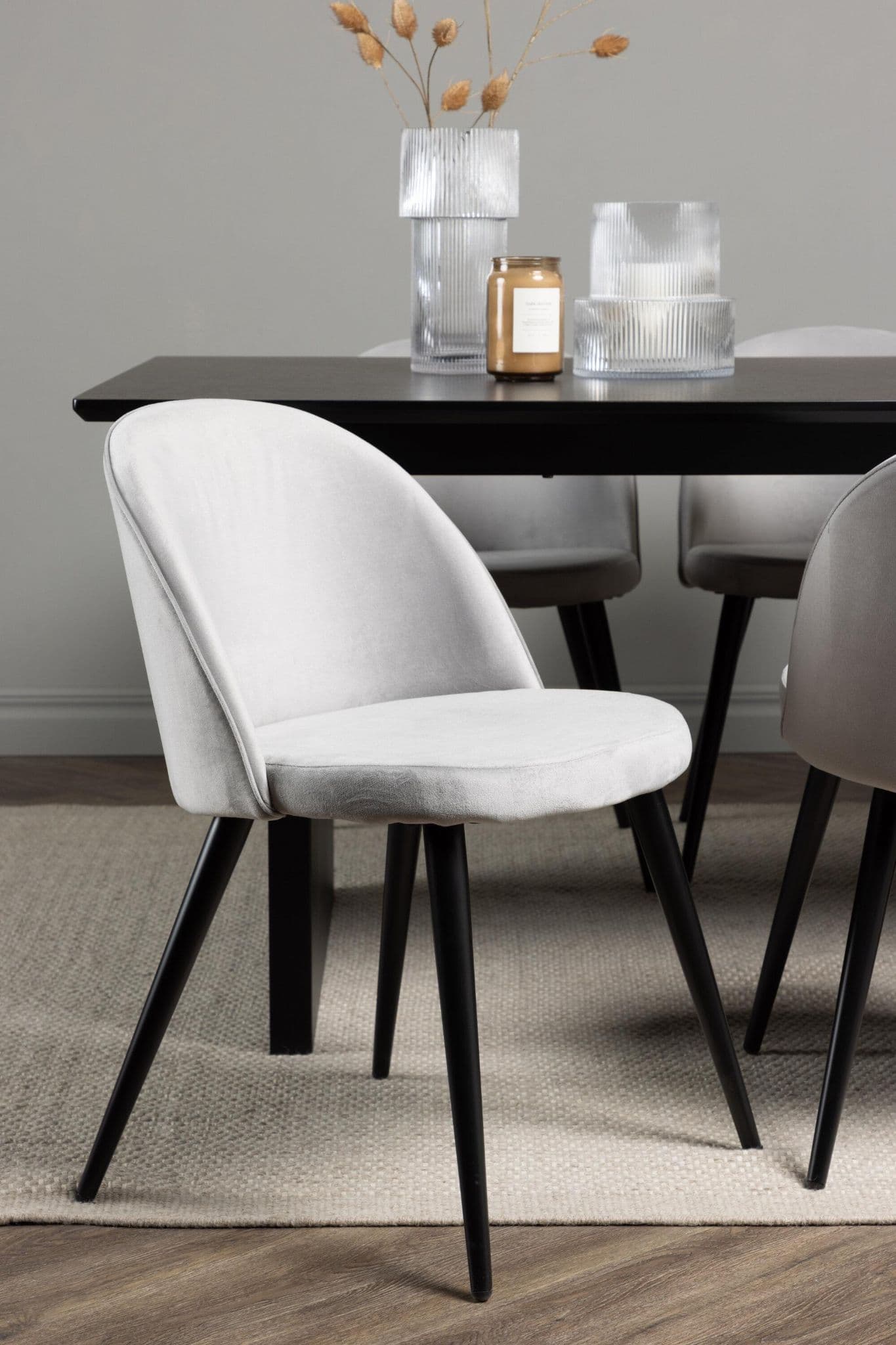 A pleasant color combination The rectangular dining table Vail has straight Nordic shapes and is made of durable MDF in a sooty black color The table top is thin in a rectangular design and balances on two sturdy wooden boards that make up the base Here in perfect combination with our gray dining chairs from the Velvet series The chair has a fully upholstered design legs in black powder coated metal and rounded back and seat in gray velvet fabric with soft padding Here you and your guests can sit comfortably for a long time Table dimensions 200x100cm.