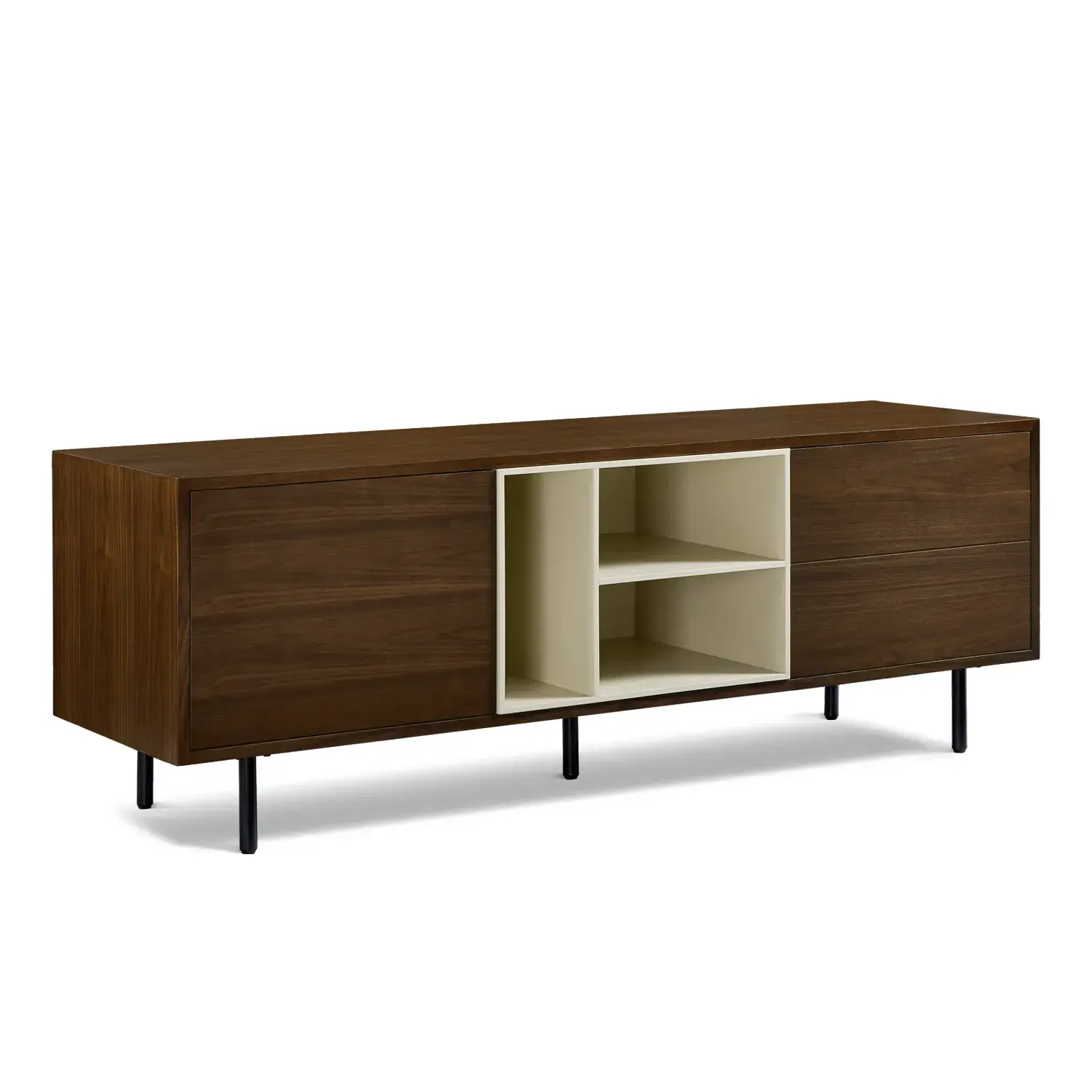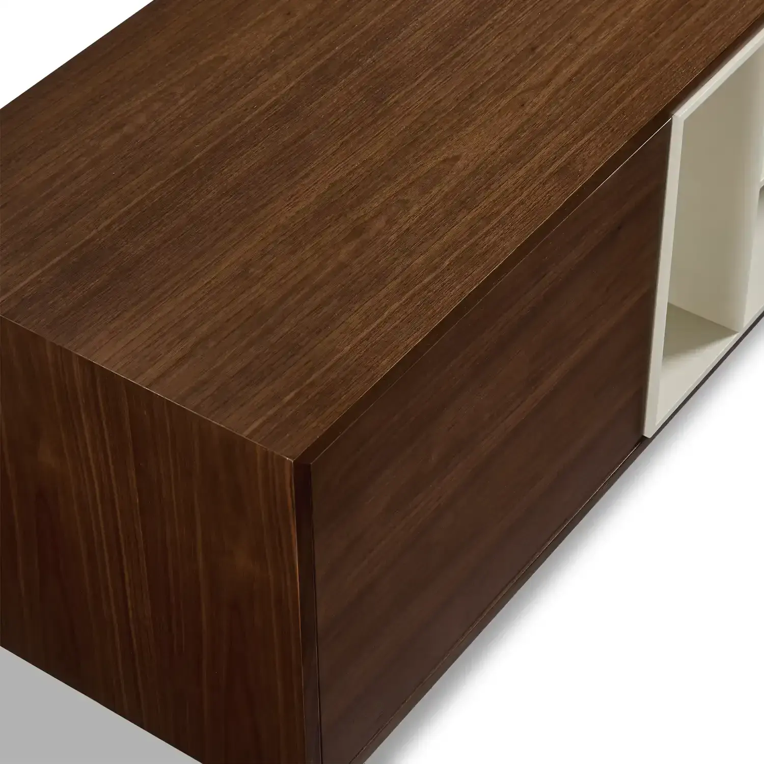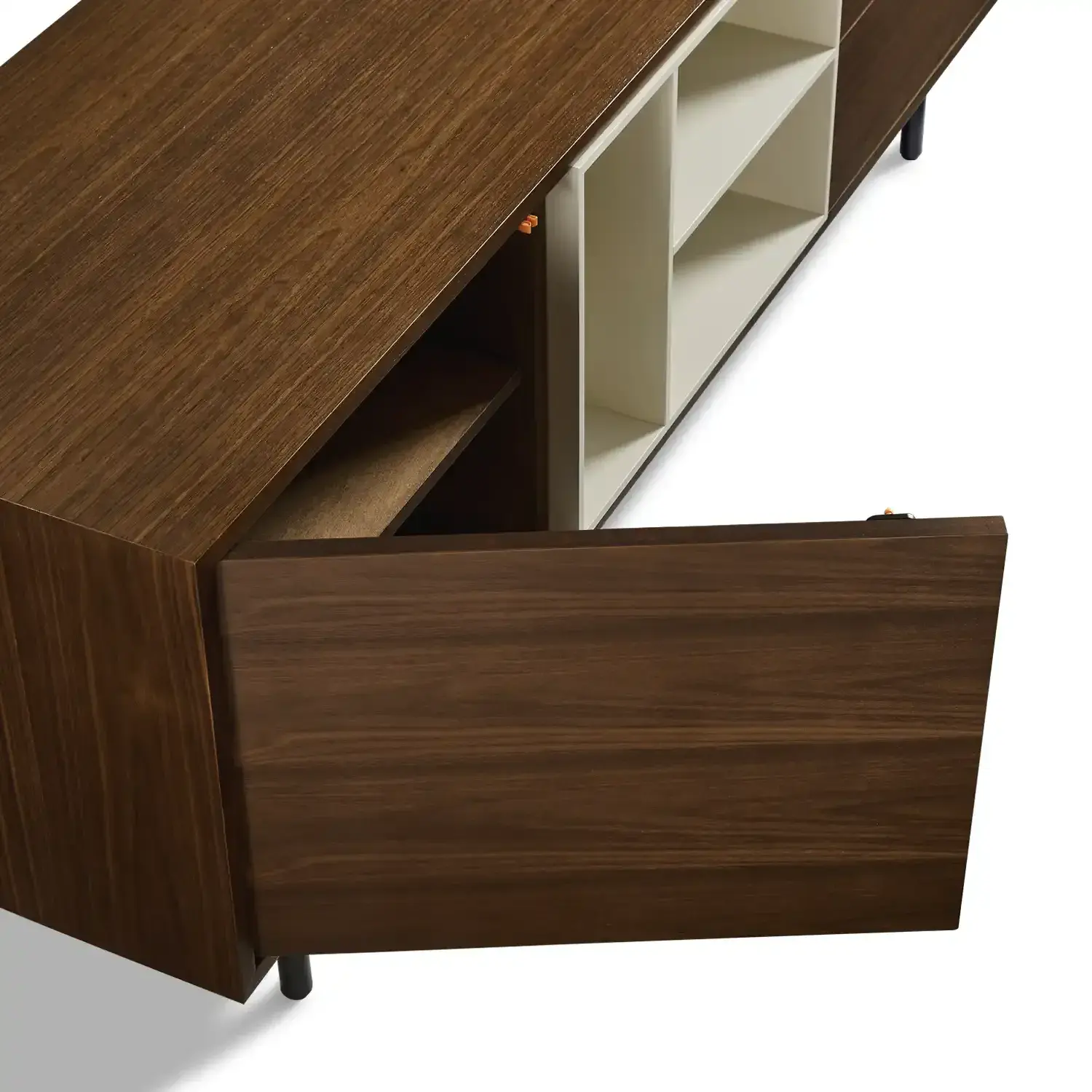 The Vero TV Cabinet combines modern minimalism with timeless walnut tones Built with MDF and walnut veneer it features a striking walnut finish contrasted by cream colored open shelves The sleek design with black metal legs adds a stylish touch while the spacious compartments provide practical storage for your media devices and decor.