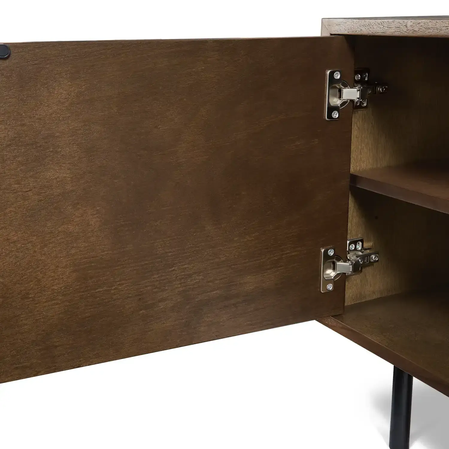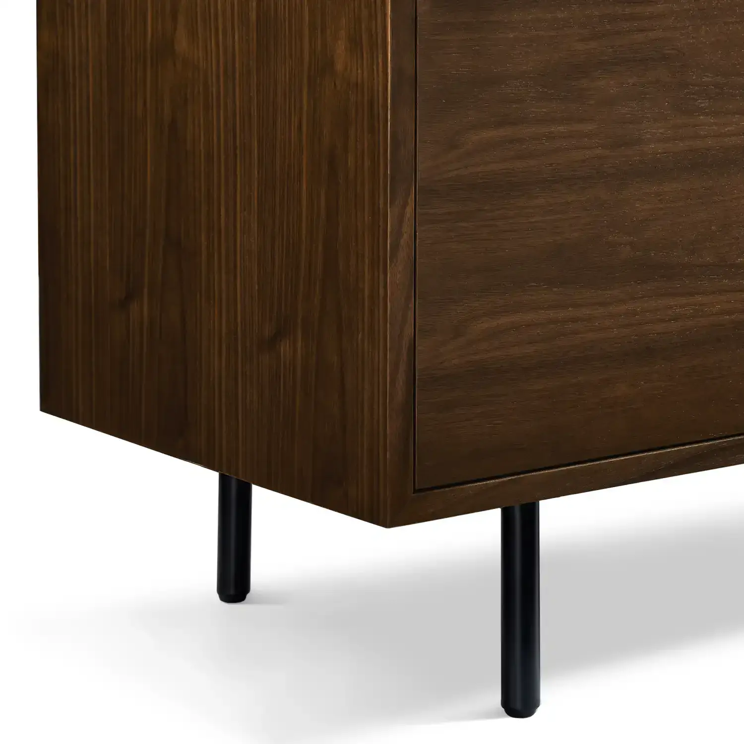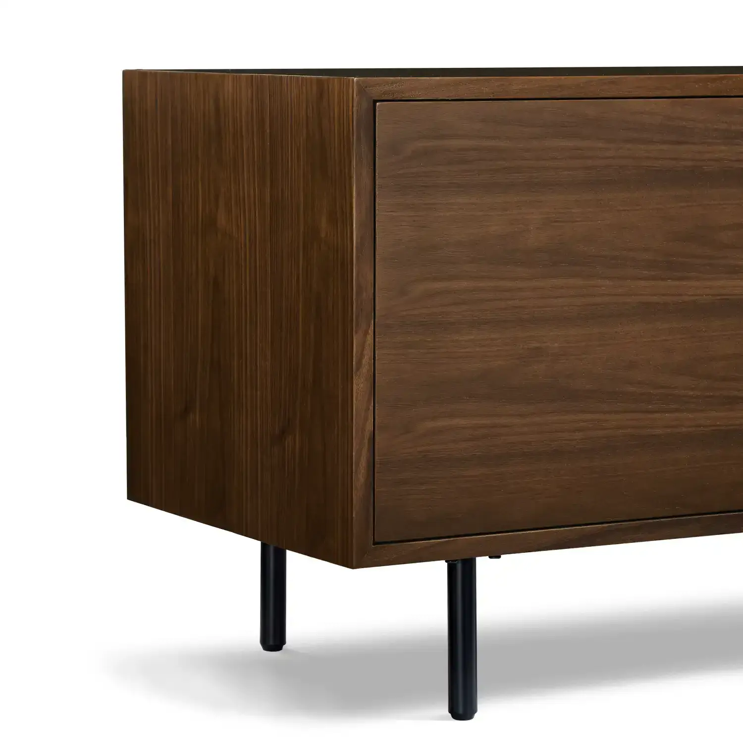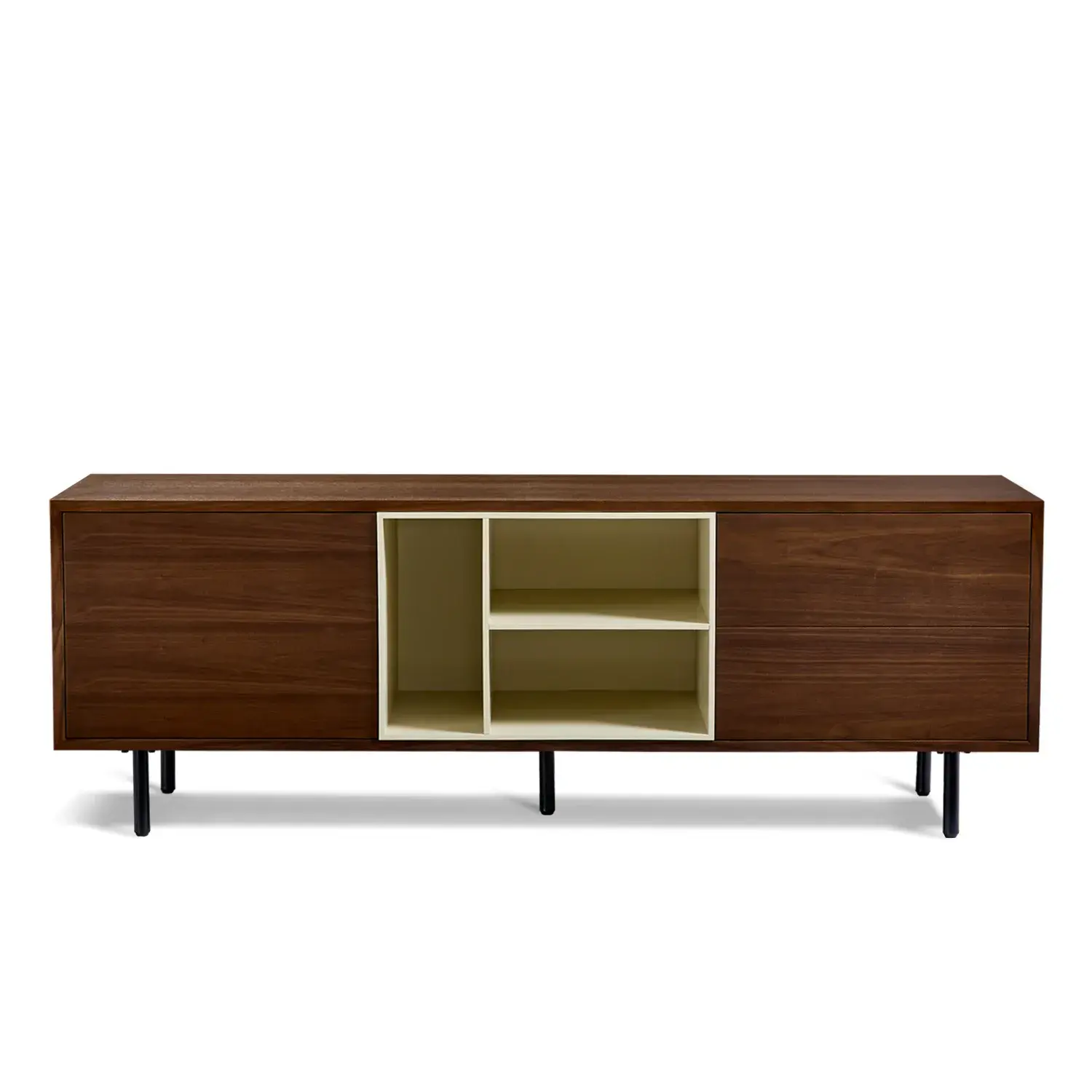The Vero TV Cabinet combines modern minimalism with timeless walnut tones Built with MDF and walnut veneer it features a striking walnut finish contrasted by cream colored open shelves The sleek design with black metal legs adds a stylish touch while the spacious compartments provide practical storage for your media devices and decor.