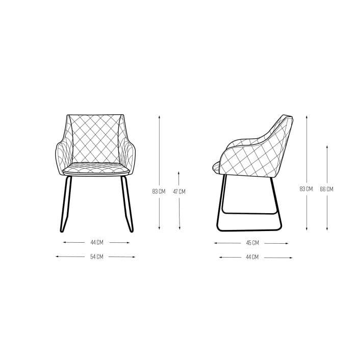 Sleek dining chair with armrests Premier velvet fabric for added comfort Versatile design suitable for any decor Classic looking seat with a subtly designed metal base.