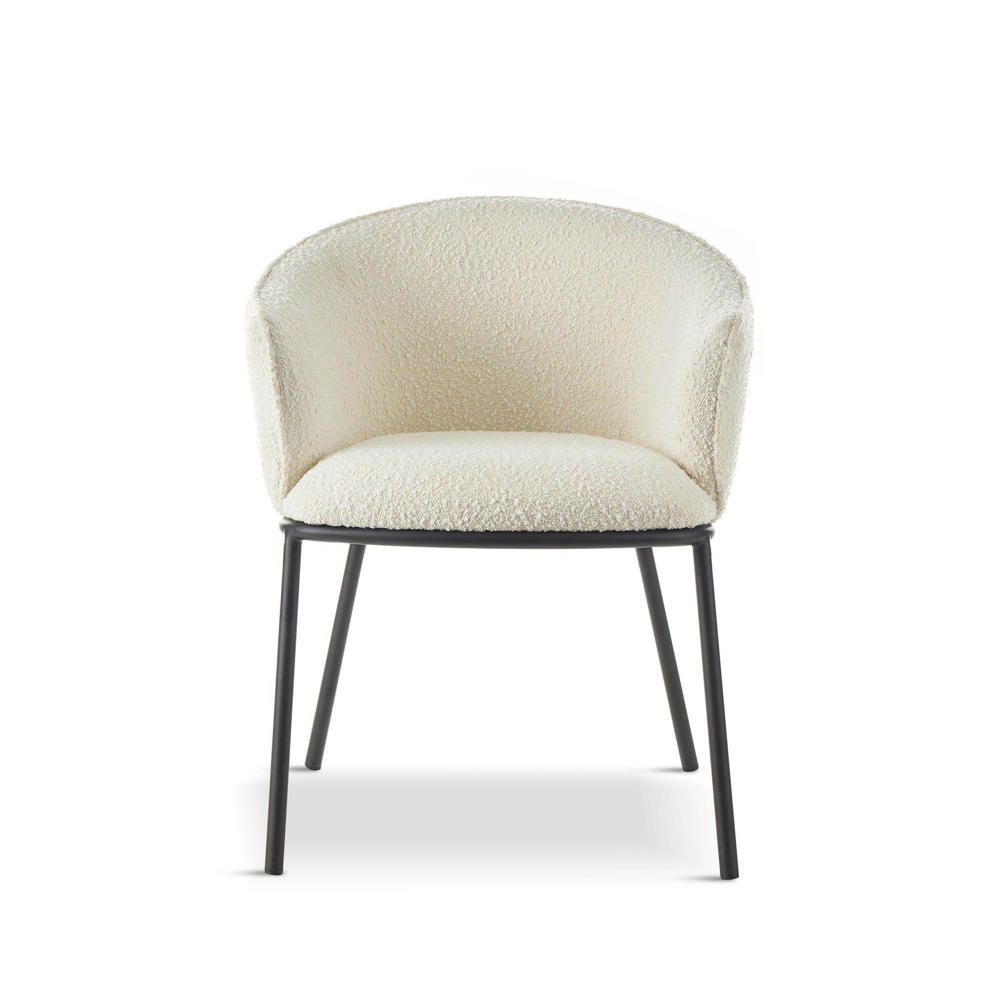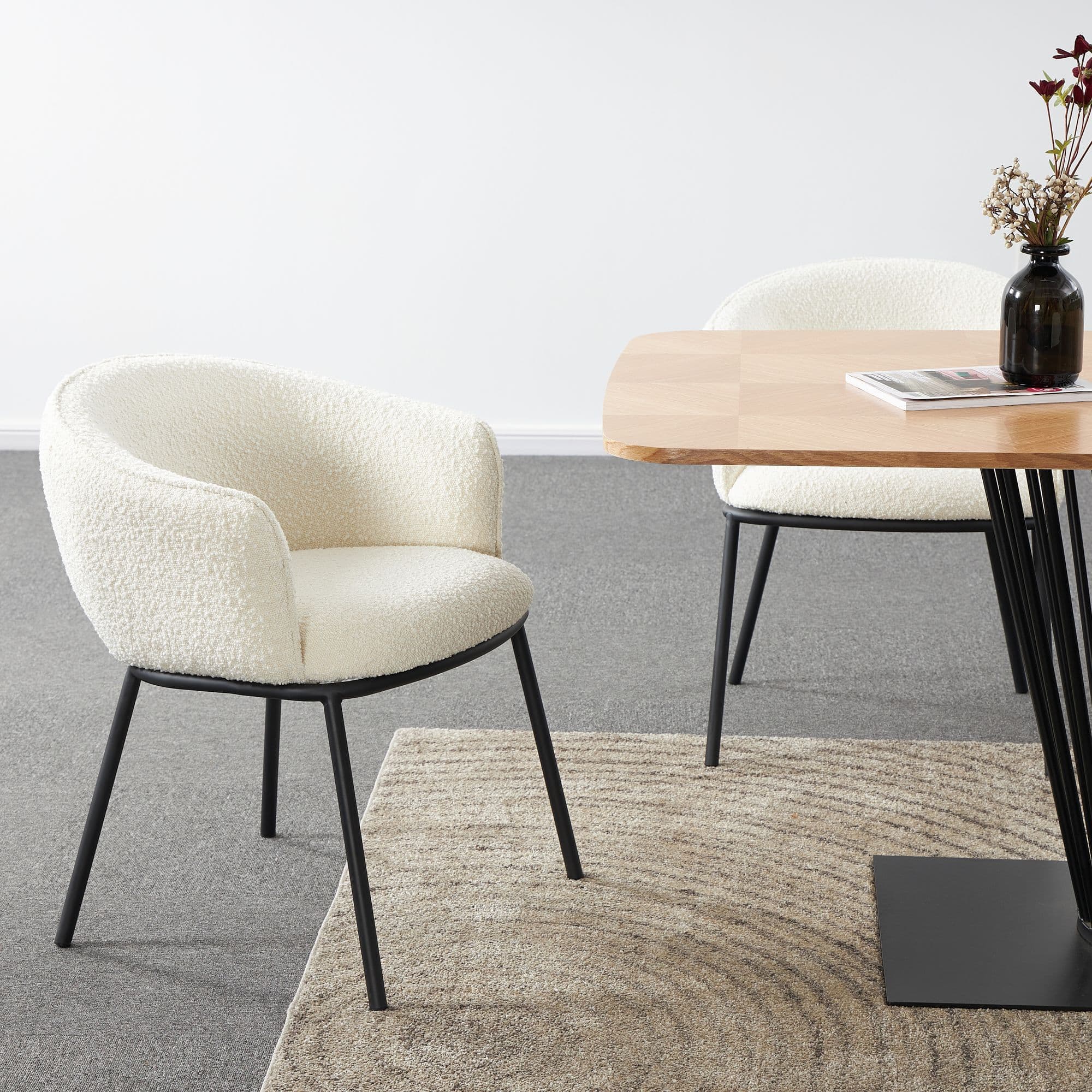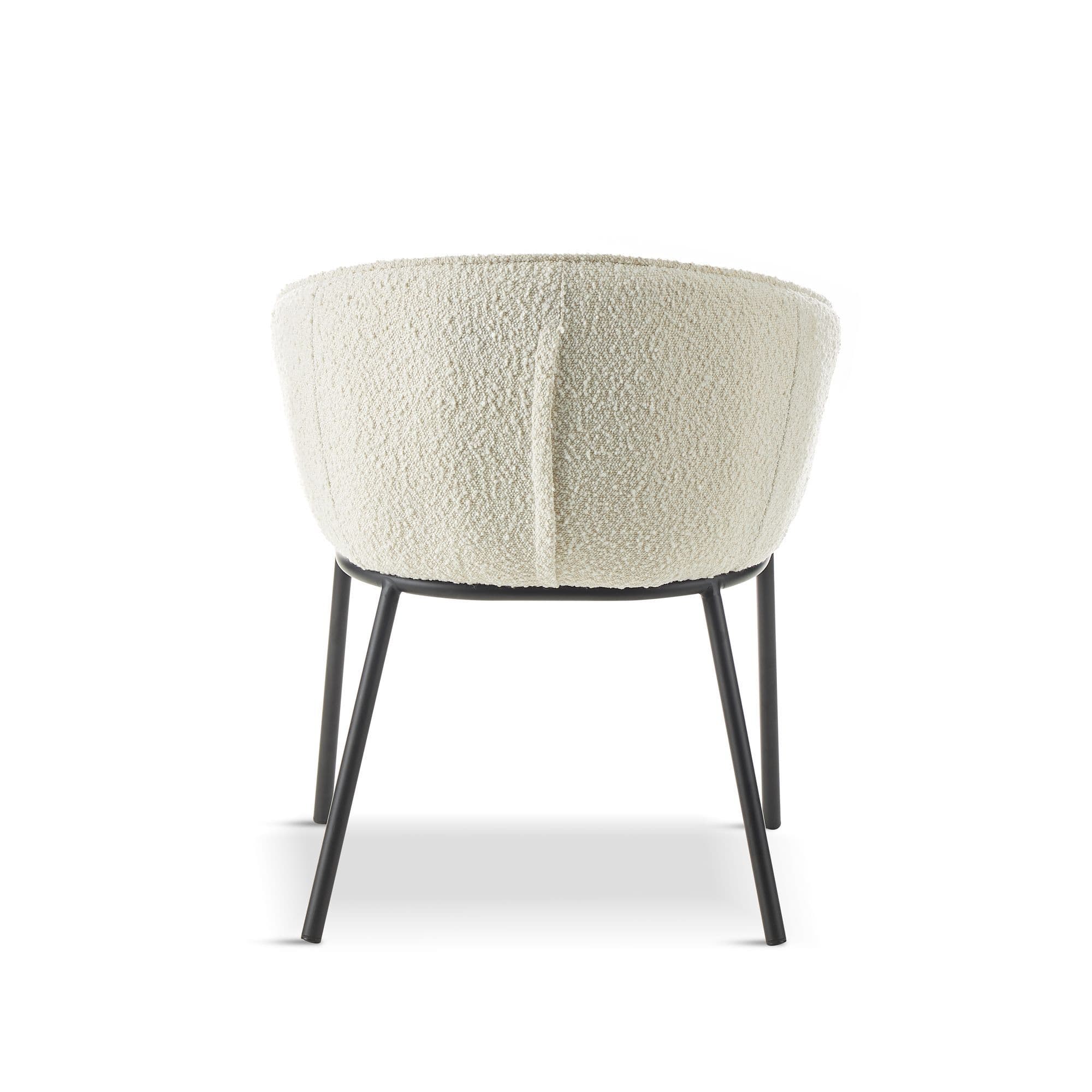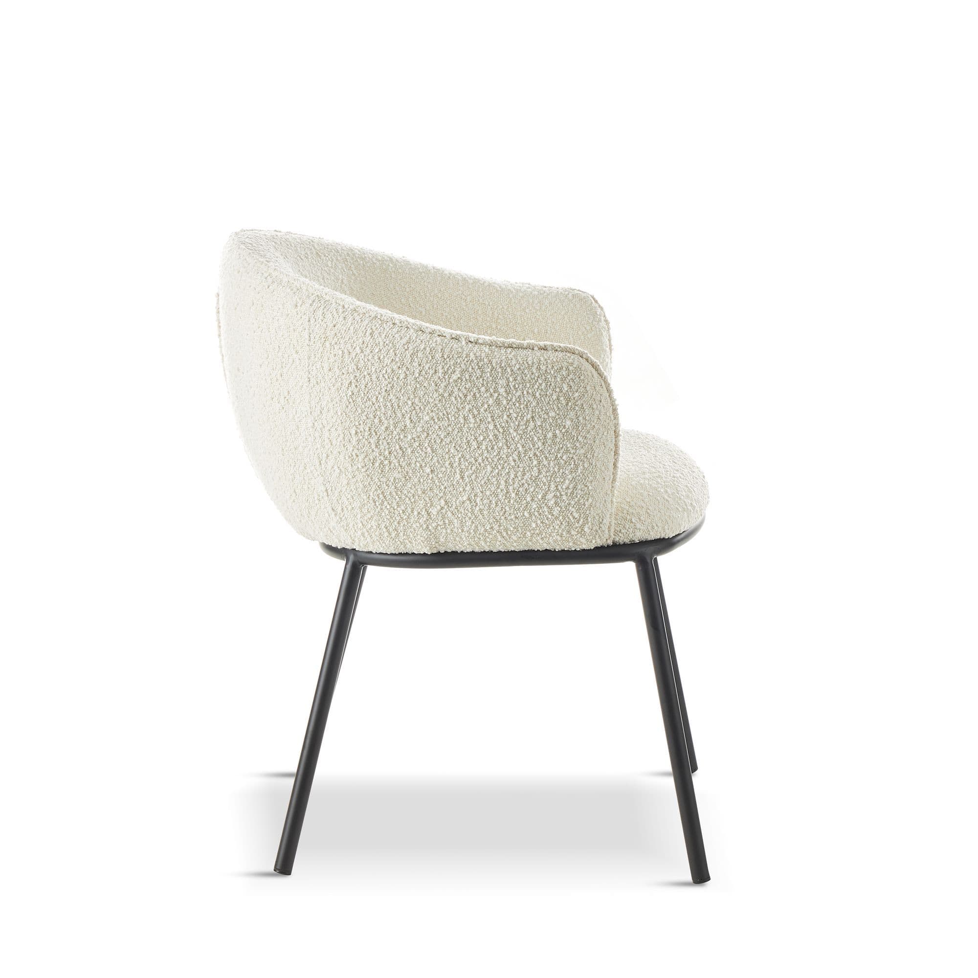 Introducing our high end collection the DUKE chair features a seat made of boucle fabric a popular material that is known for its soft texture and unique looped design The boucle fabric not only adds a touch of elegance to the chair but also provides a comfortable and cosy seating experience The legs are black powder coated adding a sleek and modern look to the overall design It also provides durability and ensuring that the chairs will look great for years to come With its combination of comfort style and durability the DUKE chair is an excellent choice for any dining area.