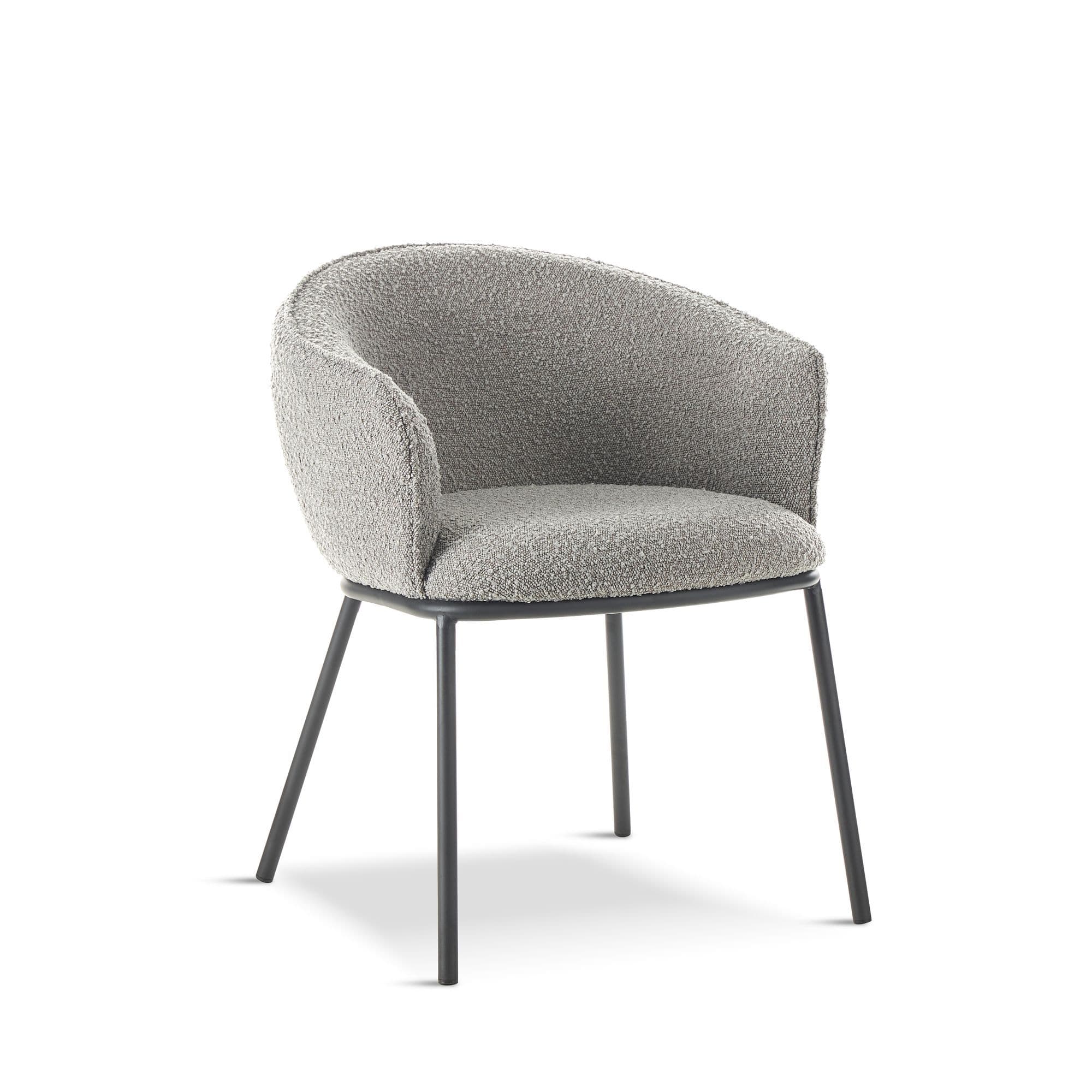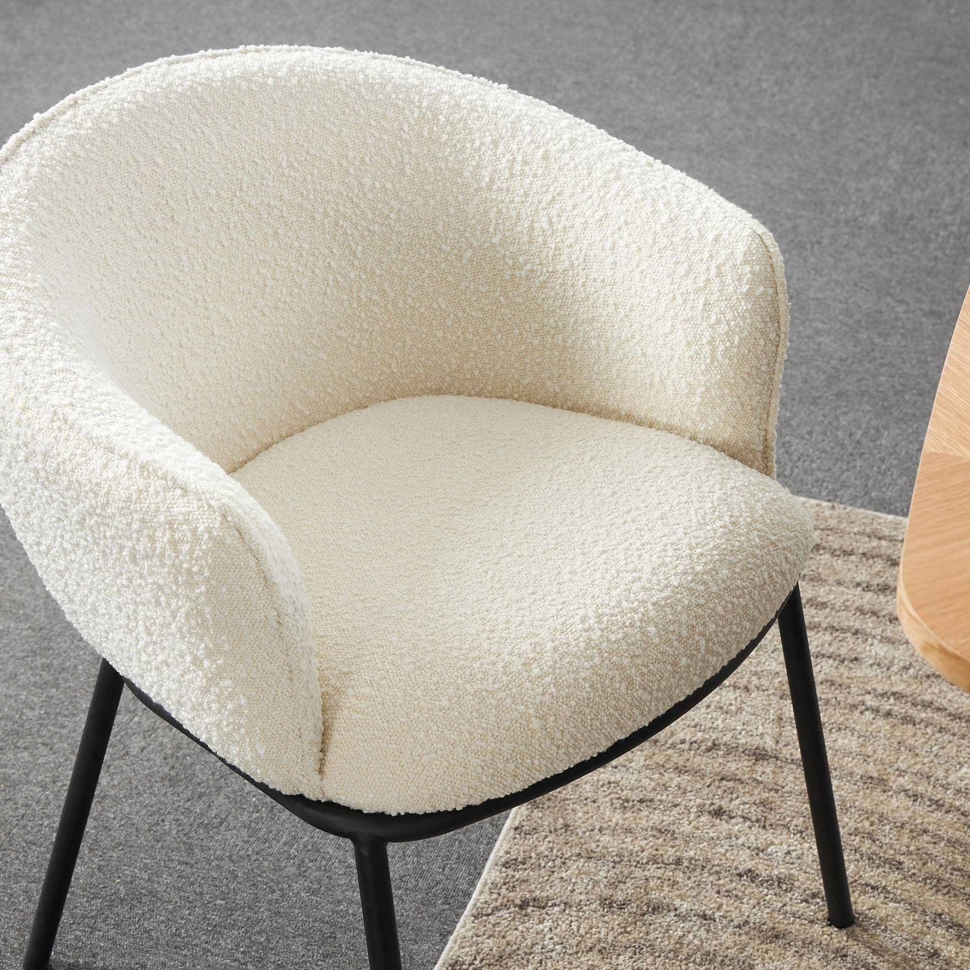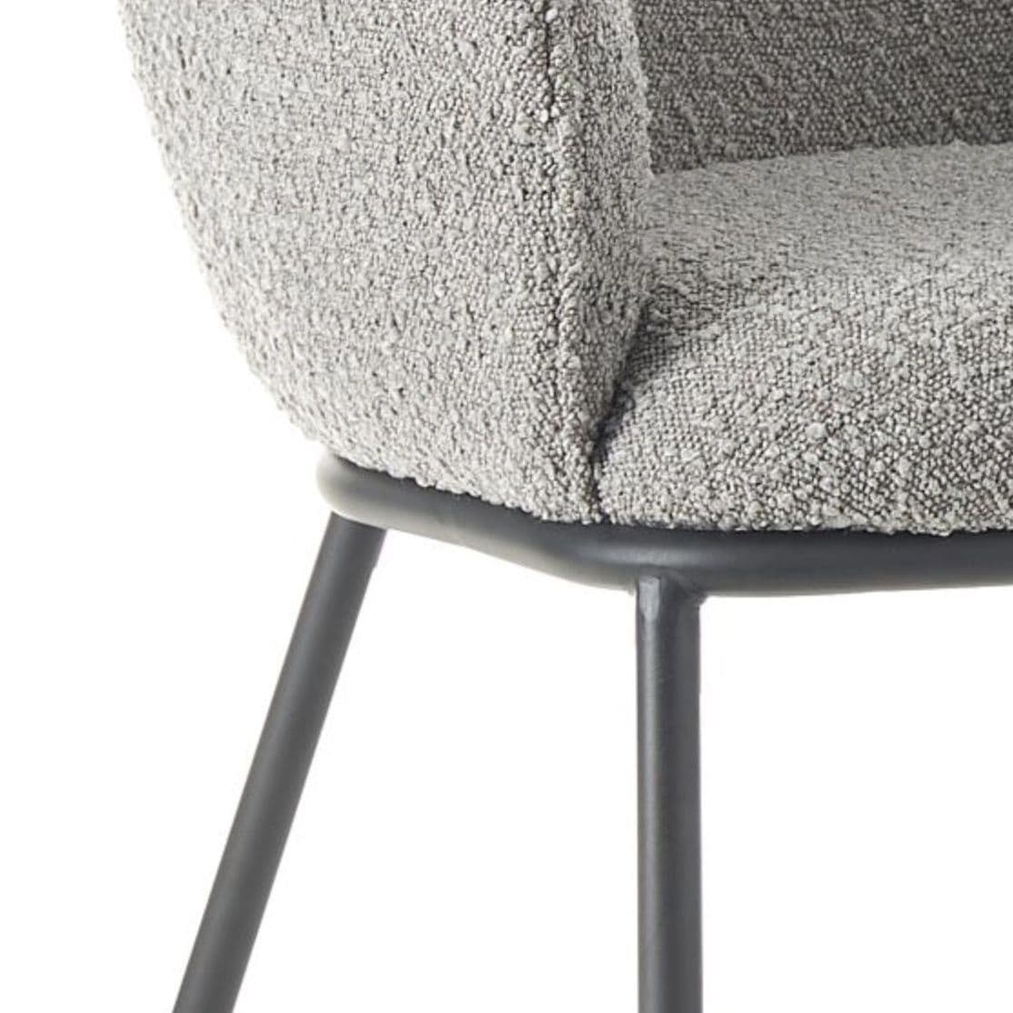 Introducing our high end collection the DUKE chair features a seat made of boucle fabric a popular material that is known for its soft texture and unique looped design The boucle fabric not only adds a touch of elegance to the chair but also provides a comfortable and cosy seating experience The legs are black powder coated adding a sleek and modern look to the overall design It also provides durability and ensuring that the chairs will look great for years to come With its combination of comfort style and durability the DUKE chair is an excellent choice for any dining area.