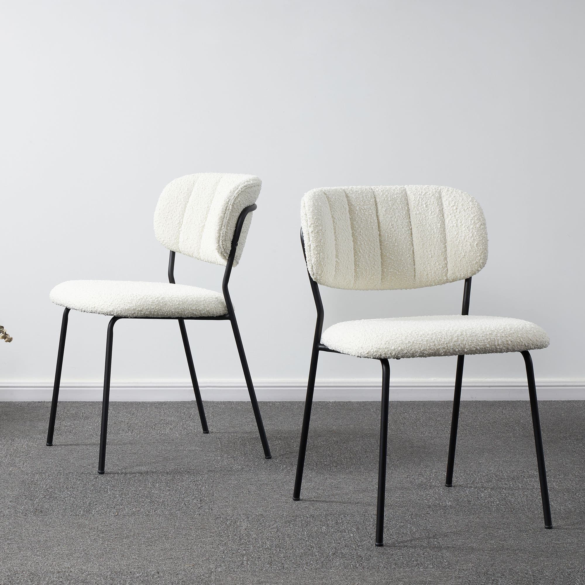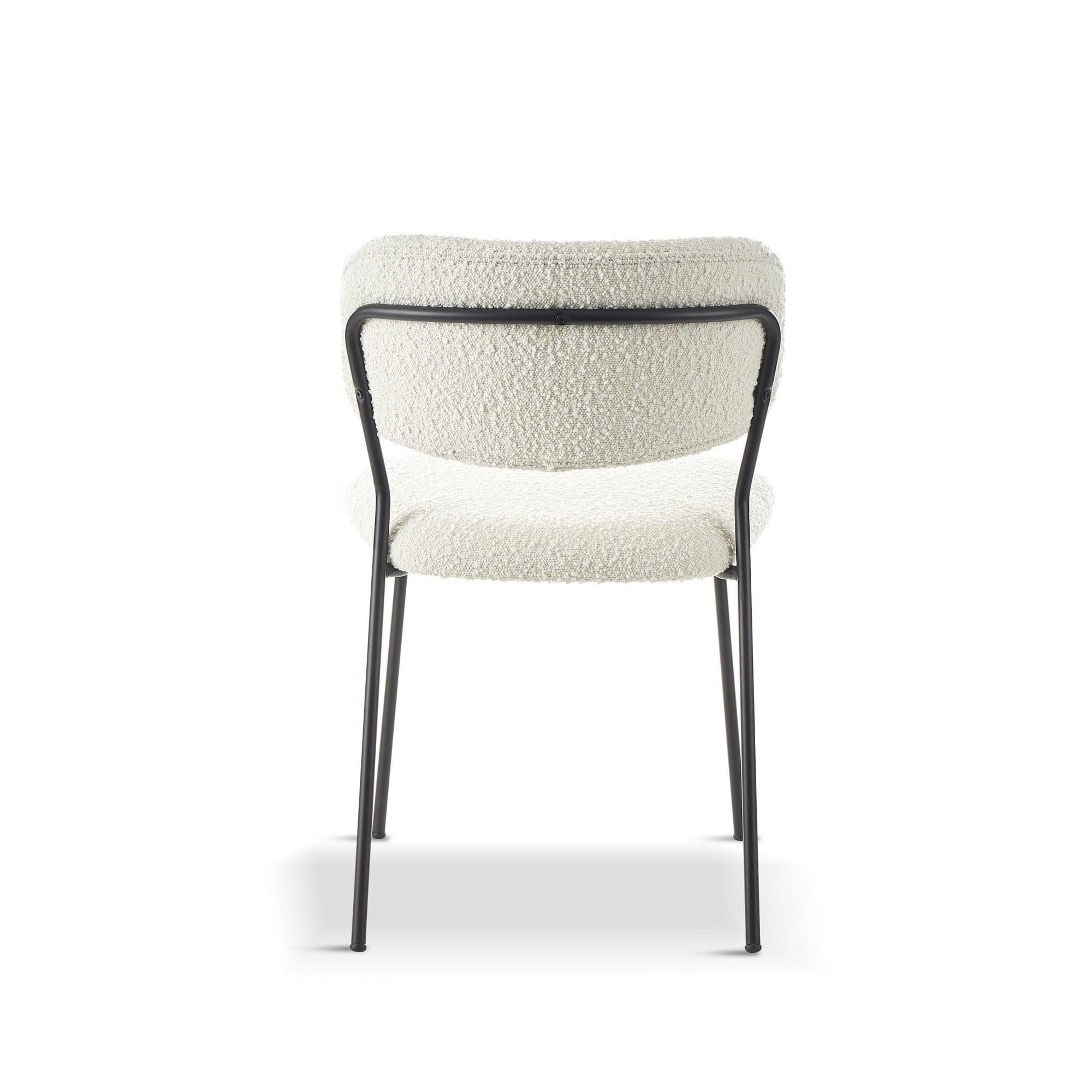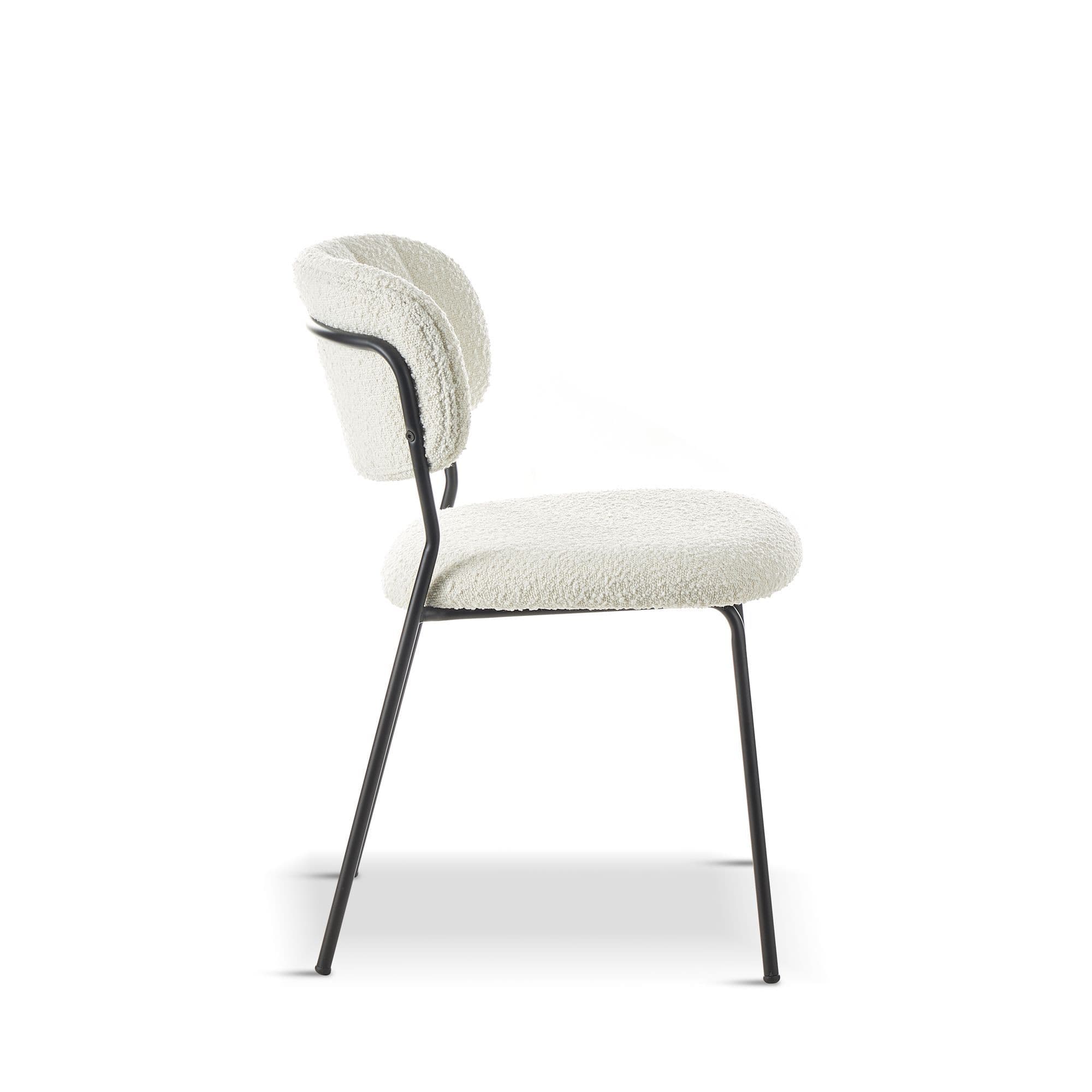 The white boucle dining chair is a stylish and comfortable seating option for any interior area The chair features a seat covered in boucle fabric which has a soft and textured feel that adds warmth and depth to any decor The white colour of the fabric adds a clean and fresh look to the chair while the boucle texture provides a subtle touch of elegance The chairs legs are made of strong steel that is powder coated in black for durability and a modern look The steel legs are designed in a sleek style which contrasts nicely with the soft and plush boucle seat This chair is perfect for adding a cosy and stylish touch to your dining room or for use in a home office or living room setting.
