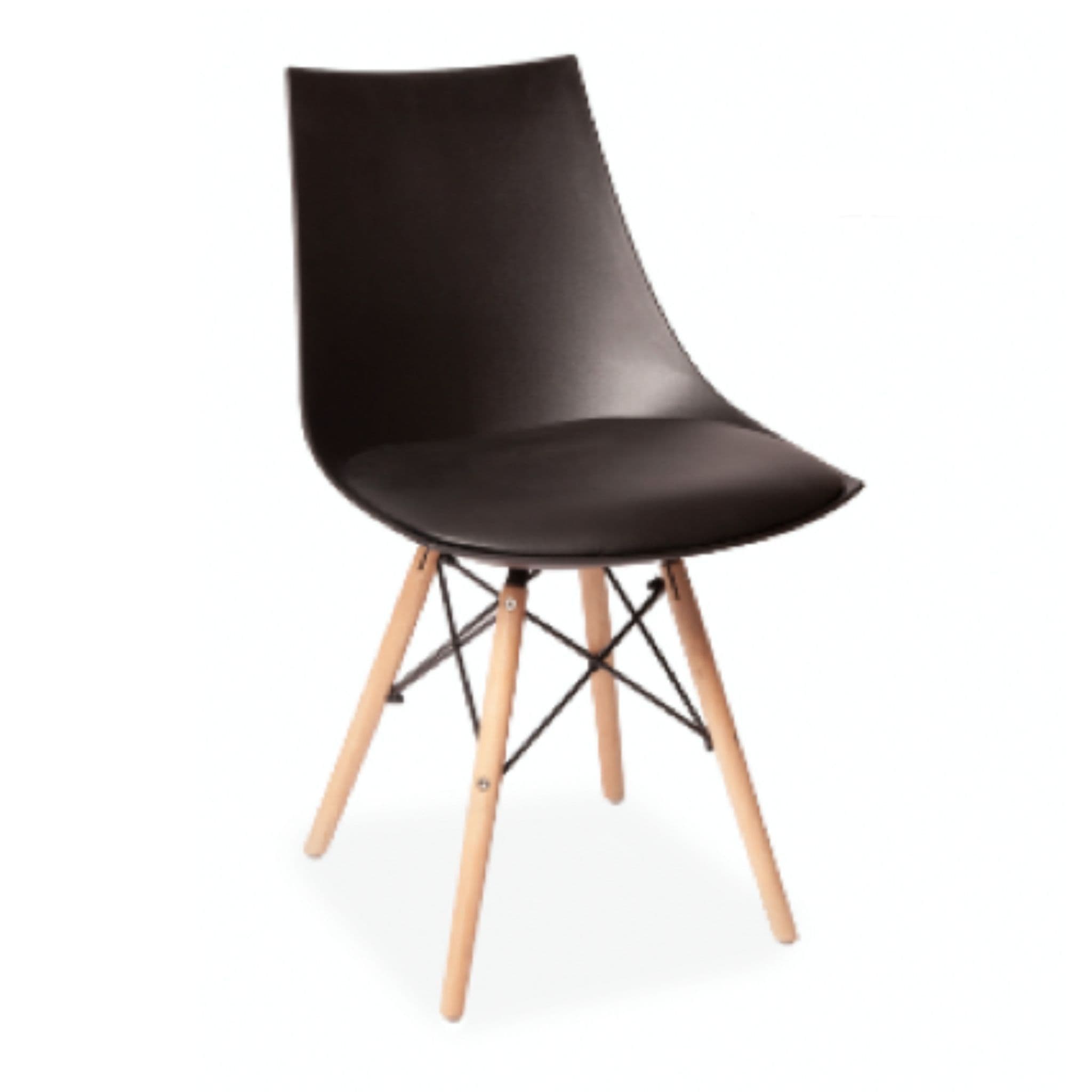 High-quality one-piece solid plastic chair with cushion perfect for dining sets. Comfortable plastic seat paired with wooden Eiffel-style legs with a metal insert.