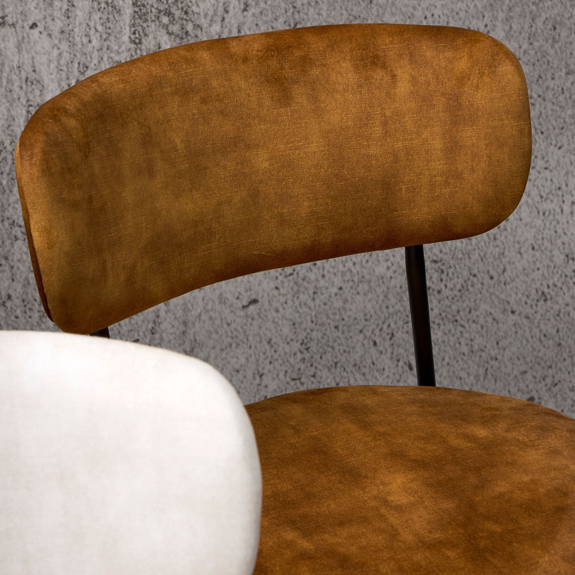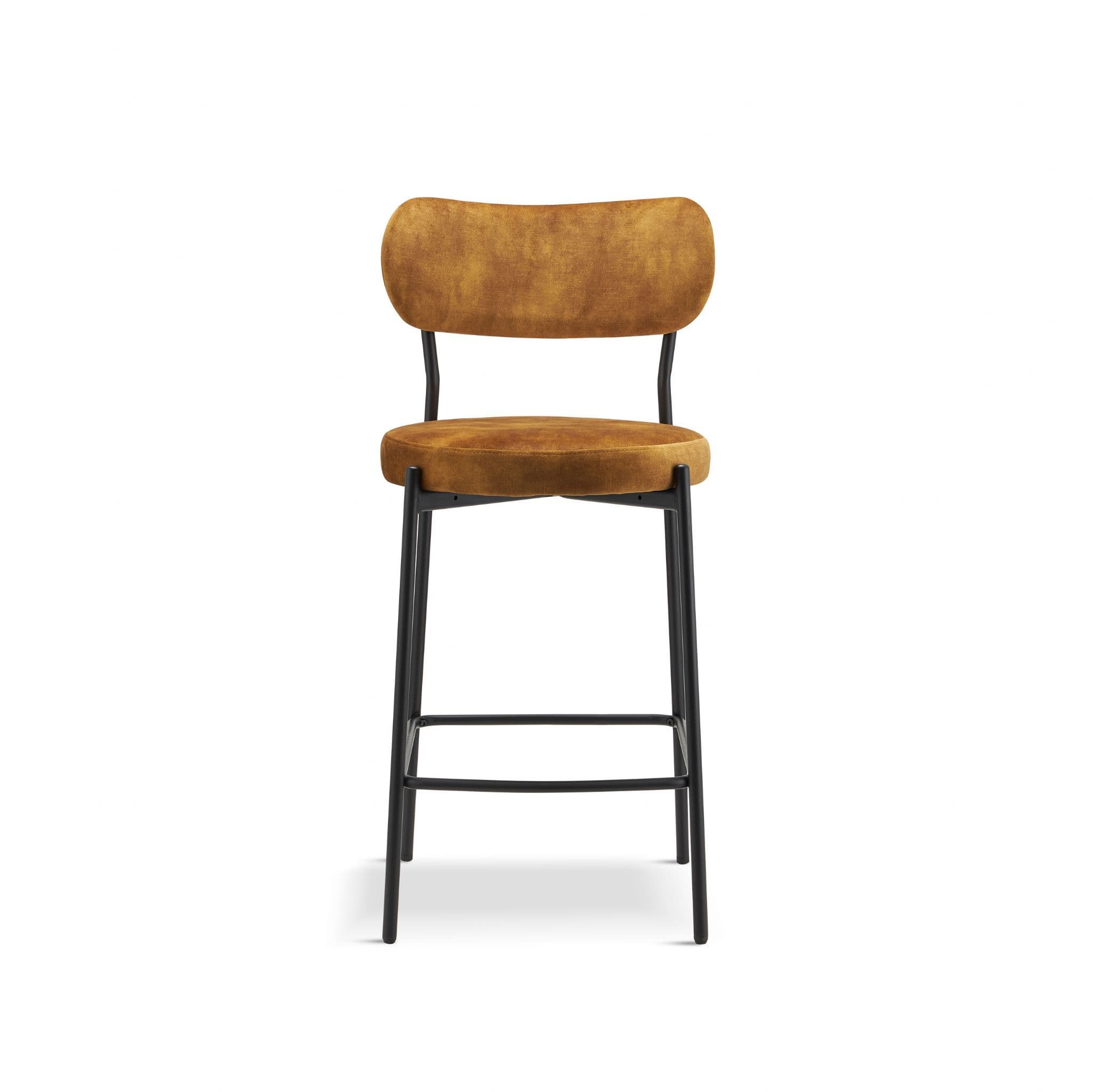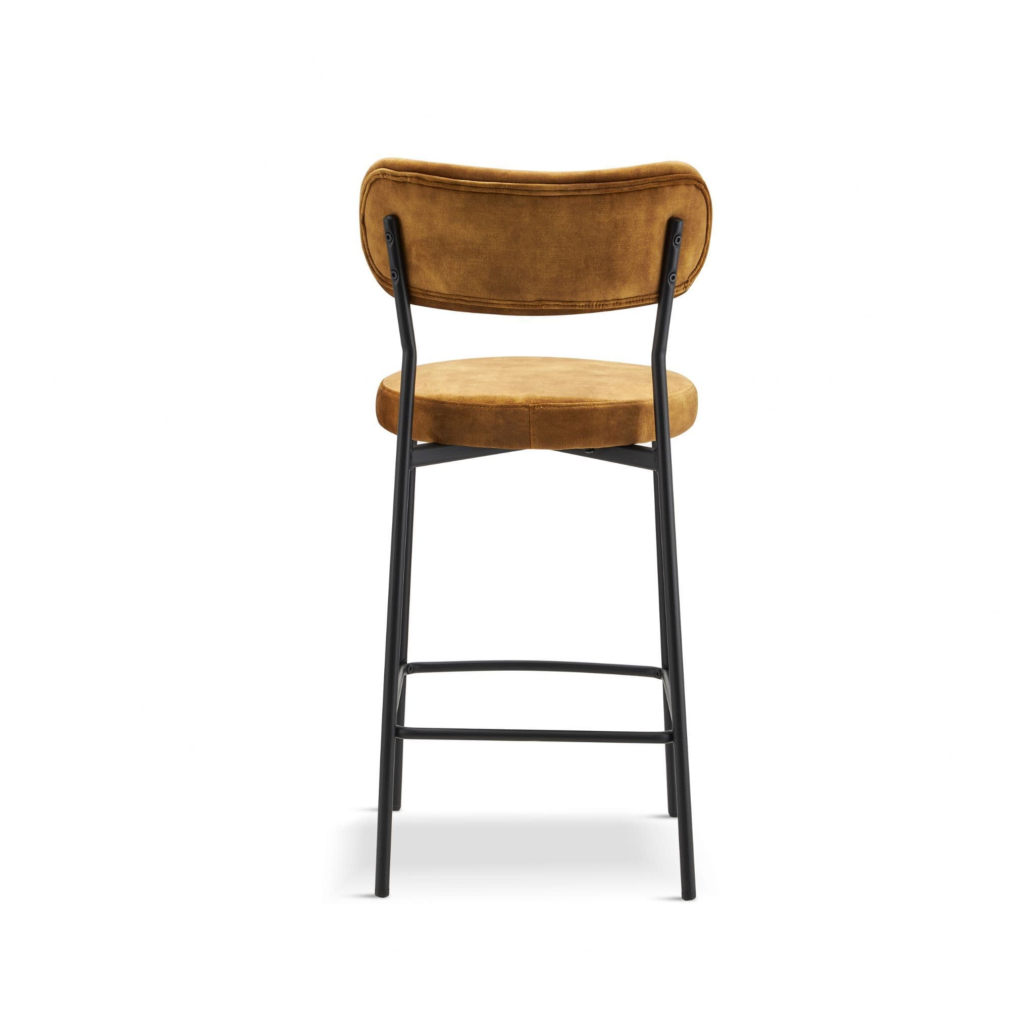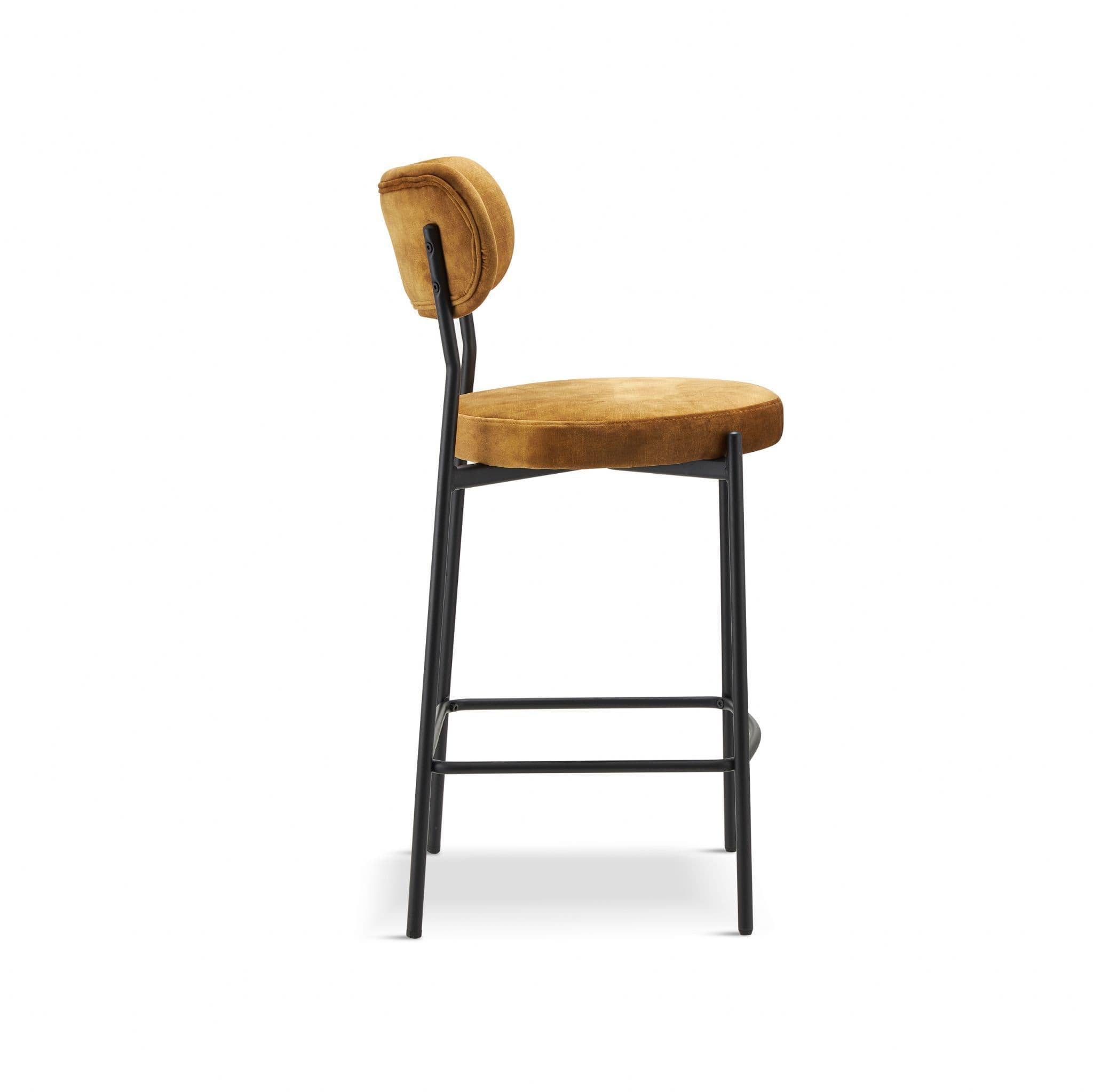 Minimalist and elegant design Breathable velvet covering for comfort Clean lines and open back design Matte black legs with square footrests Non marking feet to protect floors Available in Mustard Cream Dark Green.