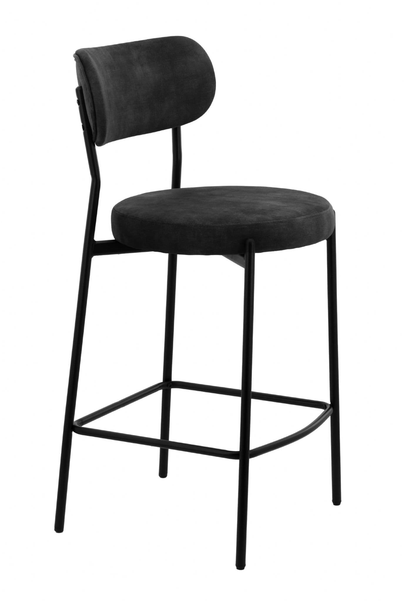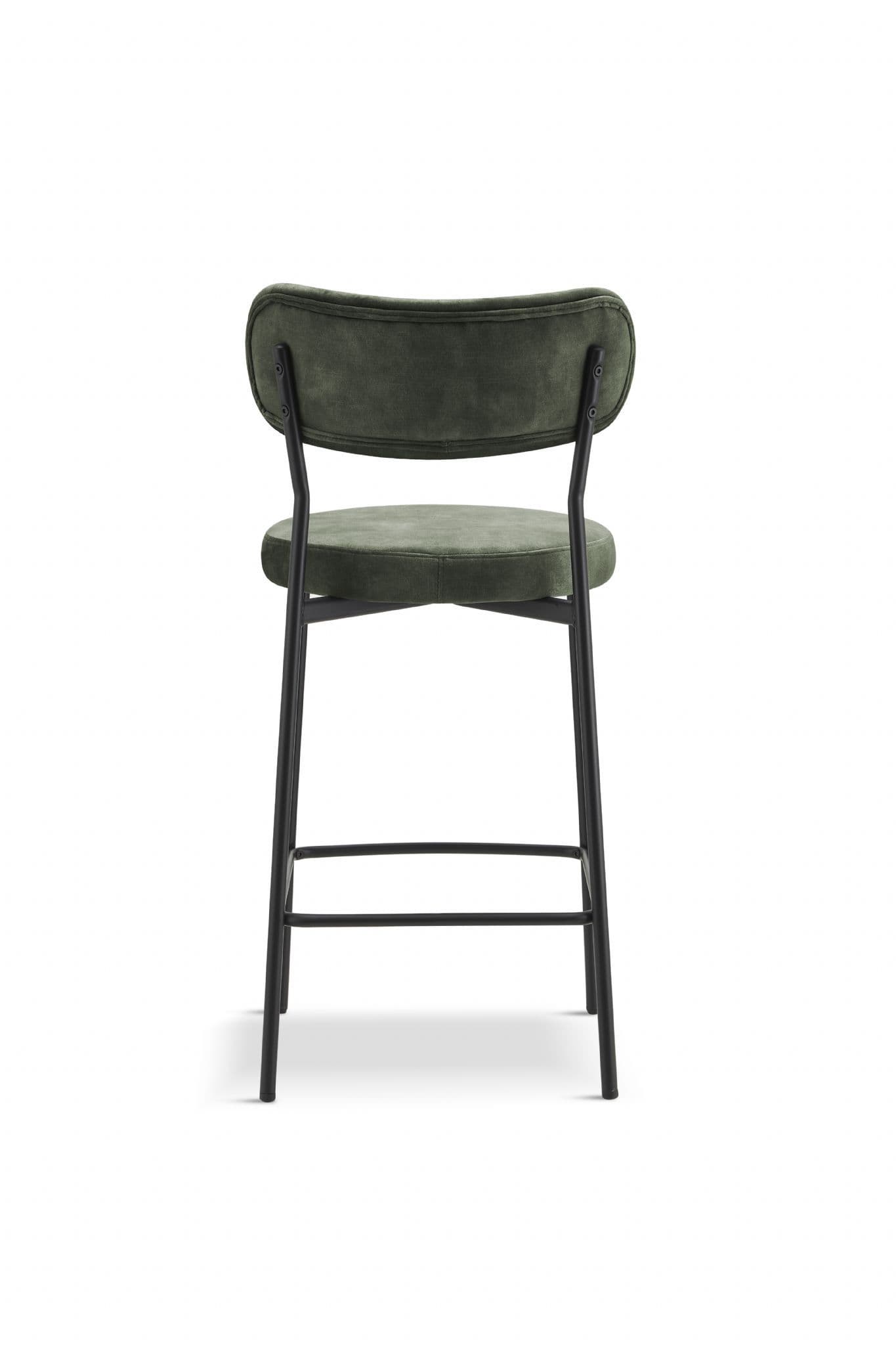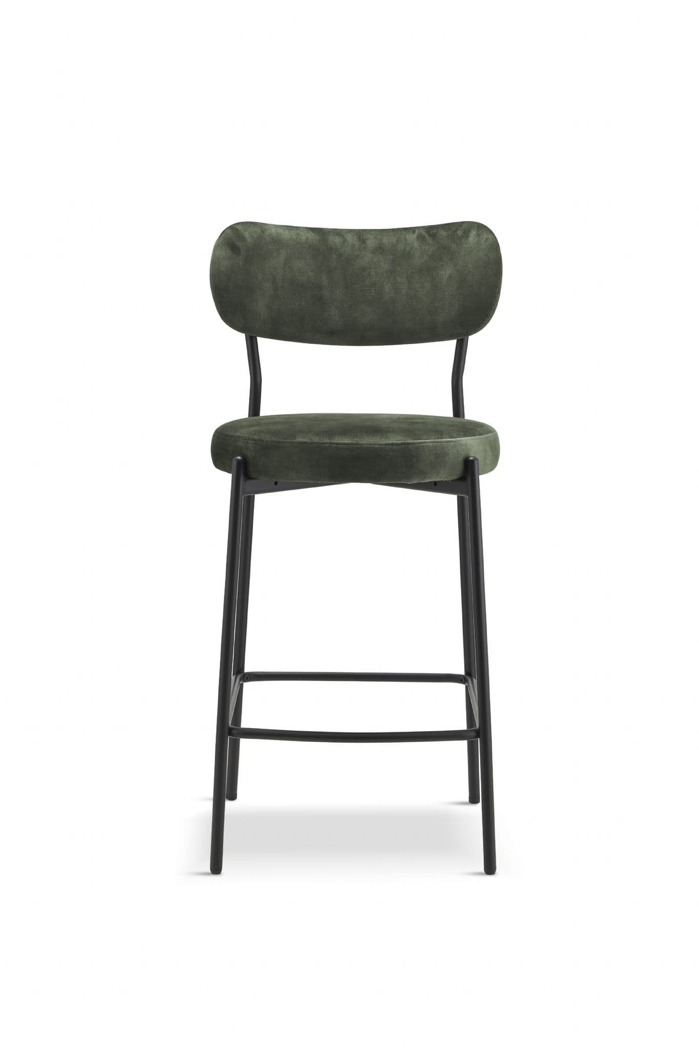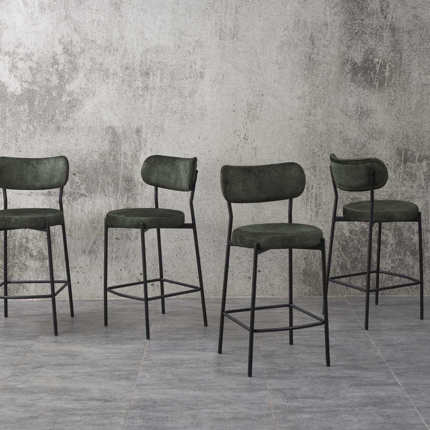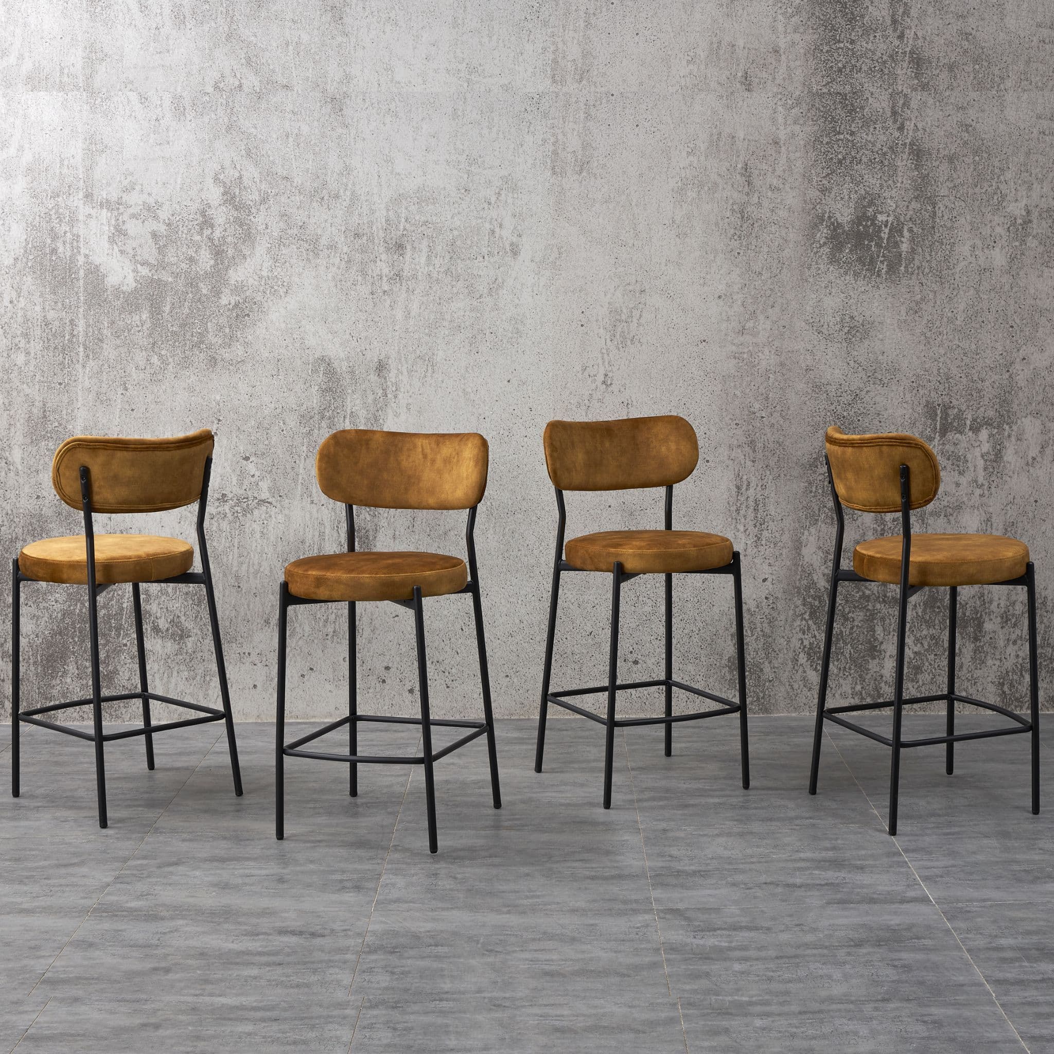 Minimalist and elegant design Breathable velvet covering for comfort Clean lines and open back design Matte black legs with square footrests Non marking feet to protect floors Available in Mustard Cream Dark Green.