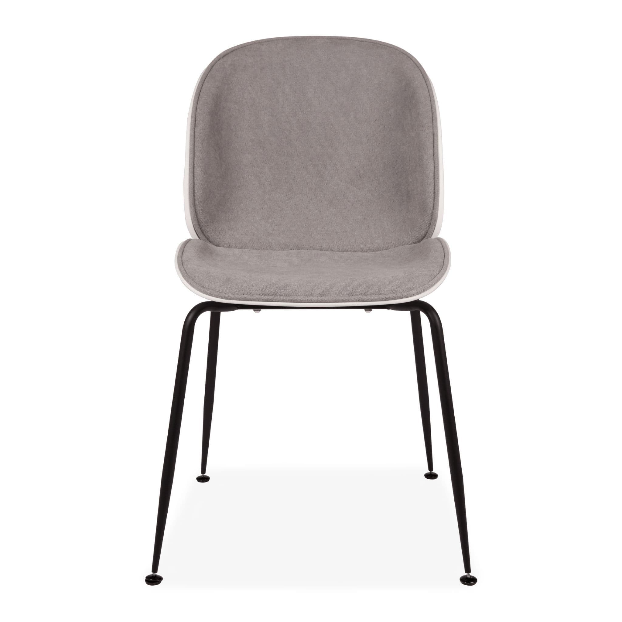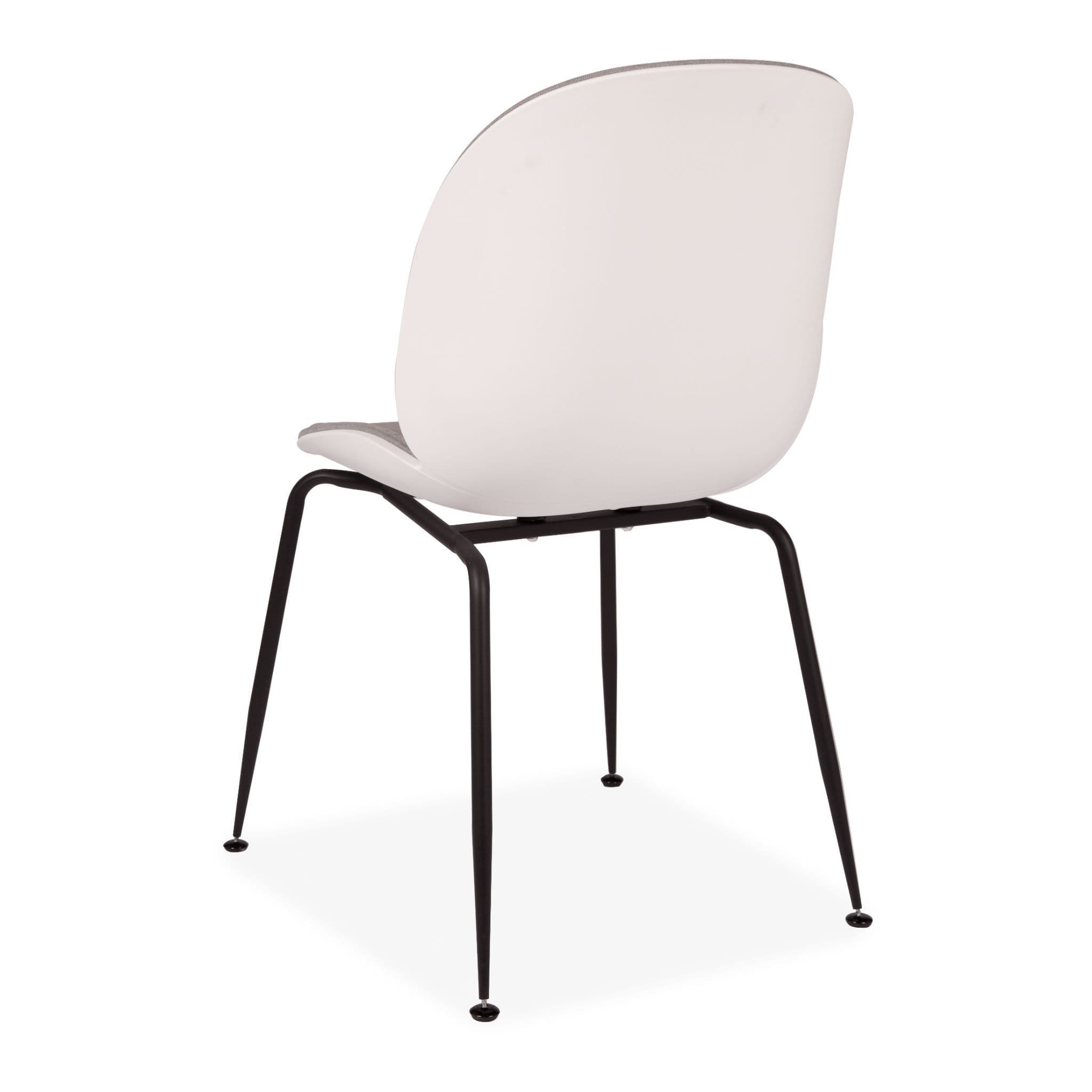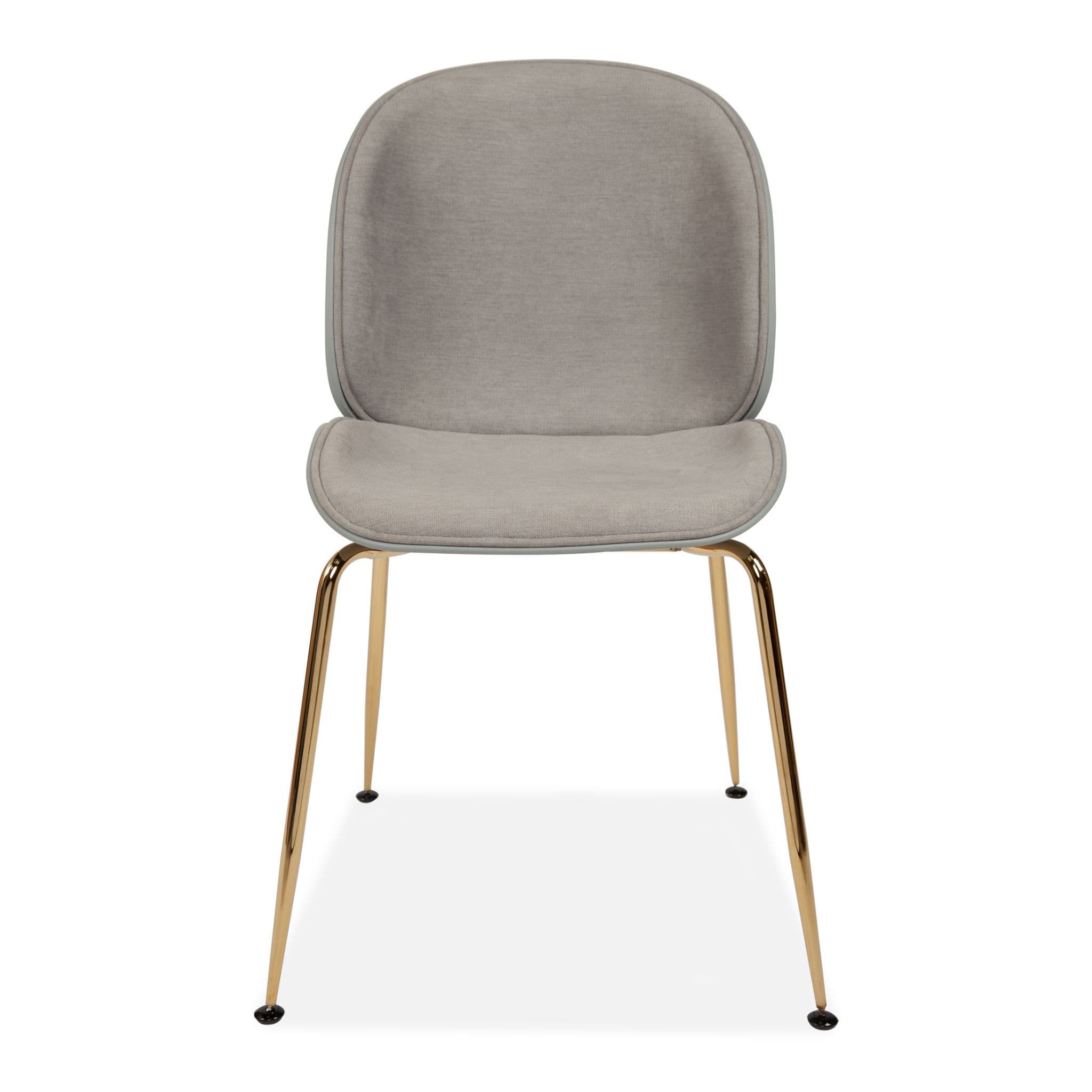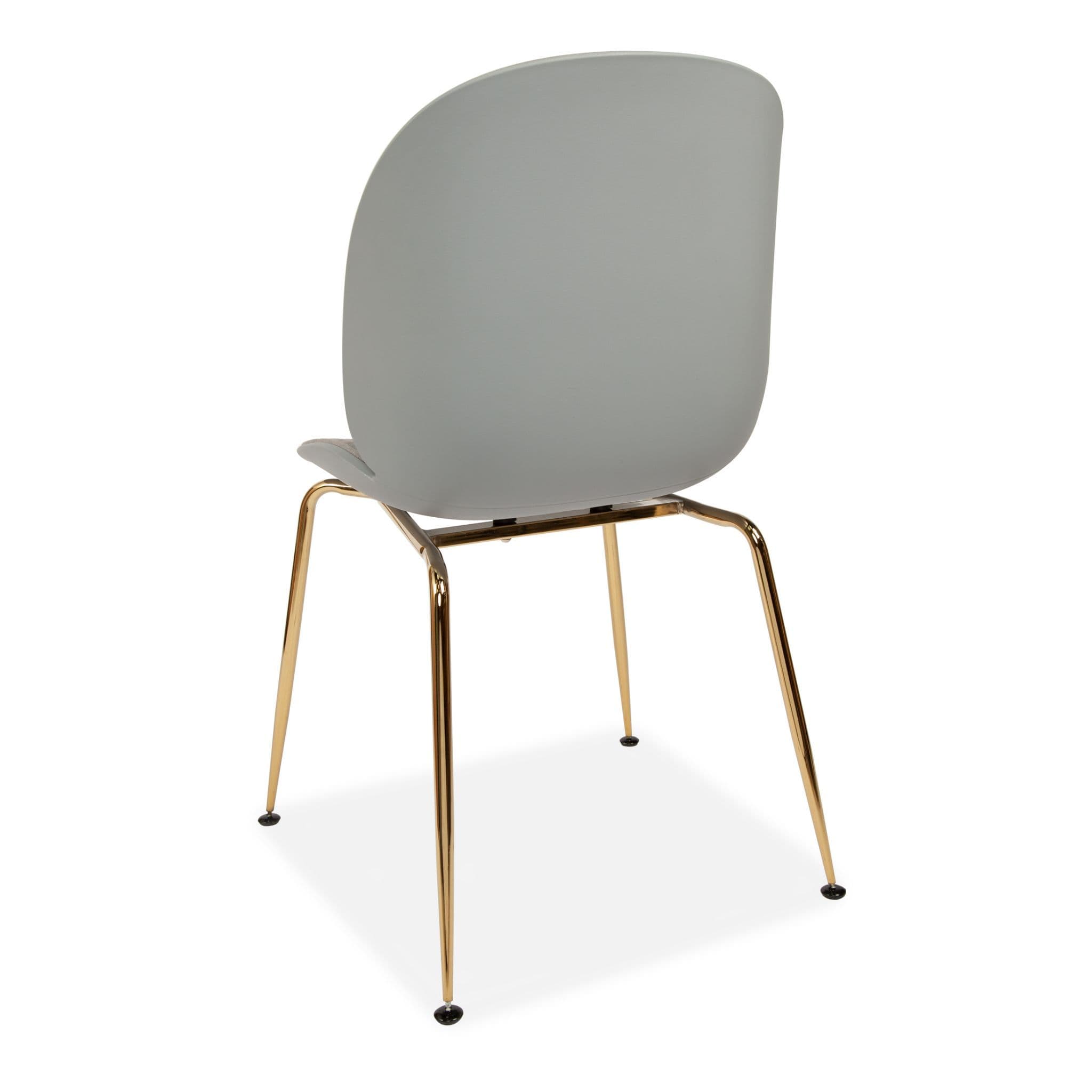 Designer-inspired Beetle dining chair with a half-fabric, half-plastic seat modern, minimalist, and comfortable. Two curved shells echo an insect s form. Elegant gold metal legs. Perfect for dining tables, desks, or occasional seating.