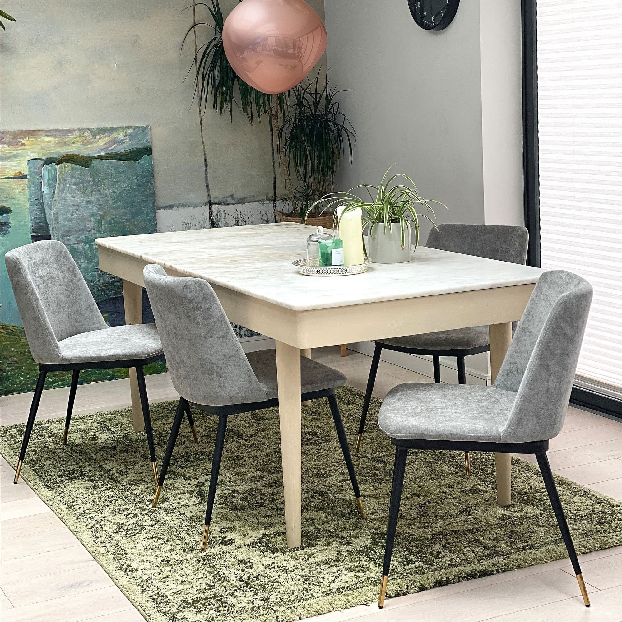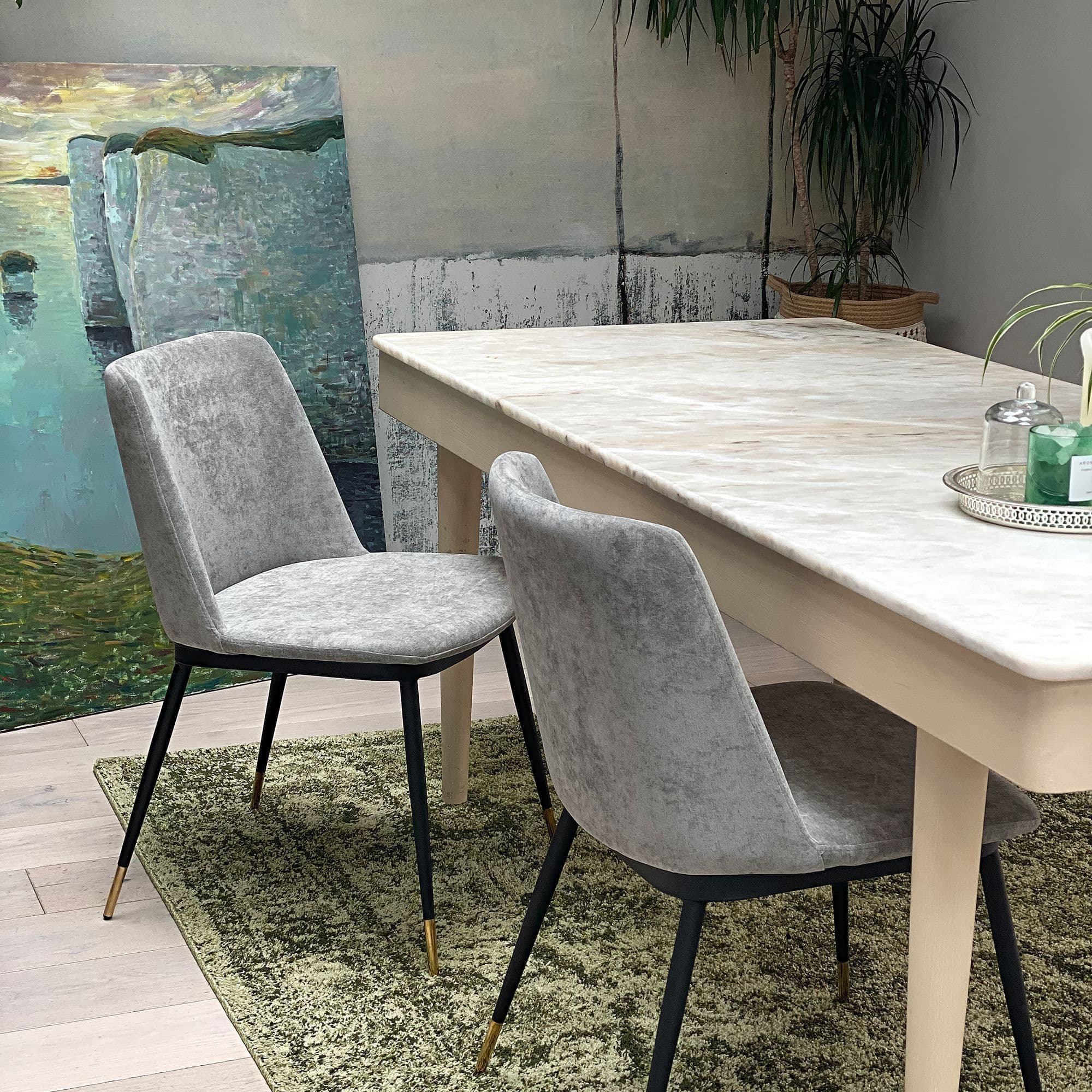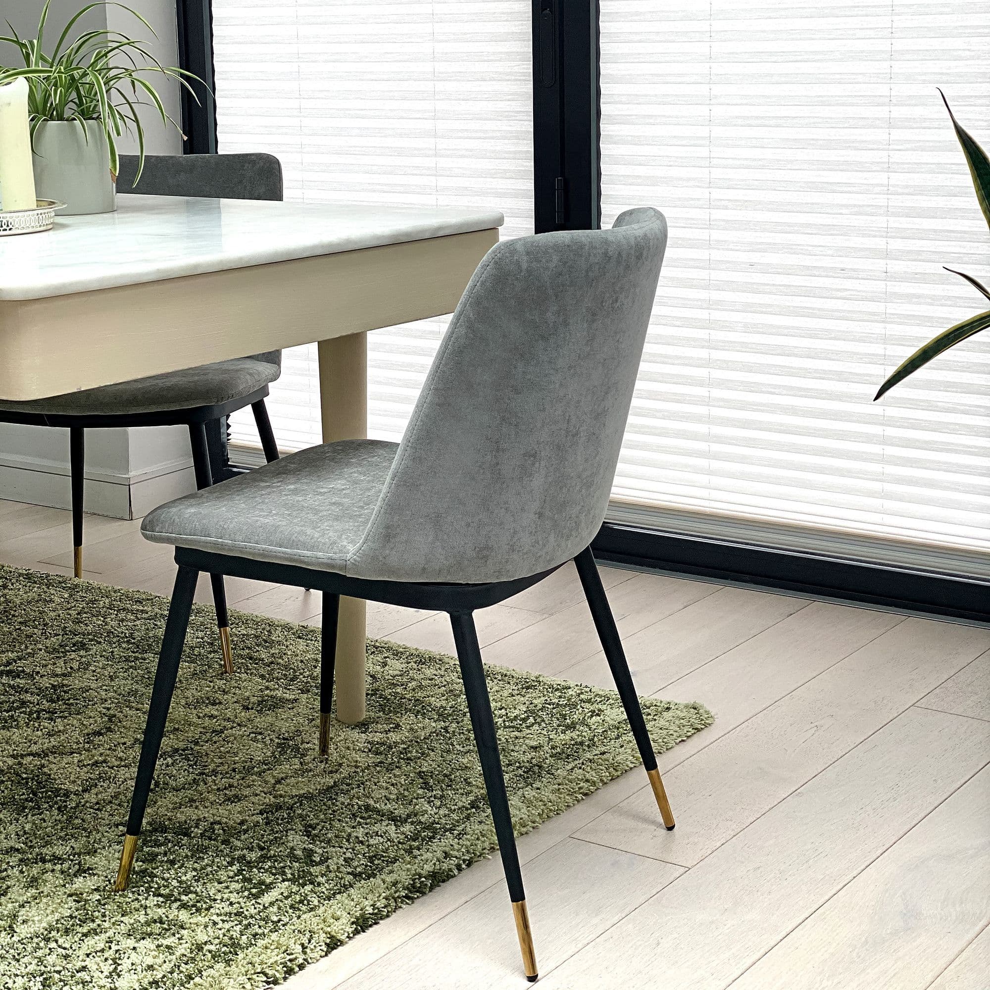This stylish modern dining chair is upholstered in plush grey fabric. Slim black legs with gold-detailed feet complete the look. Cushioned seat and back for comfort perfect for dining tables, desks, or dressing tables.