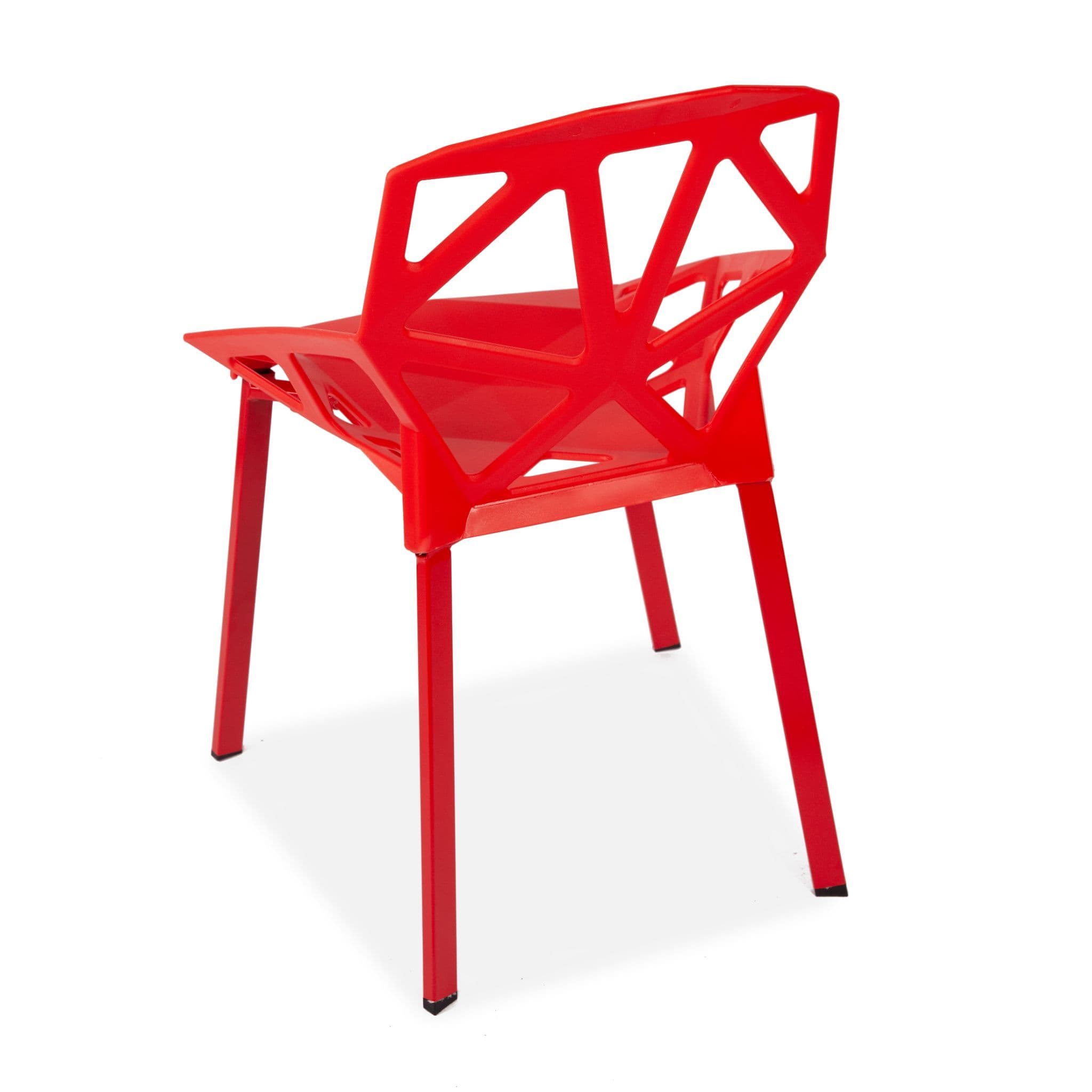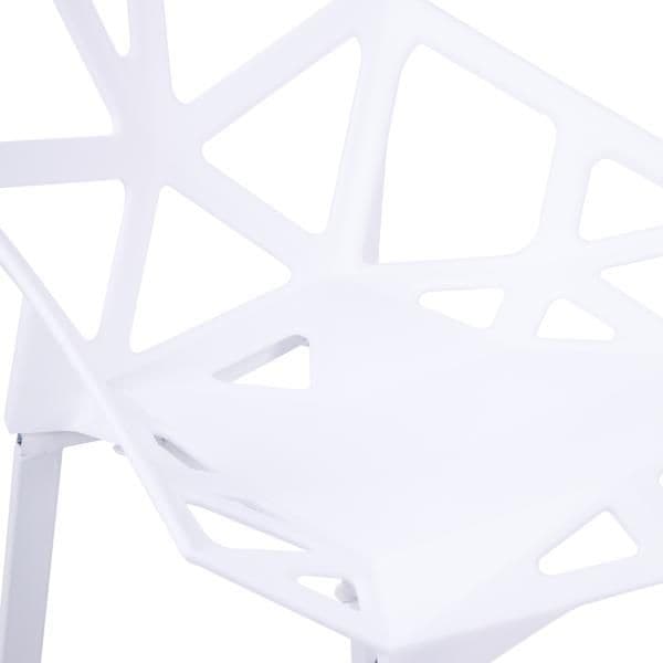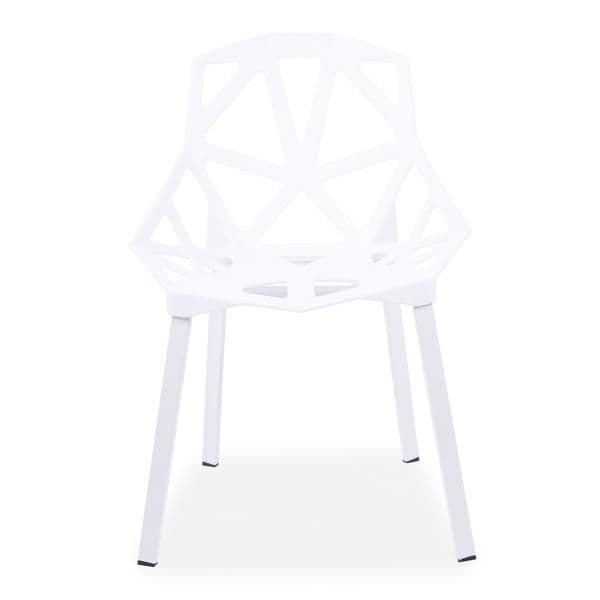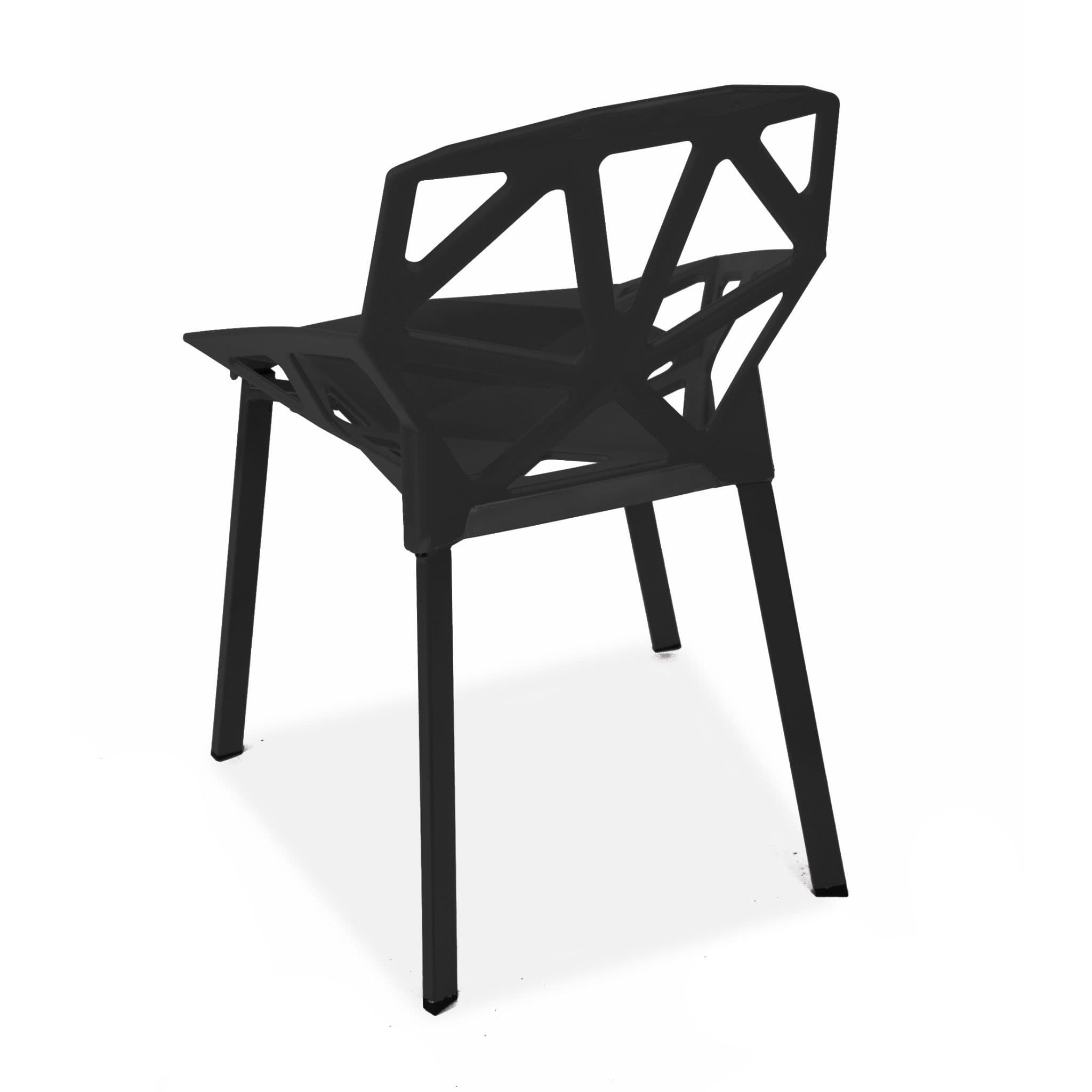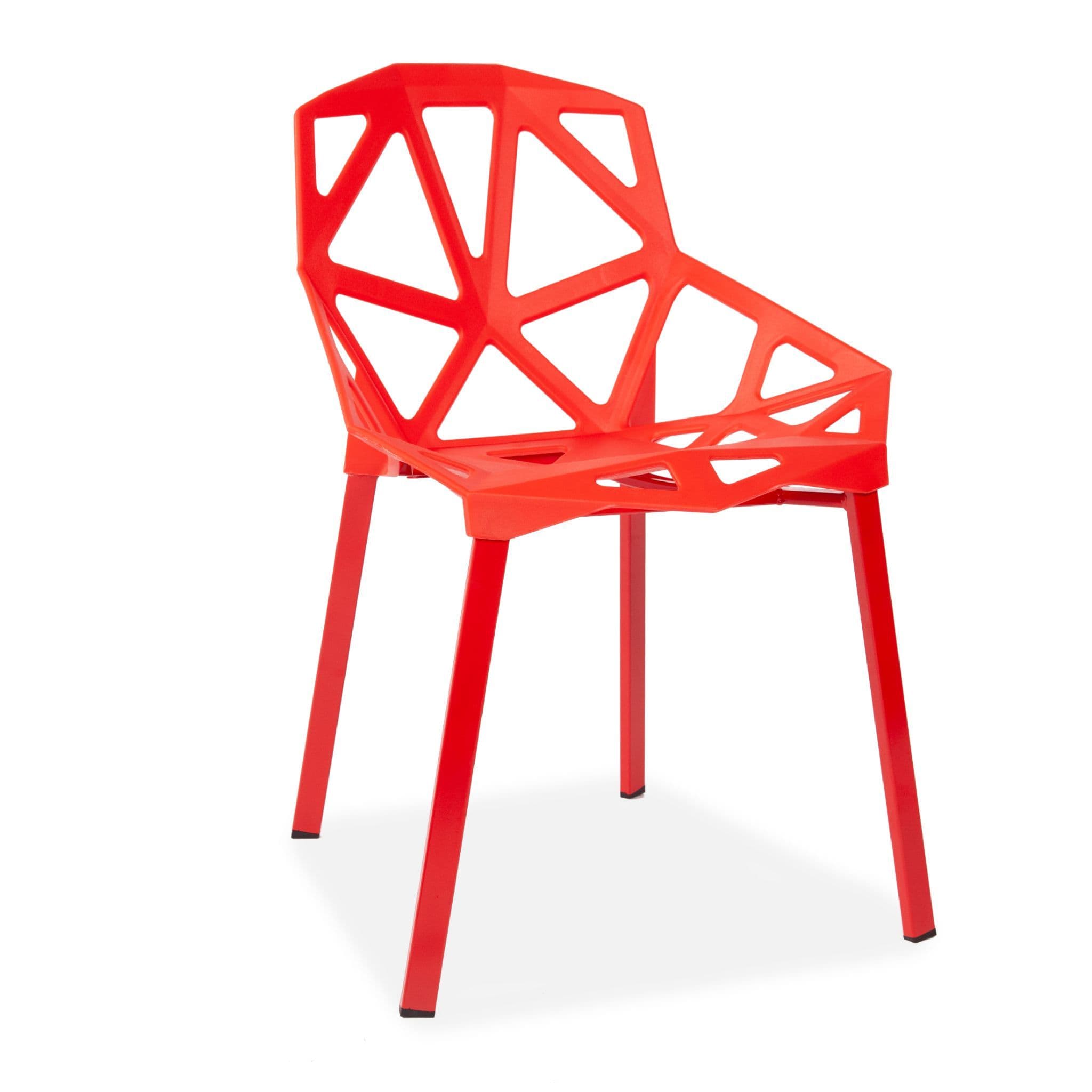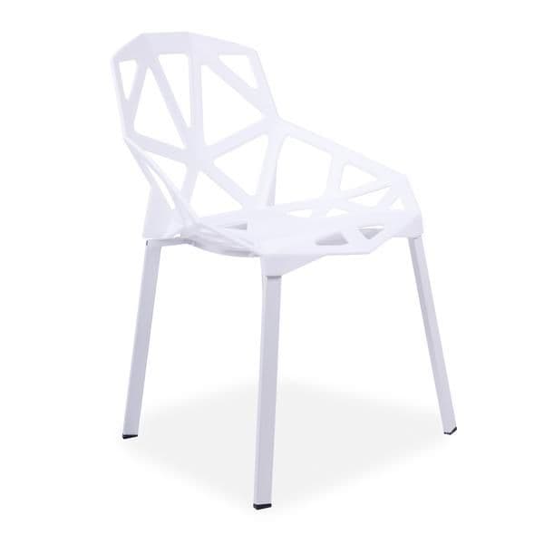 These modern, lightweight cut-out dining chairs are perfect for any interior or garden. The sleek, easy-clean surface keeps its modern look even after prolonged use. Stackable for convenient storage. The plastic seat is supported by sturdy metal legs.
