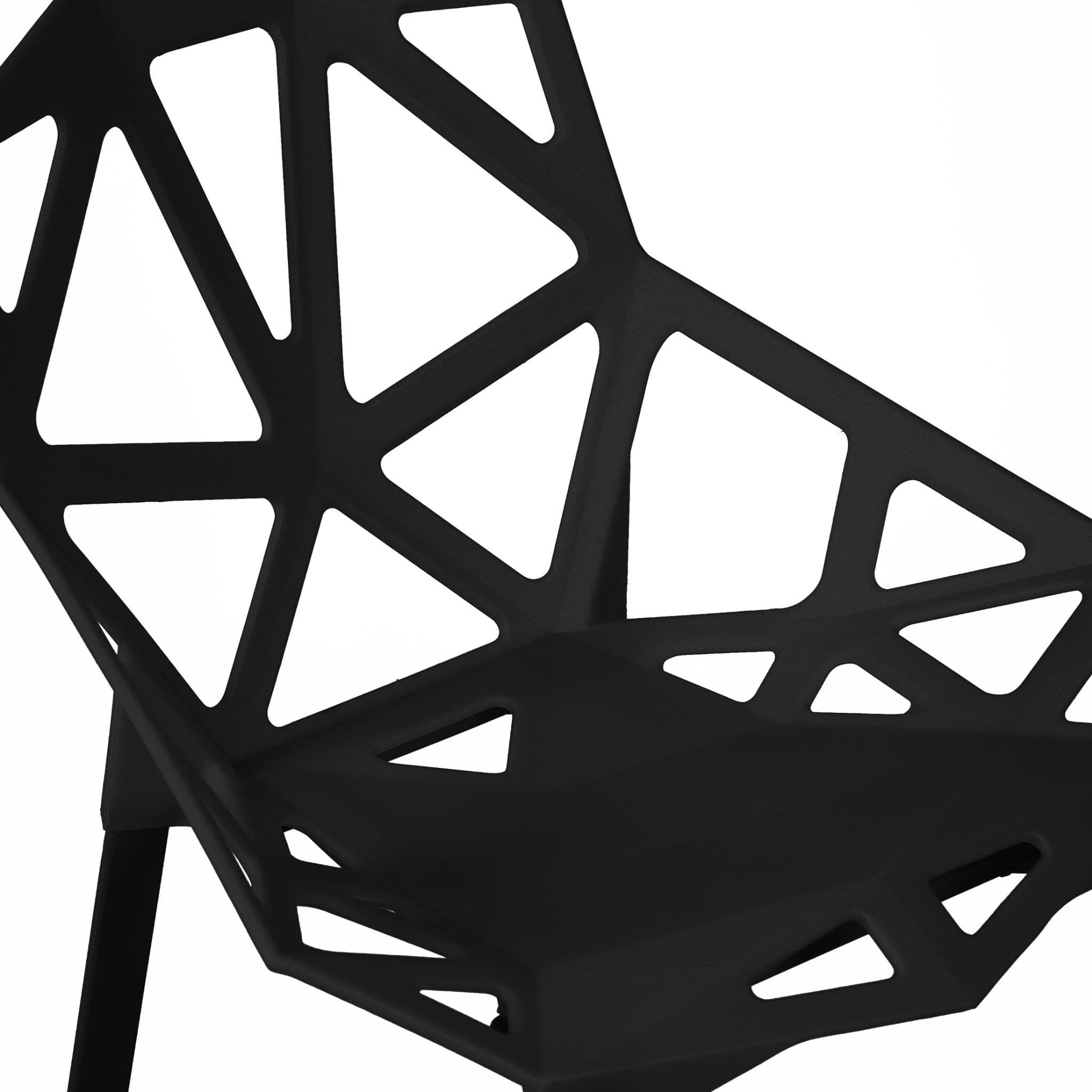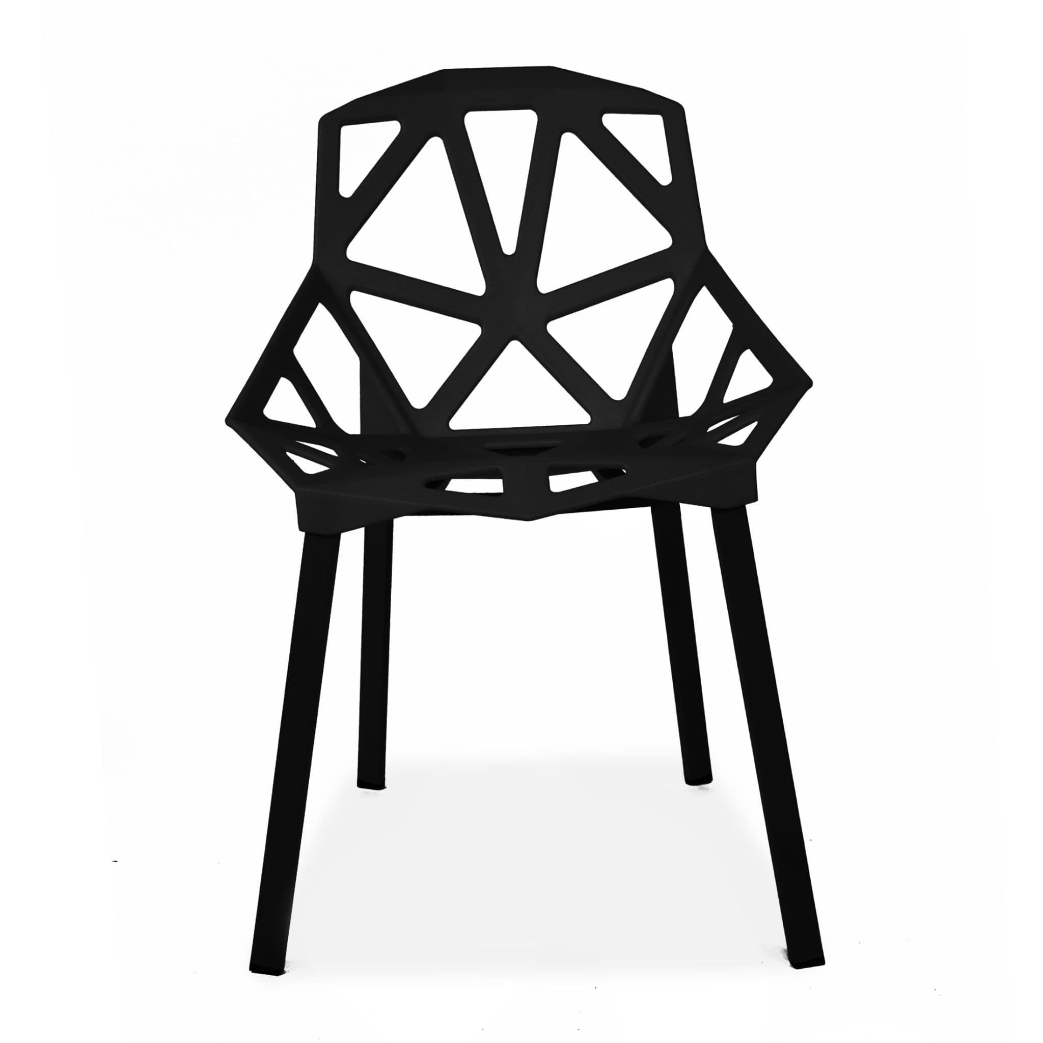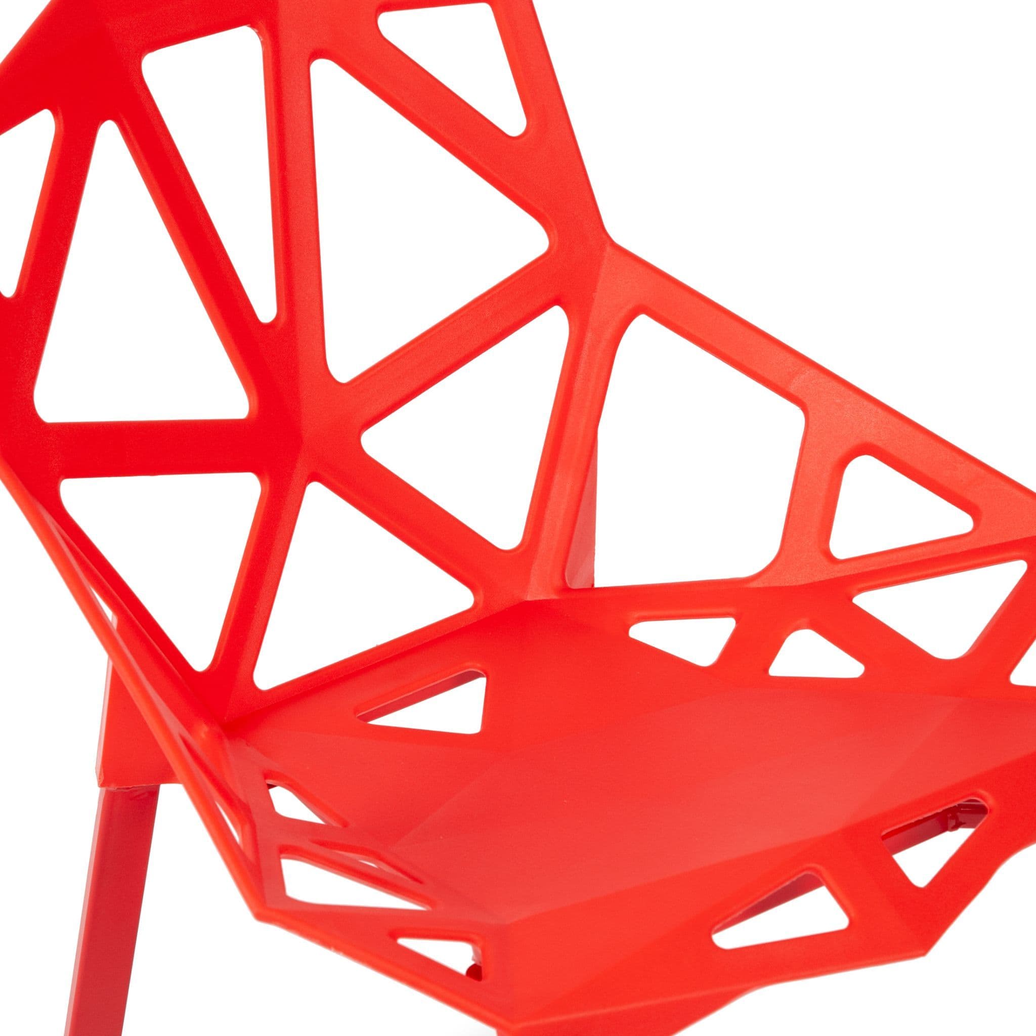 These modern, lightweight cut-out dining chairs are perfect for any interior or garden. The sleek, easy-clean surface keeps its modern look even after prolonged use. Stackable for convenient storage. The plastic seat is supported by sturdy metal legs.
