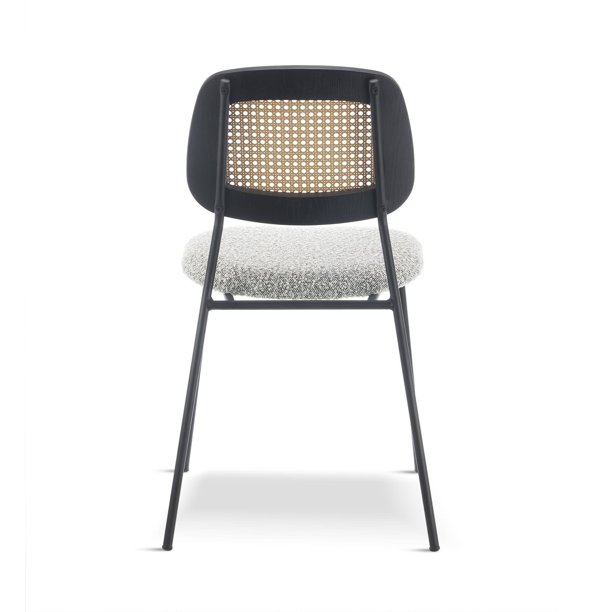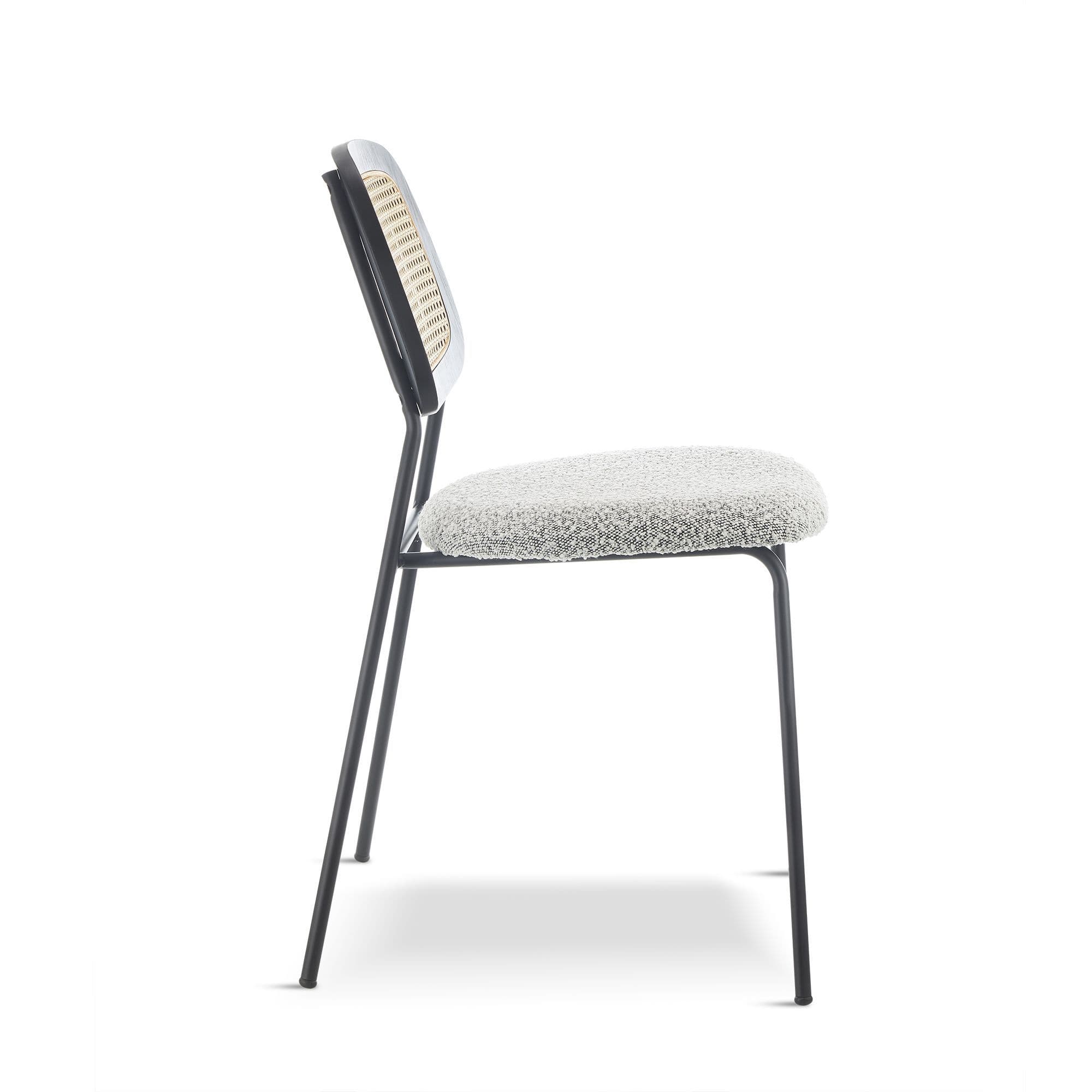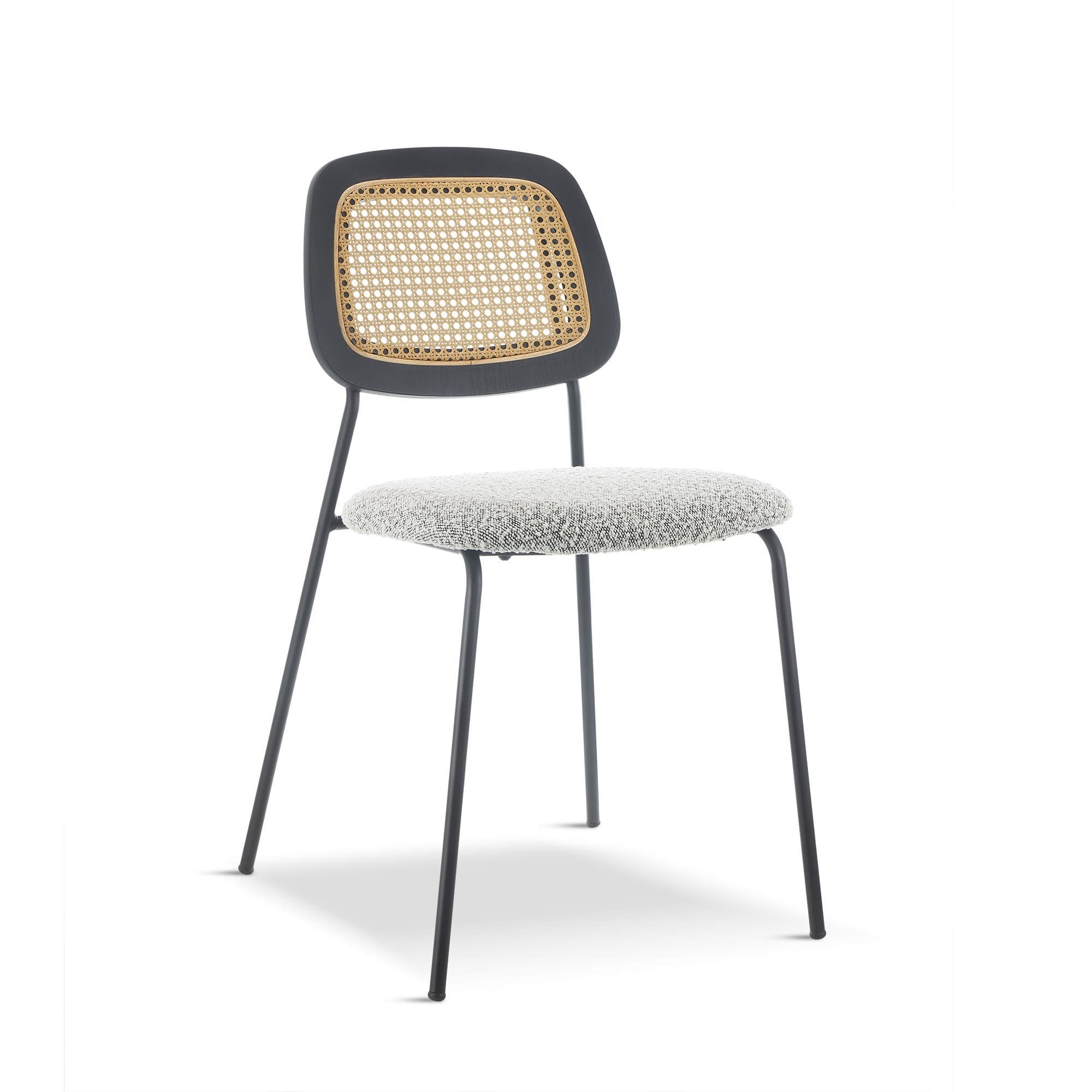 The Lucy upholstered chair combines elegance and comfort in its design It features a tubular metal structure with a black paint finish ensuring durability and a timeless aesthetic The chairs seat is upholstered in boucle textile material adding extra user comfort A wooden backrest adds a touch of charm to the chairs overall design The chair also incorporates rattan cane type cannage enhancing its visual appeal.