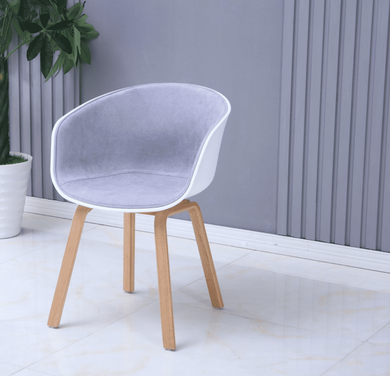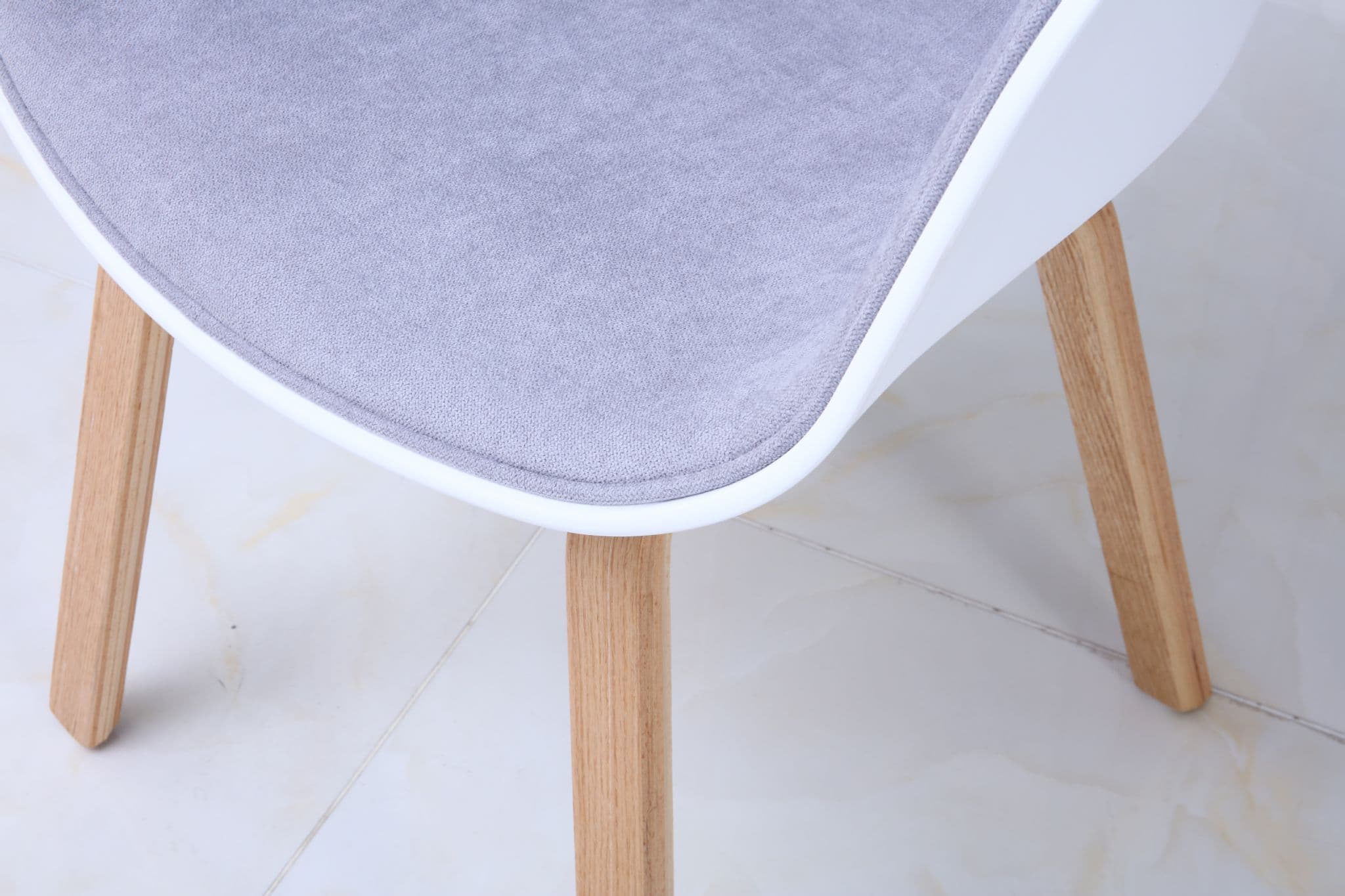 This Modern Design would sit at home with lots of interiors style with your modern dining table Suitable for cosy bedroom and nice living room The white back seat with fabric seat is supported by geometric beech legs.