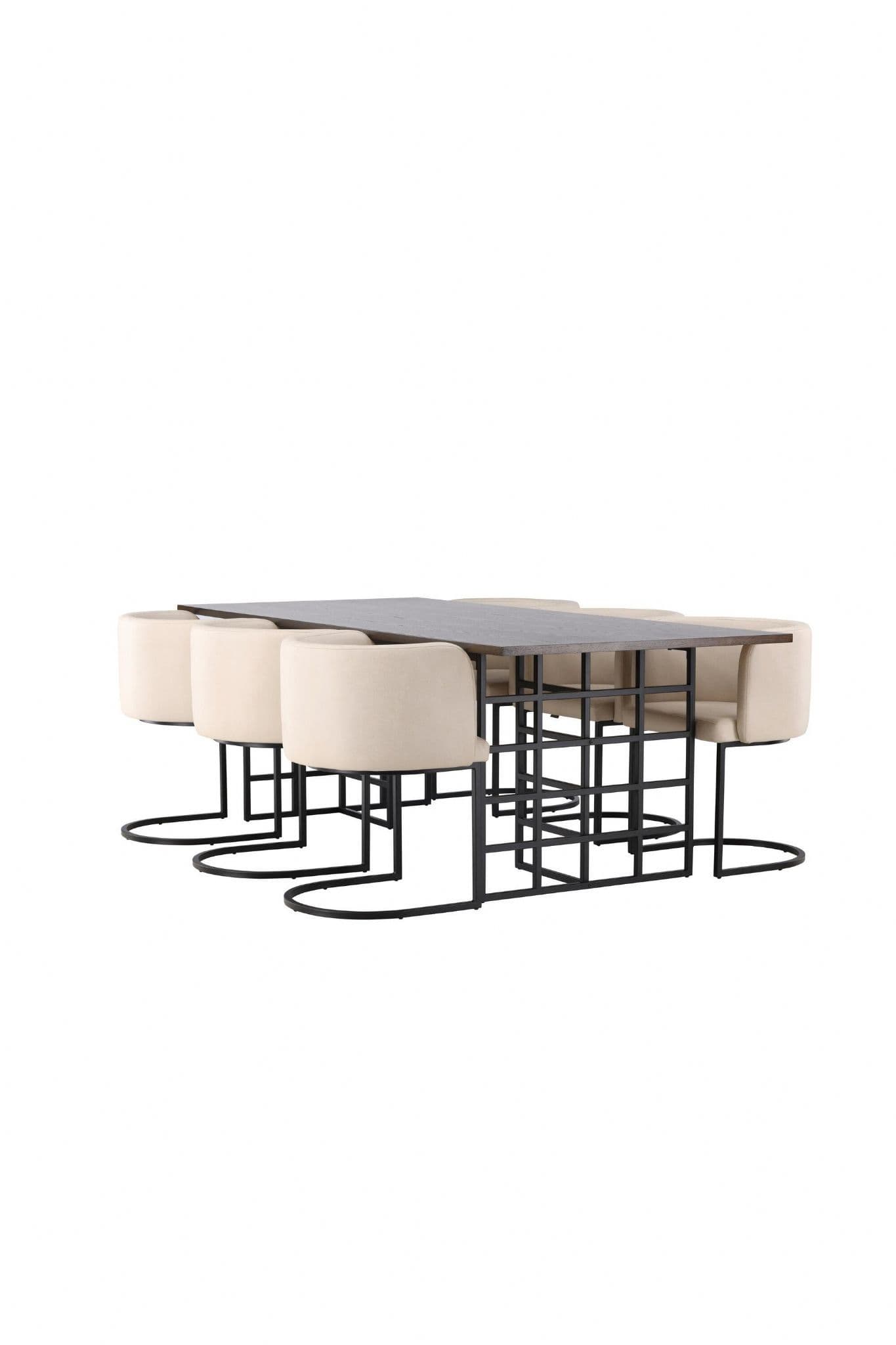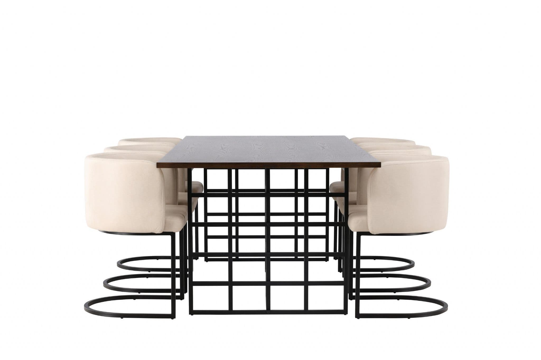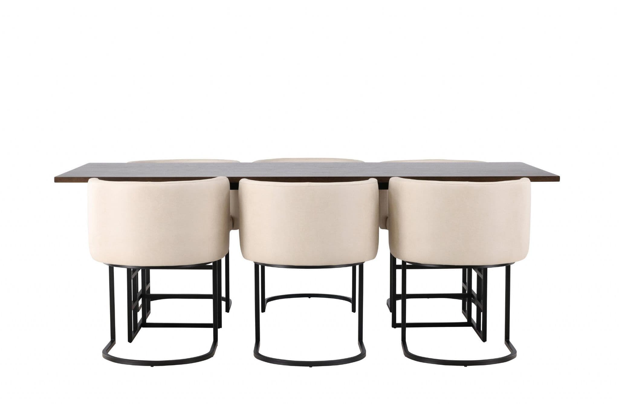 A luxurious dining set in an industrial style and modern design might be just what your living room needs to give it a trendy lift Our rectangular dining table from the Ystad series with its industrial design becomes a great centerpiece in the heart of your home The table features a rustic dark brown MDF tabletop with oak veneer But what truly deserves praise for the table are the two decorative black metal bases with their industrial design These details give the dining table a modern touch that truly stands out The dimensions of the table are 100x220cm Here paired with our magnificent dining chairs from the Simrishamn series This chair is as comfortable as it is stylish and will create a luxurious atmosphere around your dining table The fully upholstered seat and the rounded backrest in beige TC fabric give a sense of luxury and elegance Its minimalist black steel frame perfectly complements the industrial design of the dining table With this stylish dining set you will feel like a trendsetter and your dining room will become the best gathering place for all social meals.